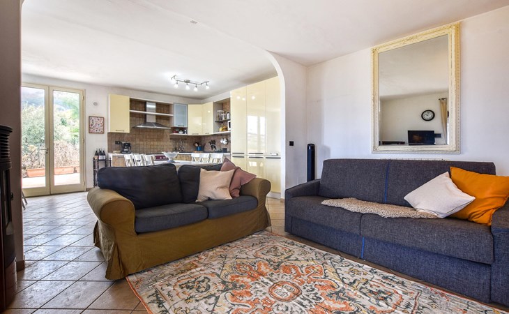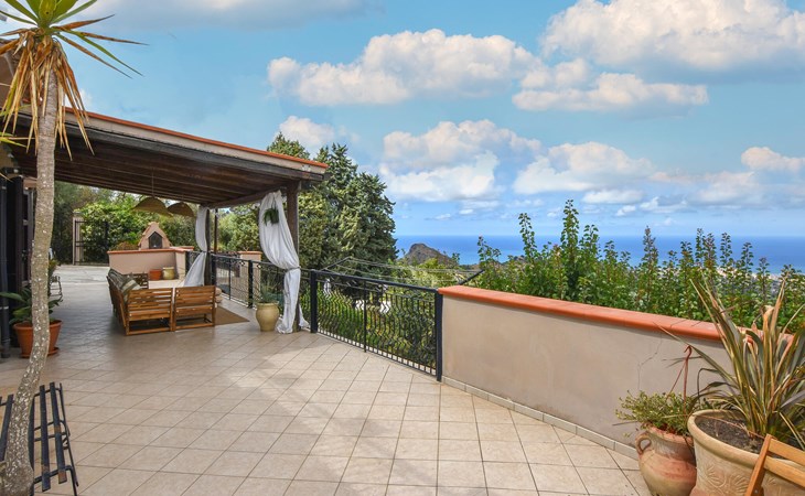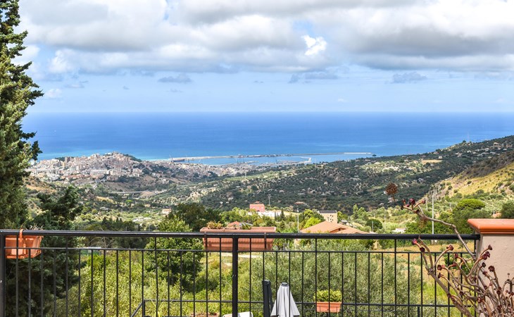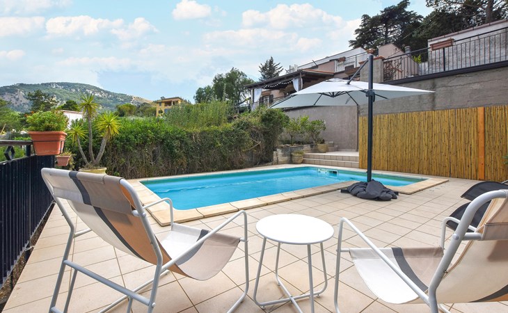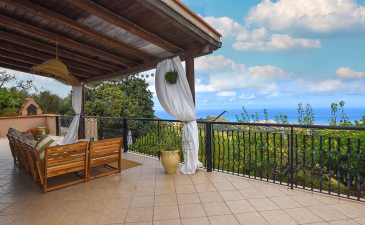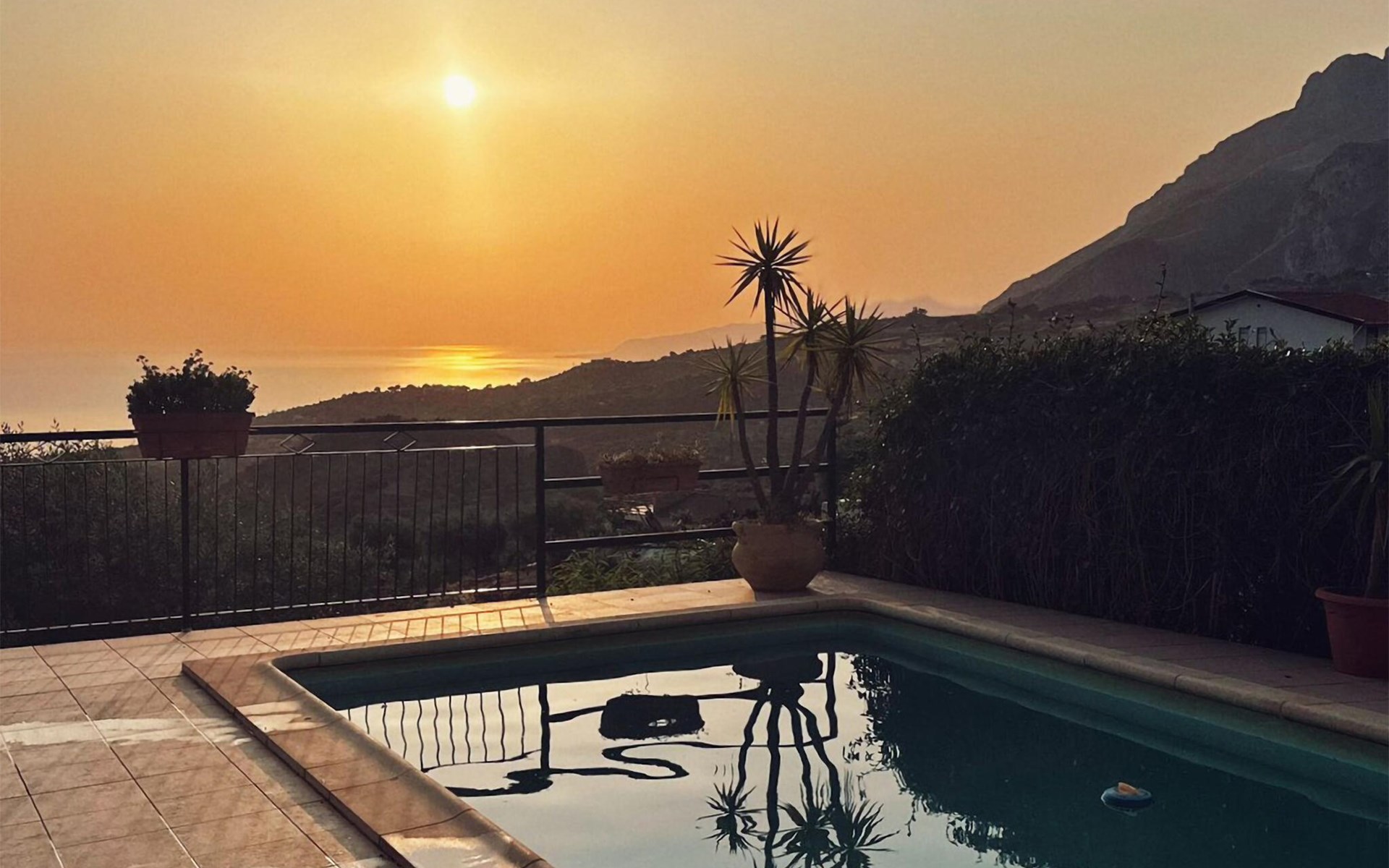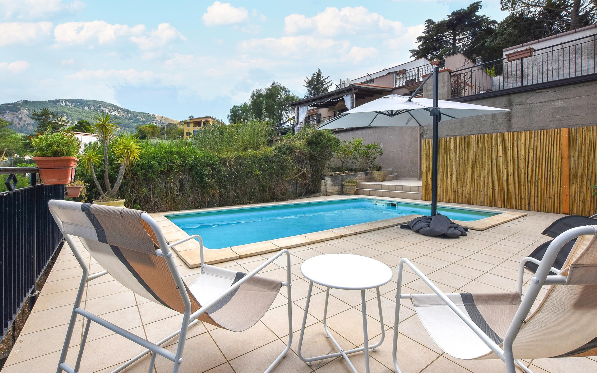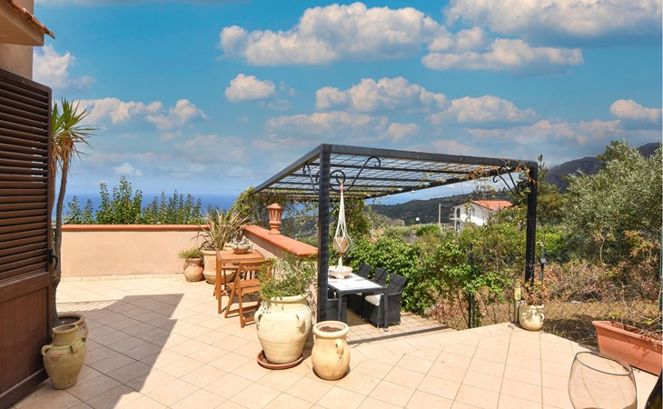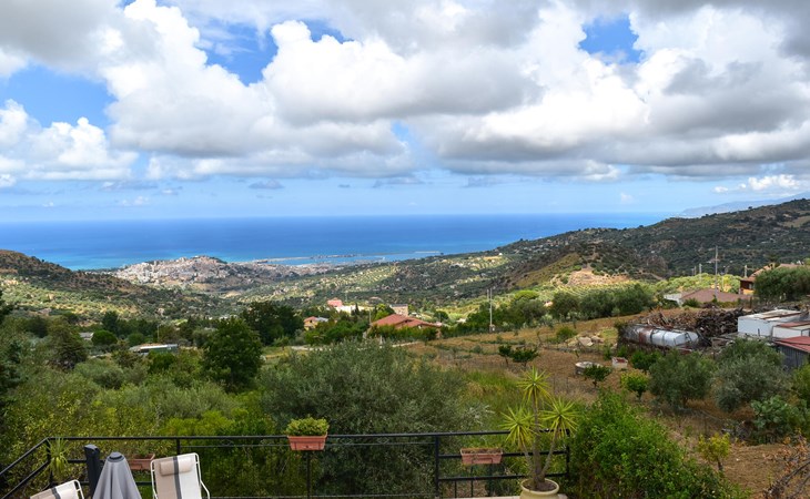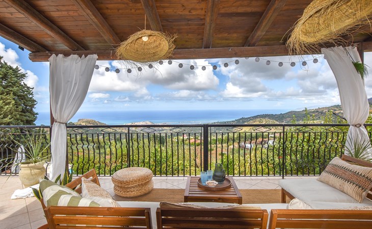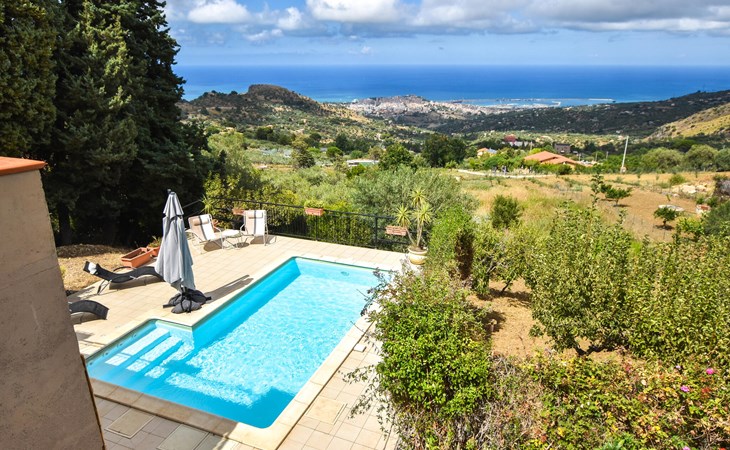 Genießen Sie in diesem komfortablen Ferienhaus mit Pool einen wunderschönen Panoramablick bis zum Meer.