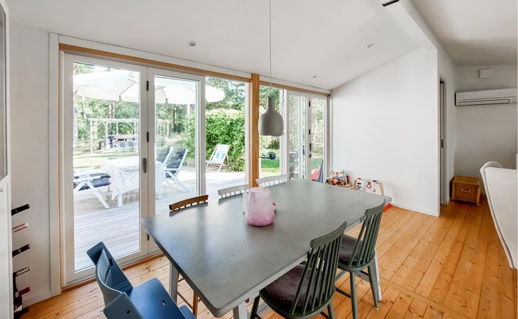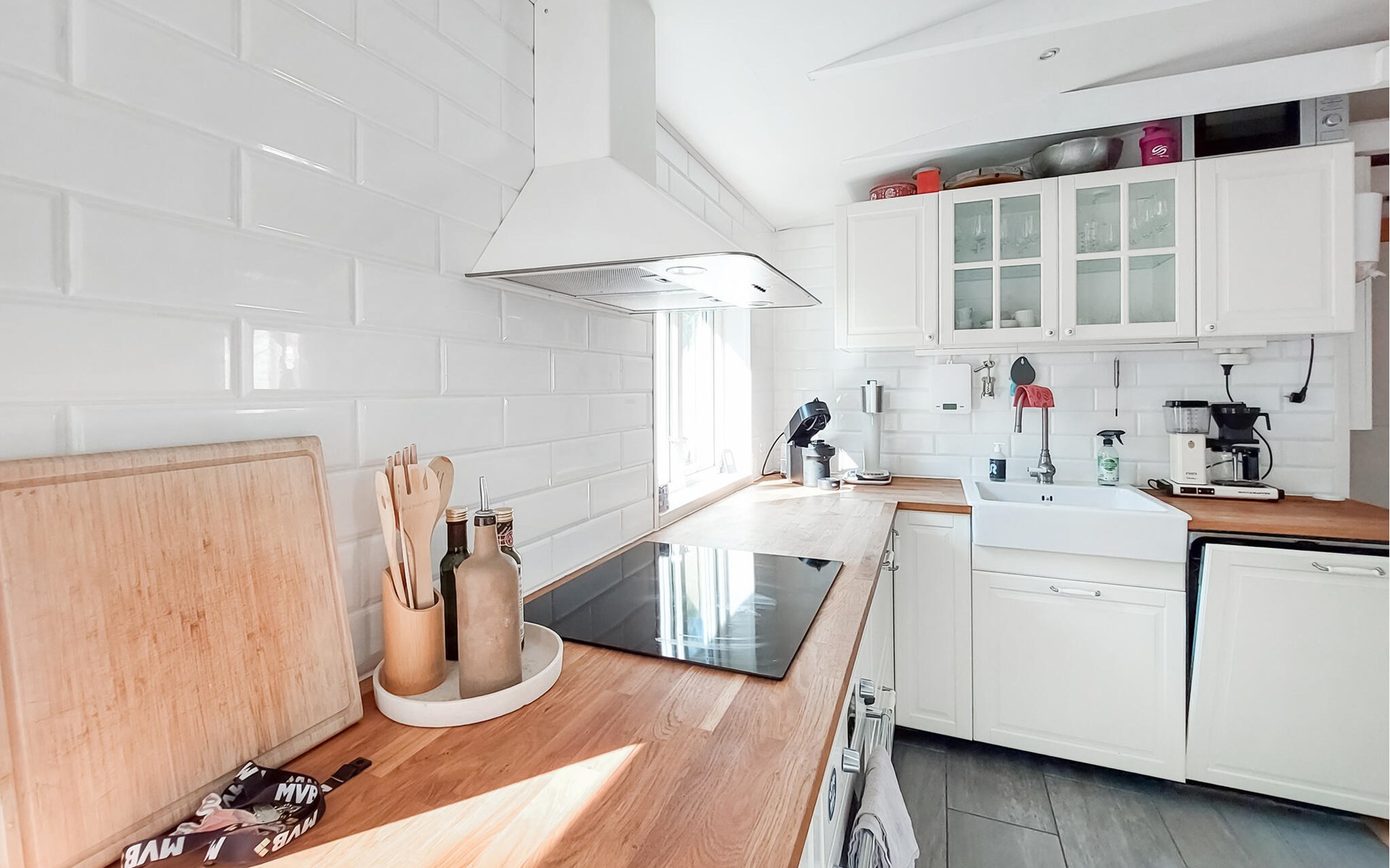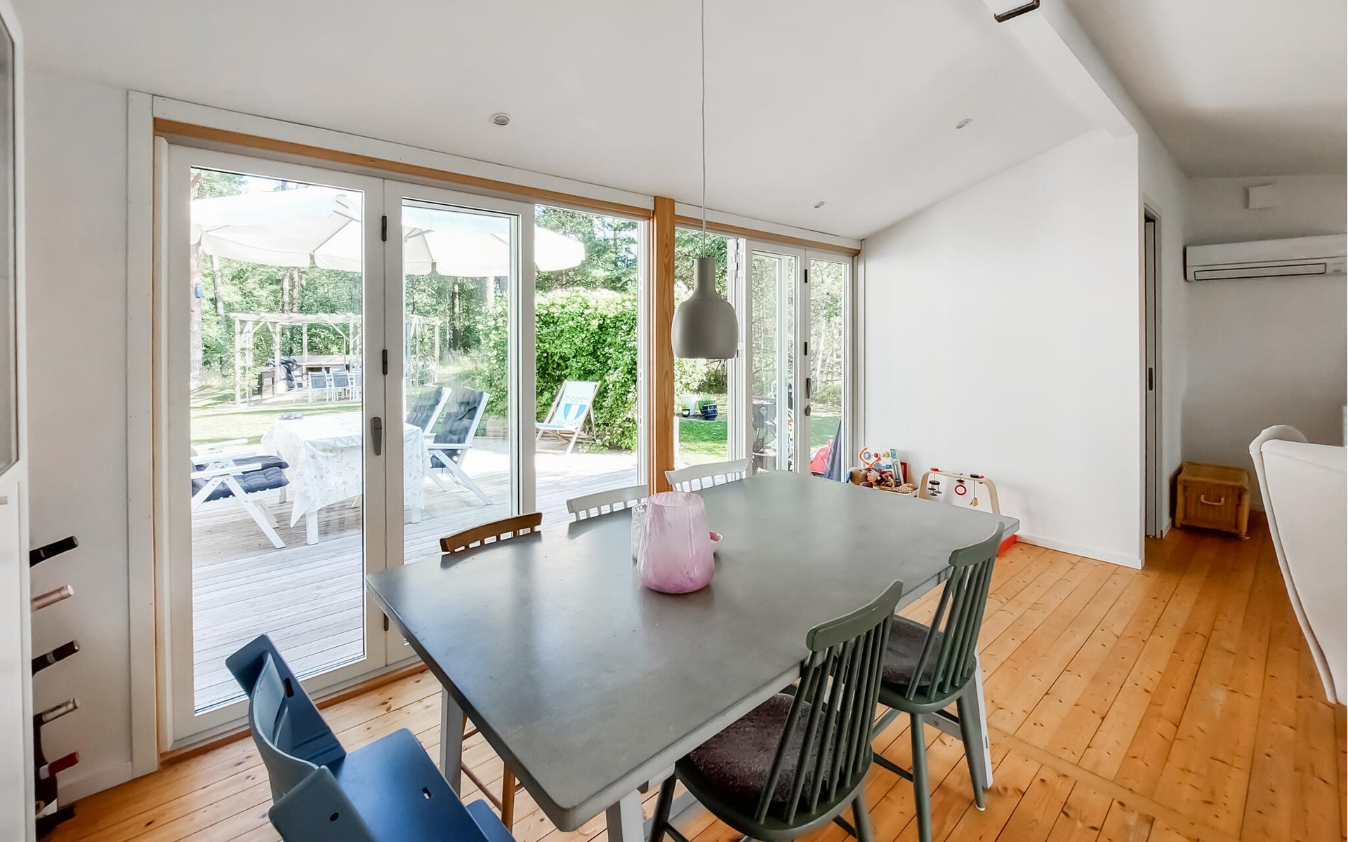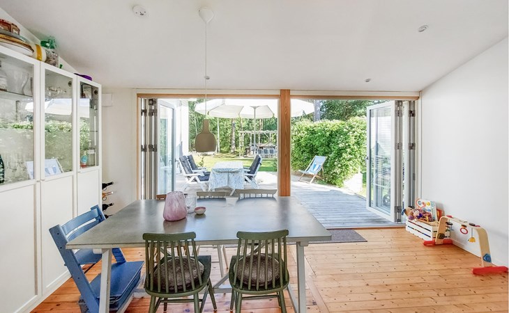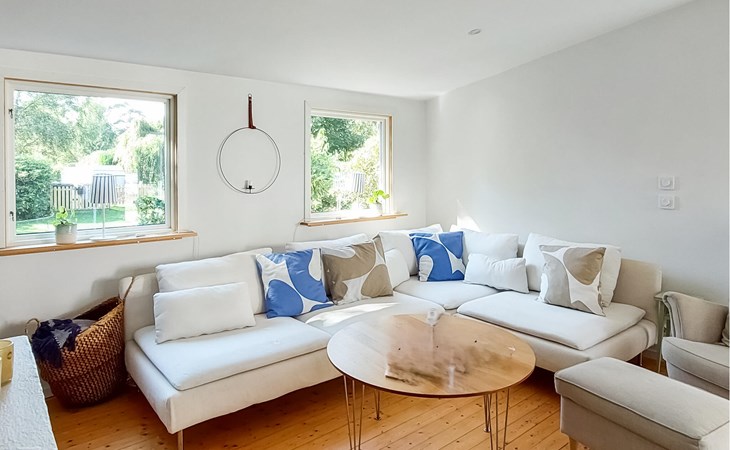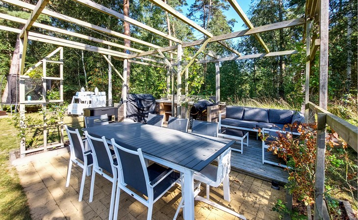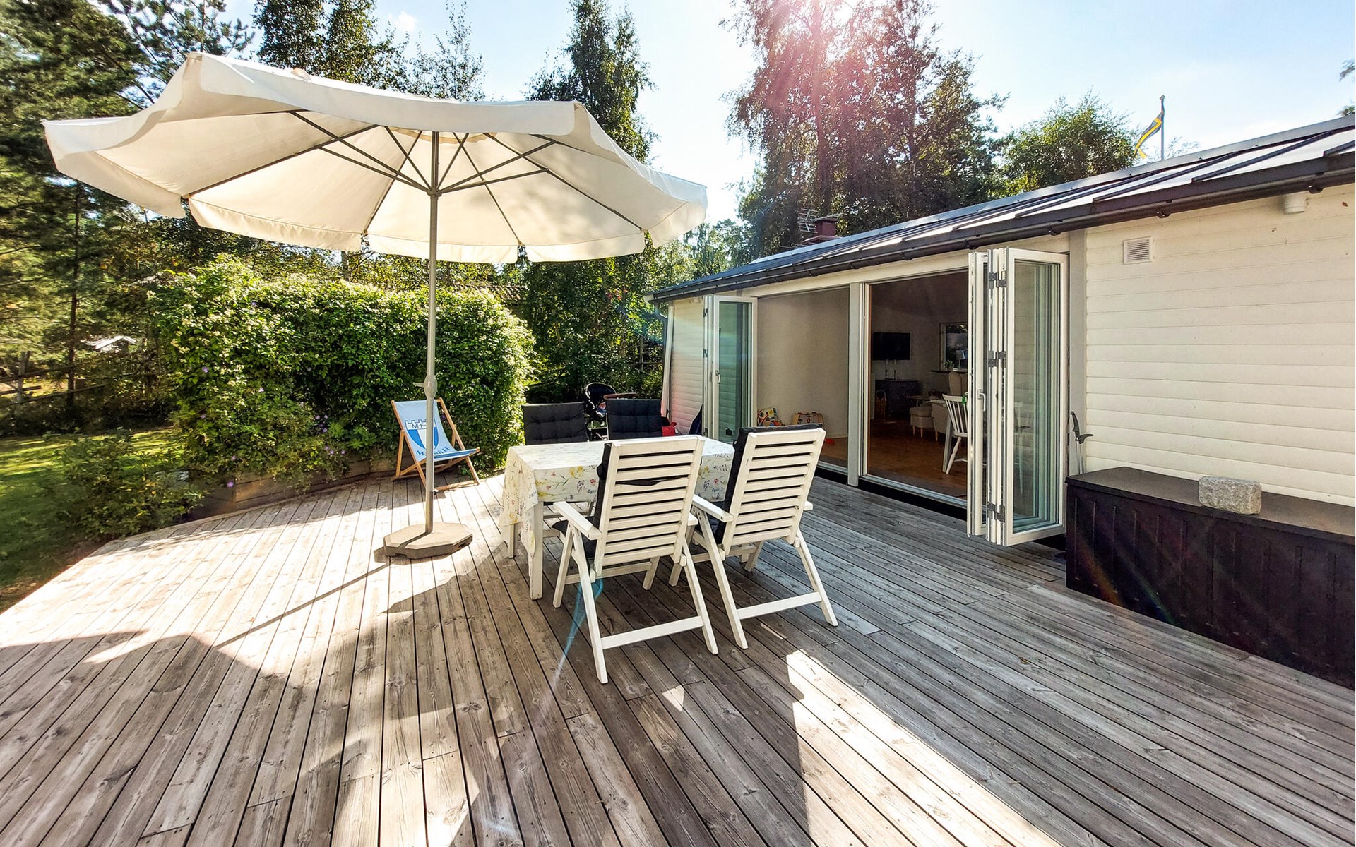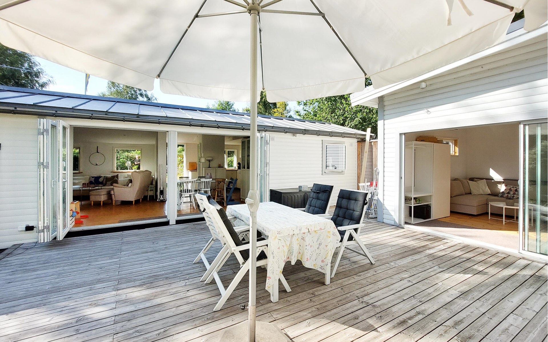 Willkommen in Ihrem Ferienhaus in Mellbystrand, dem idealen Ort für Erholung und gemeinsame Zeit mit der Familie. Genießen Sie sonnige Tage auf der großzügigen Terrasse, die mit bequemen Sitzmöbeln und einem großen Esstisch zum Verweilen einlädt. Das helle Wohnzimmer mit der gemütlichen Sofalandschaft und dem Kaminofen ist der ideale Ort, um den Tag in ruhiger Atmosphäre ausklingen zu lassen. Große Fenster lassen viel Licht herein und bieten Ihnen stets einen schönen Blick ins Grüne. Die gut ausgestattete Küche ermöglicht es Ihnen, Ihre Lieblingsgerichte zuzubereiten und dabei die Gesellschaft Ihrer Lieben zu genießen.