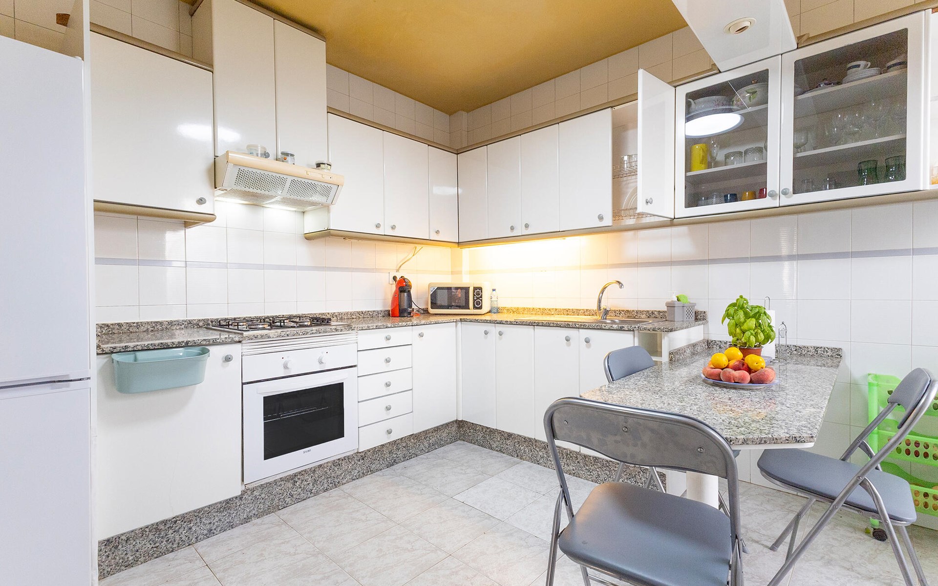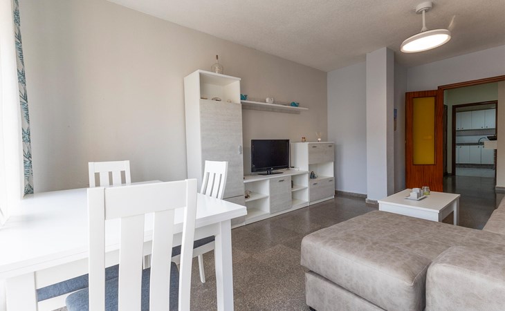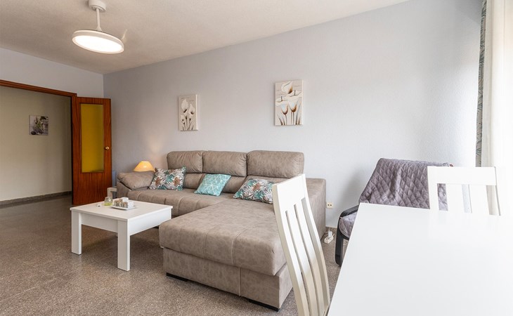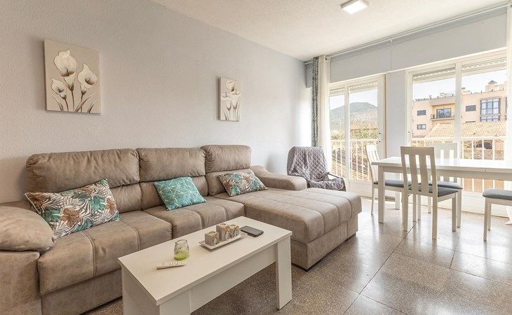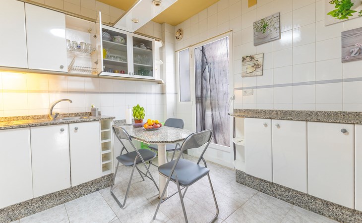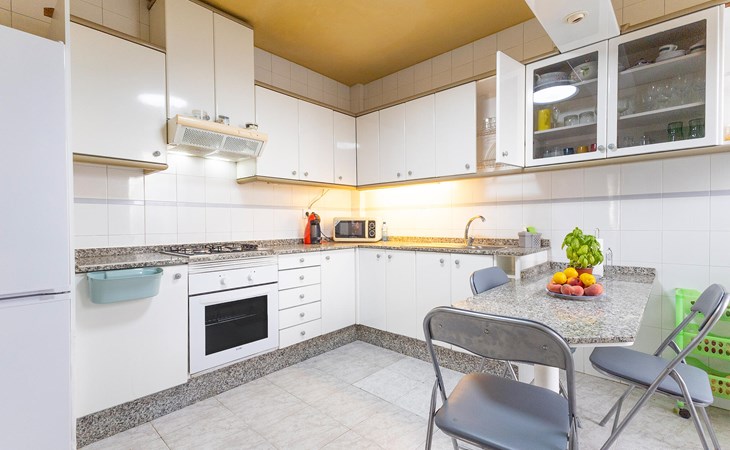 In diesem Ferienhaus wohnen Sie nahe am Meer und zugleich in einem charmanten Ort mit typisch spanischem Flair. Im hellen Wohnzimmer lädt das große Sofa zu entspannten Stunden ein. Nutzen Sie den modernen TV-Bereich für einen gemütlichen Filmabend oder verbringen Sie gesellige Runden am Esstisch mit Blick auf die Terrasse. Bereiten Sie in der Küche köstliche Mahlzeiten zu. Mit großzügigen Arbeitsflächen, Esstisch und allen wichtigen Geräten finden Sie hier die idealen Voraussetzungen für gemeinsame Kochmomente.