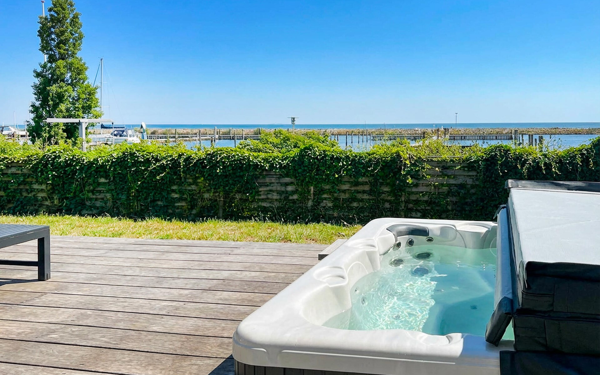 Genießen Sie in diesem Ferienhaus maritime Urlaubstage mit Panoramablick auf Jachthafen und Meer.