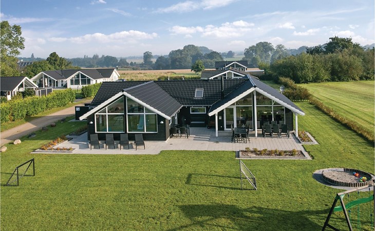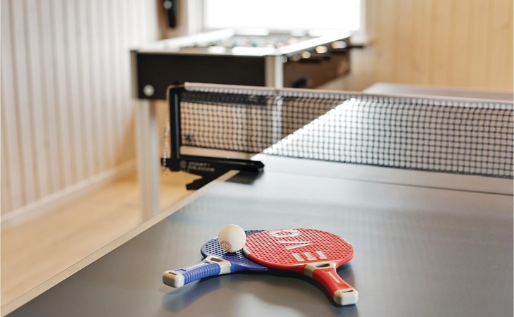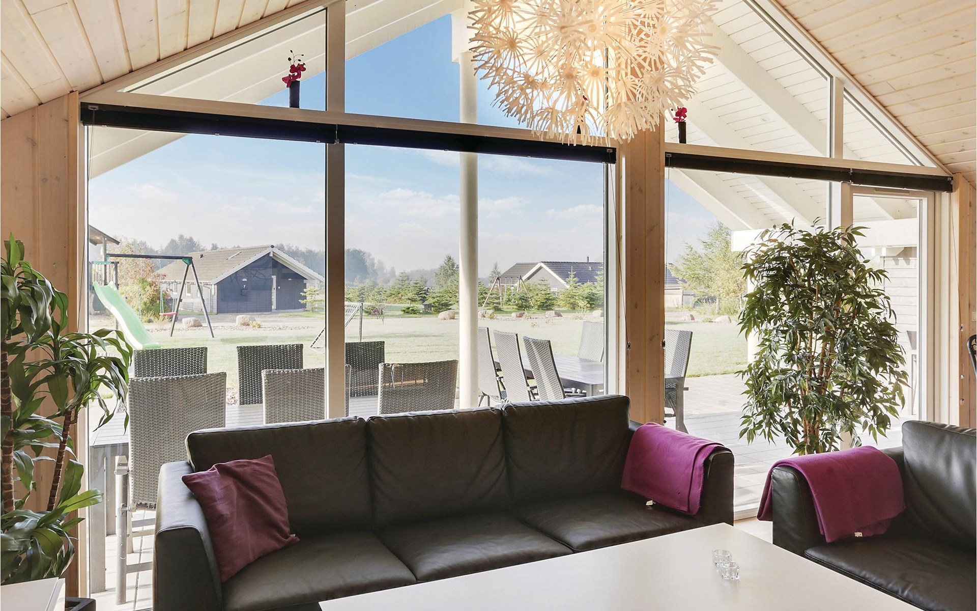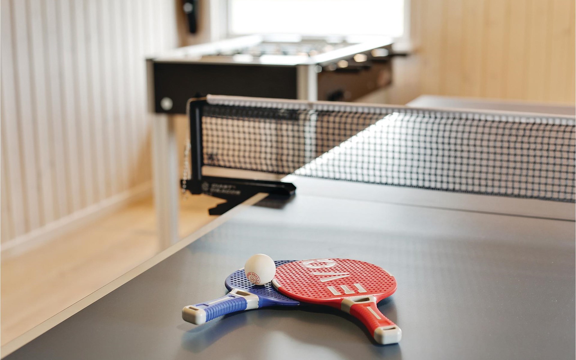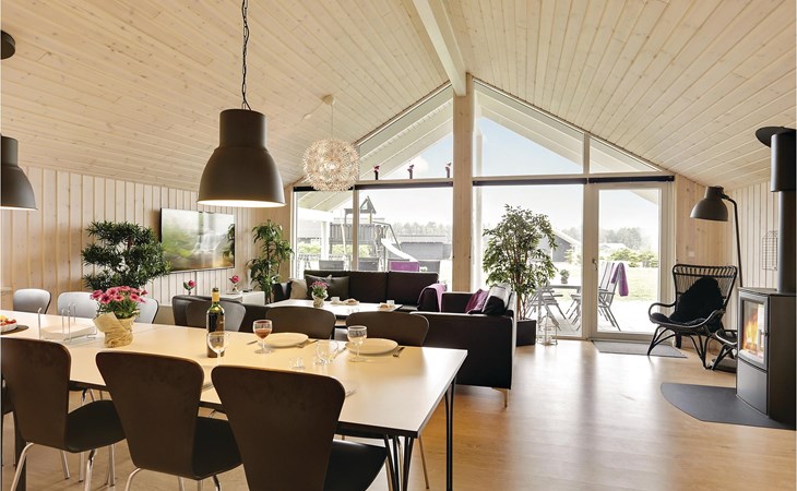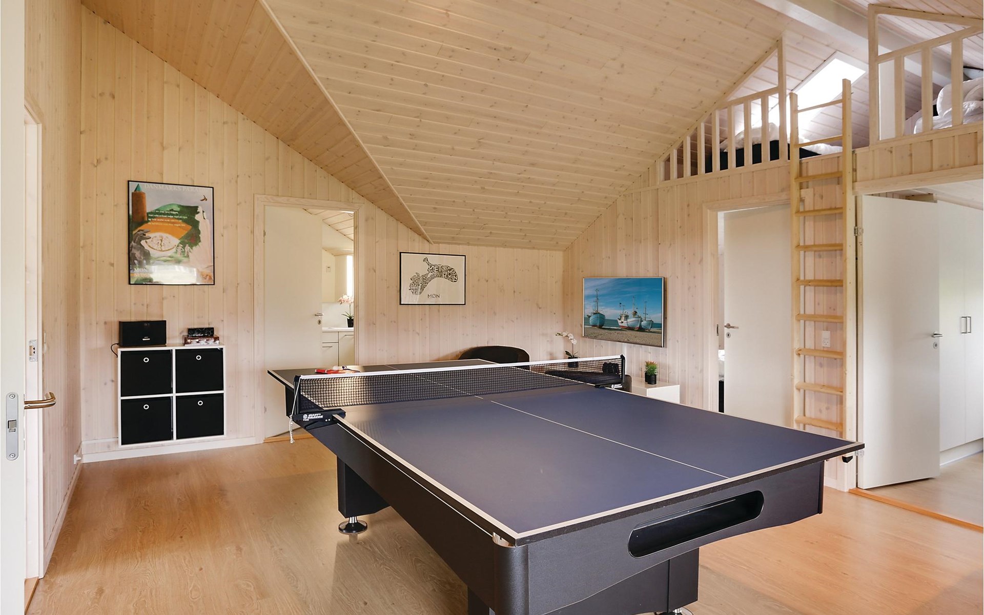 Erleben Sie eine entspannte Auszeit an der Hjelm Bucht. Dieses großzügige Ferienhaus bietet den idealen Rahmen für gemeinsame Urlaubstage mit der Familie oder Freunden, umgeben von Natur und nicht weit vom kinderfreundlichen Strand entfernt. Treten Sie ein in das helle Haus mit seiner offenen Architektur und den großen Fensterfronten. Kochen Sie gemeinsam in der gut ausgestatteten Küche, servieren Sie Ihre Mahlzeiten am langen Esstisch und lassen Sie den Blick durch die hohen Fenster schweifen. Machen Sie es sich in der Sofaecke gemütlich oder genießen Sie am Kaminofen ruhige Abende. Für Unterhaltung sorgen Tischtennisplatte, Billardtisch und Tischkicker im Aktivitätsraum. Ein weiteres Highlight ist der hauseigene Wellnessbereich mit Pool und Wasserrutsche sowie Whirlpool und Sauna für entspannte Stunden.