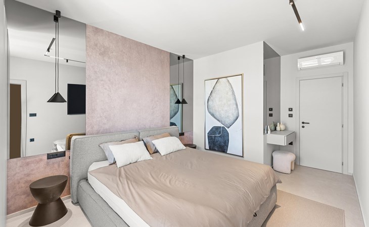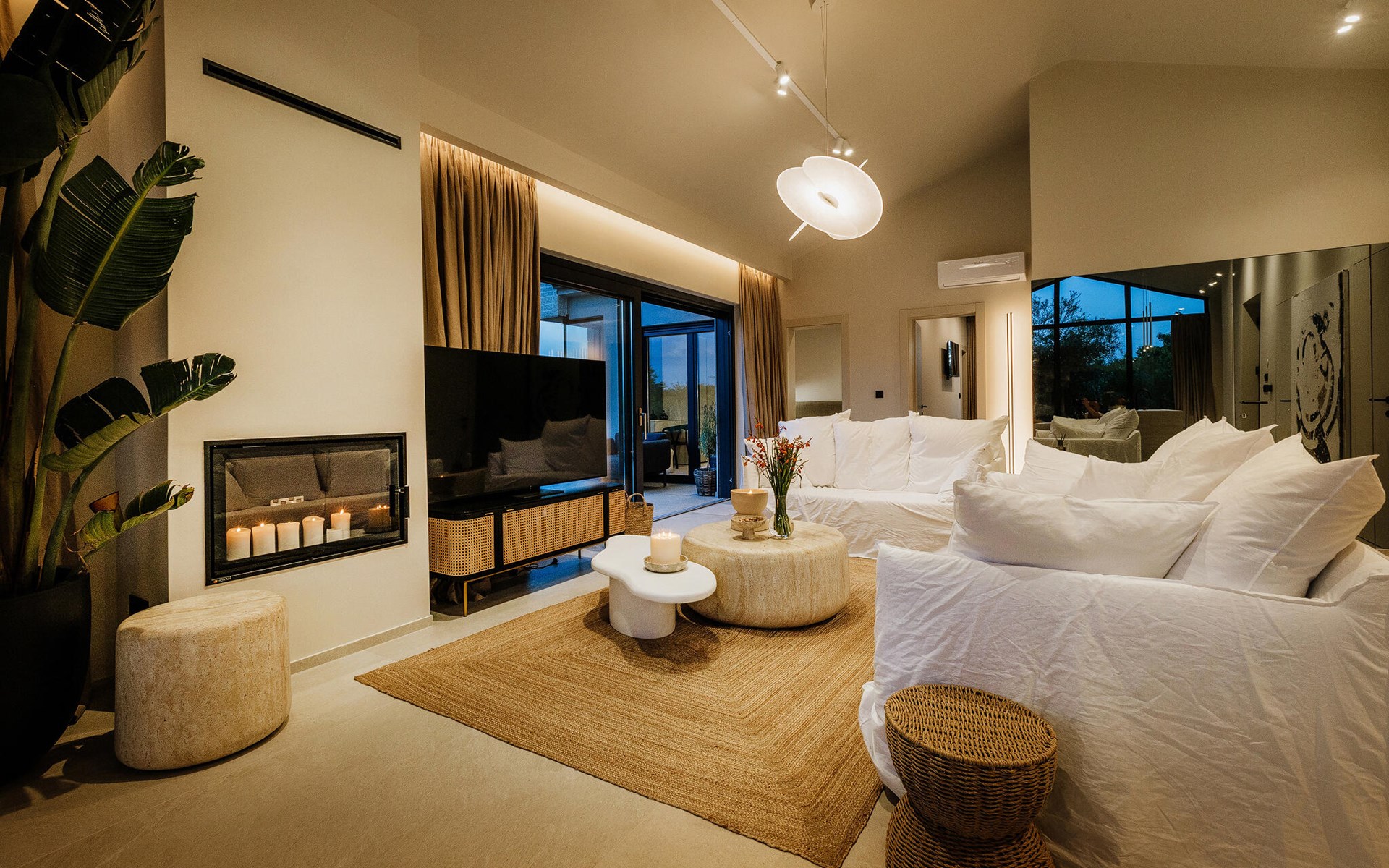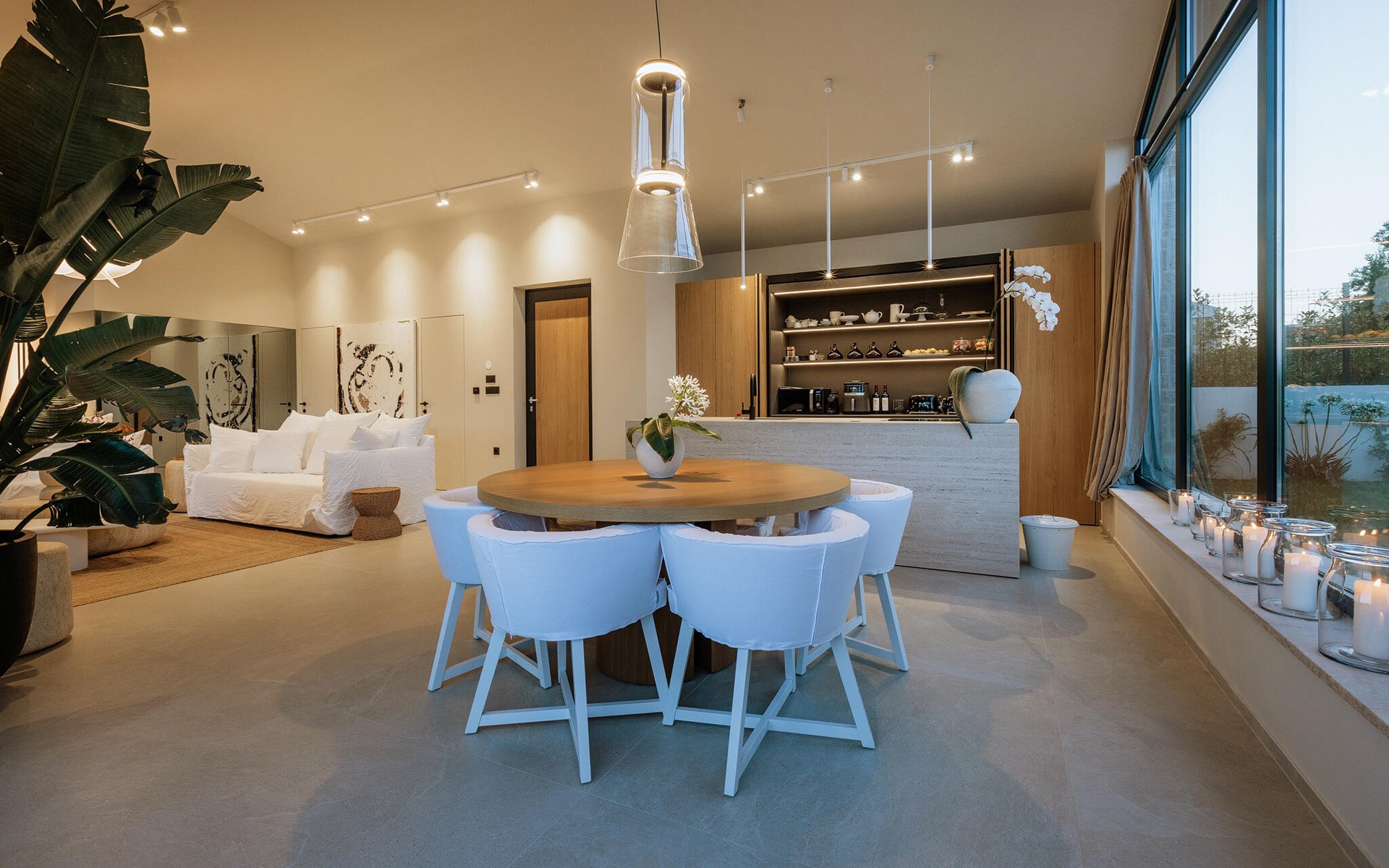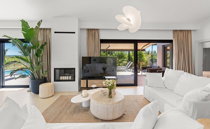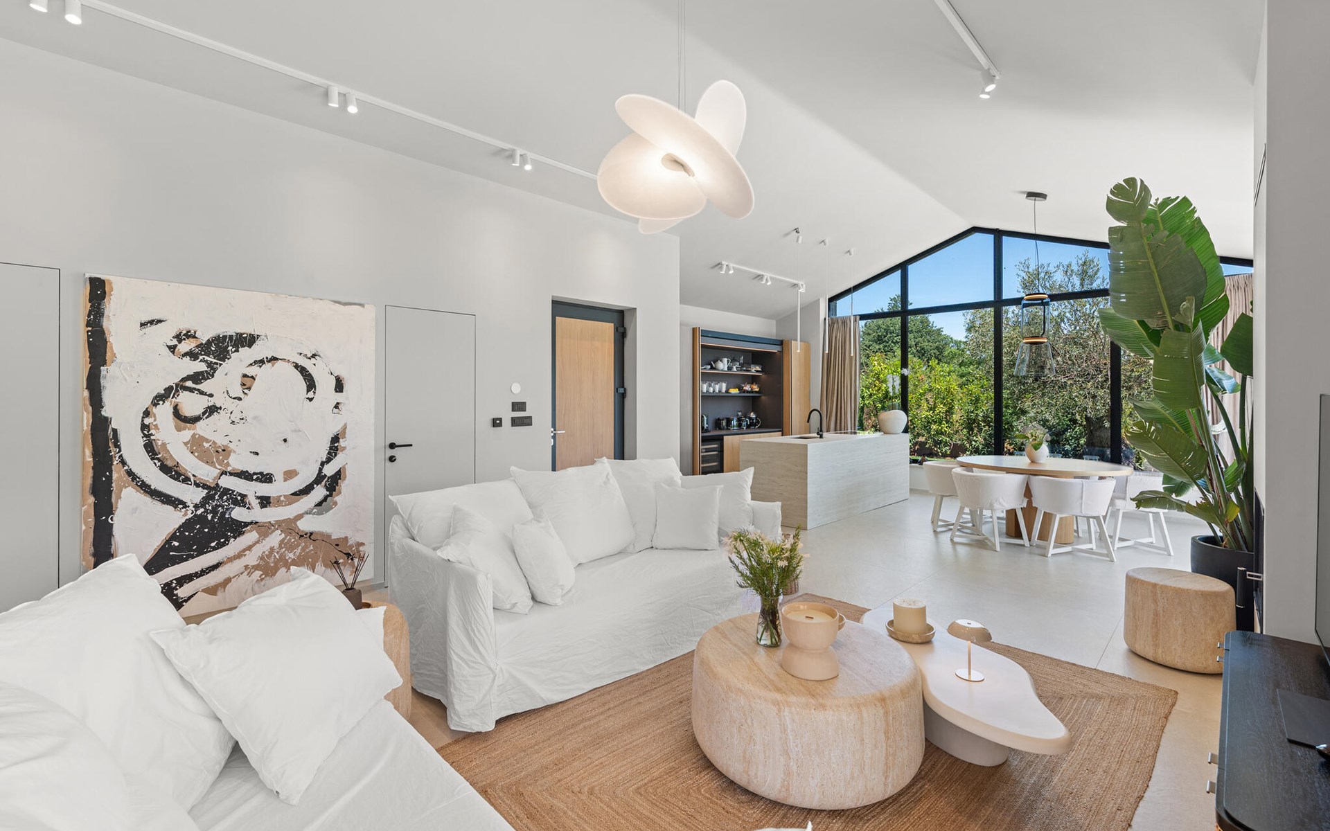 In diesem stilvollen Haus vereinen sich Komfort, Eleganz und Behaglichkeit auf hervorragende Weise. Bodentiefe Fenster, eine bequeme Sofalandschaft in Weiß, Böden in Holzoptik und Designerlampen schaffen eine ganz besondere Atmosphäre. Entspannen Sie sich hier mit einem Drink auf dem Sofa, zaubern Sie leckere Gerichte in der modernen Küche oder versammeln Sie sich für einen gemeinsamen Filmabend.