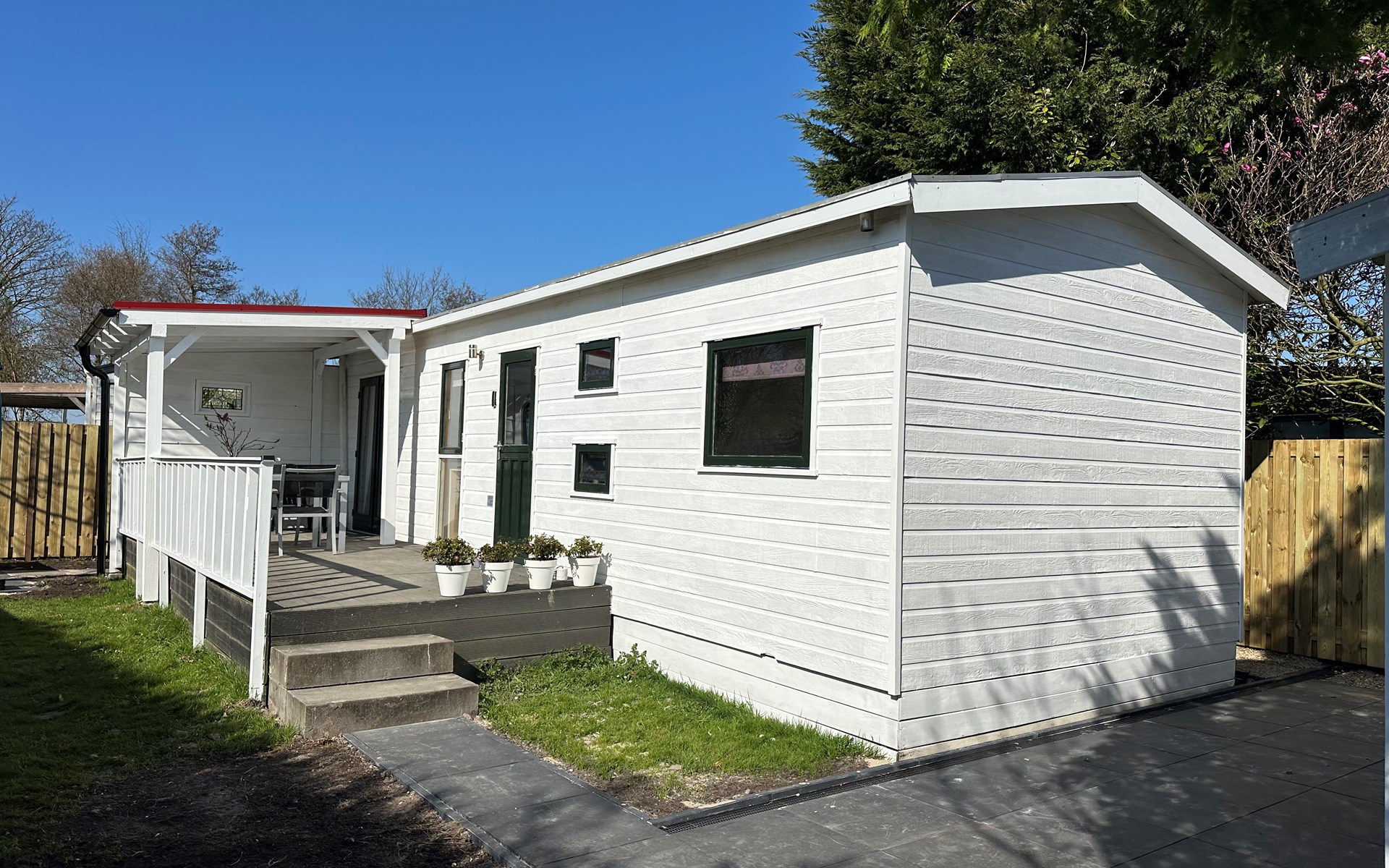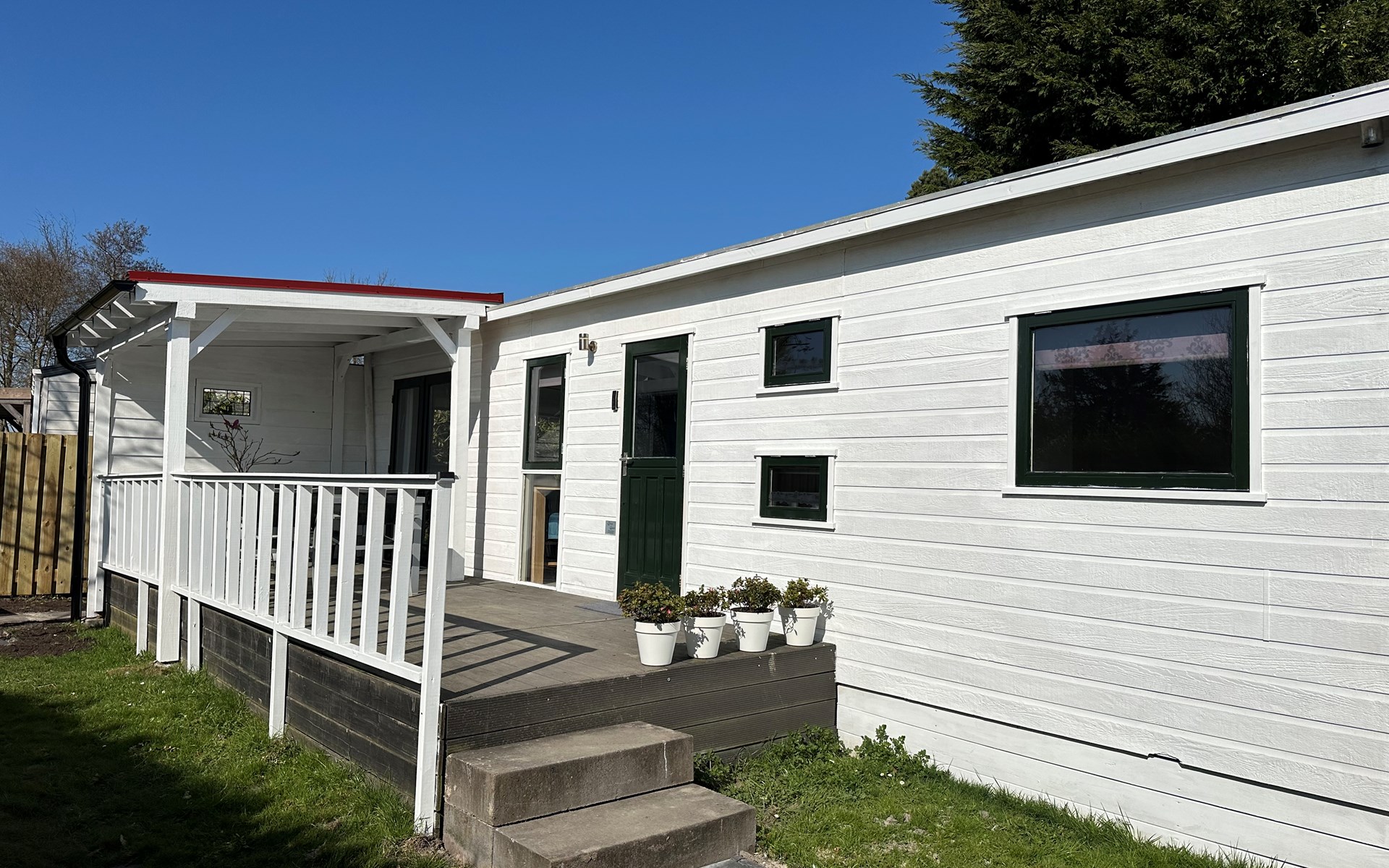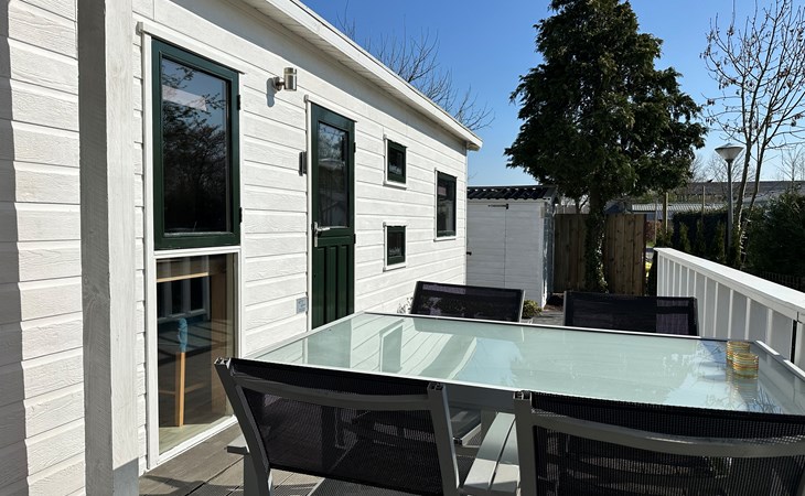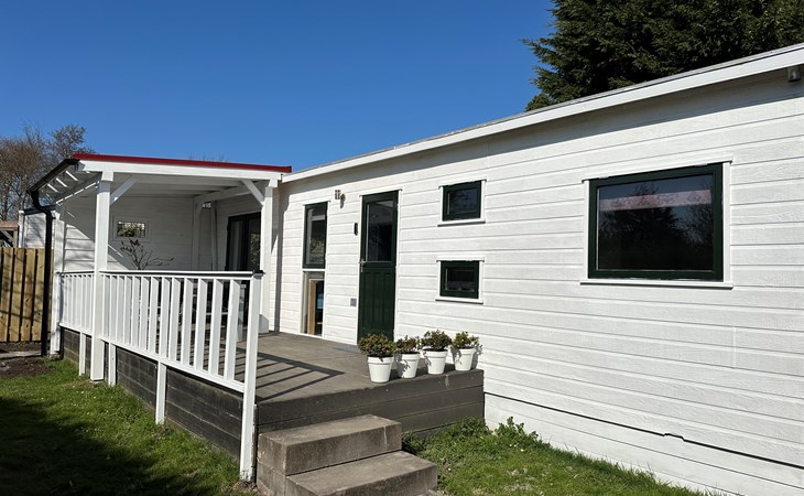 Das Grundstück ist komplett eingezäunt und bietet viel Privatsphäre, ideal, um Ruhe und Frieden zu genießen. Das Chalet verfügt über eine großzügige Terrasse mit attraktivem Baldachin, die sich tagsüber und abends perfekt zum Draußensitzen eignet. Außerdem gibt es einen gemütlichen Loungebereich mit Sonnenschirm, wo Sie entspannen können. Für alle, die gerne im Freien kochen, gibt es einen Außengrill. Auch an die Bequemlichkeit wurde gedacht: In der Nähe des Chalets befindet sich ein privater Parkplatz, sodass Sie bequem ein- und ausfahren können.