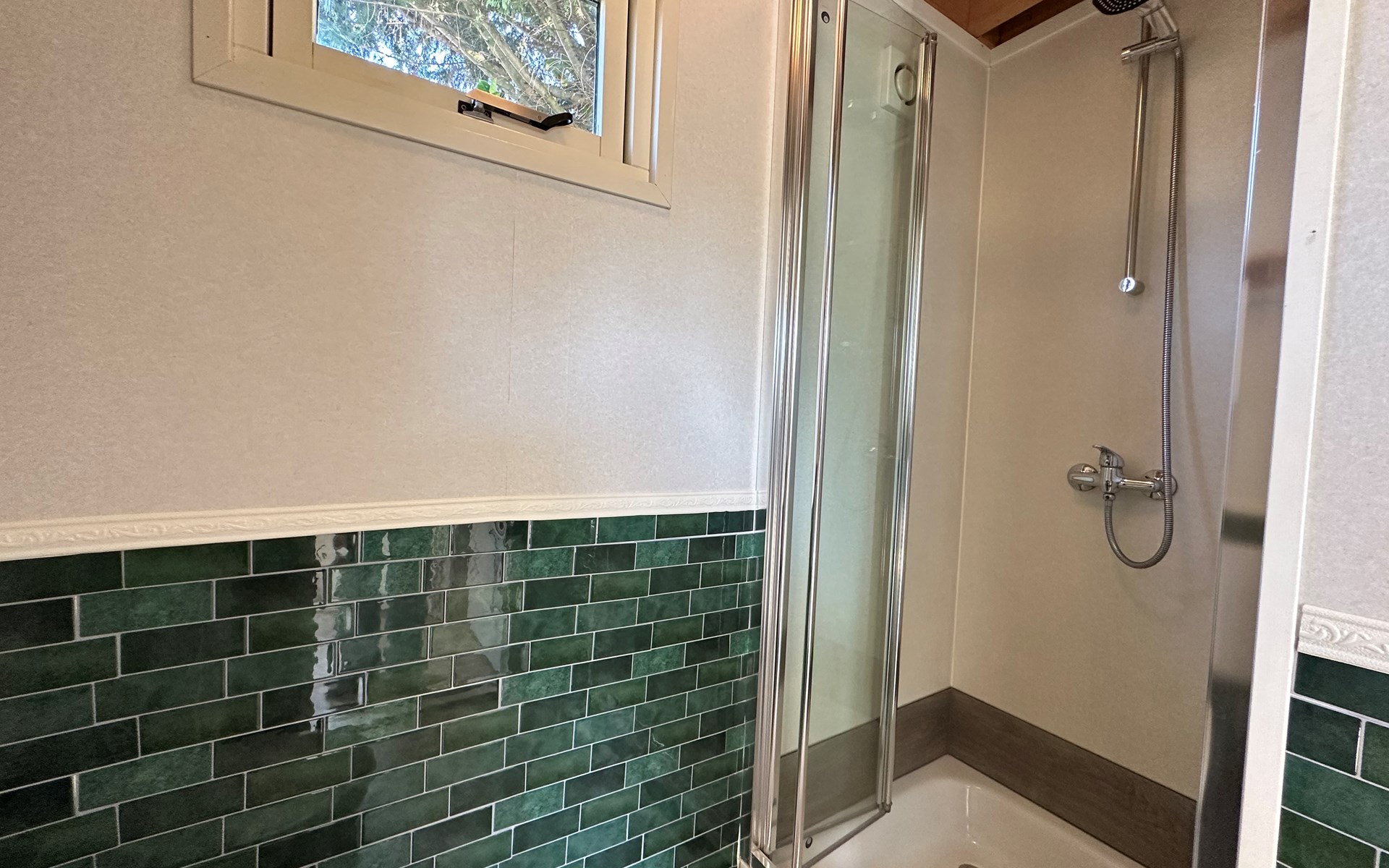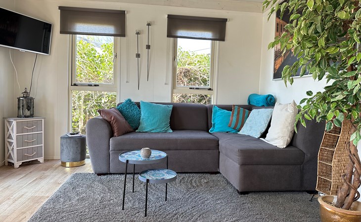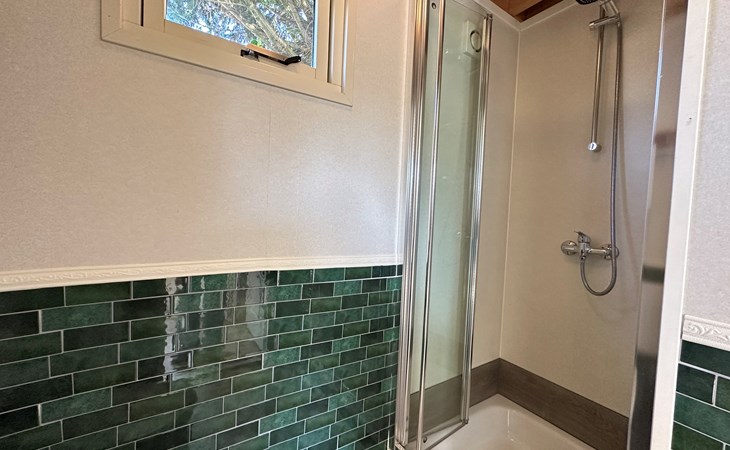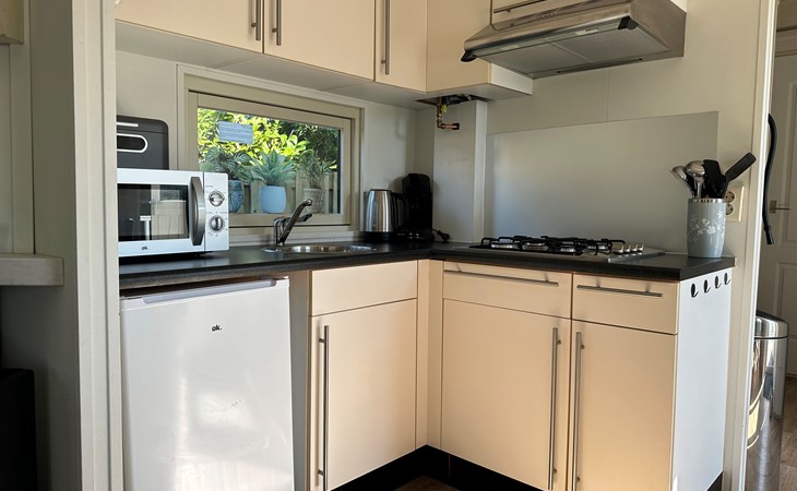 Im Inneren finden Sie ein einladendes Wohnzimmer mit offener Küche, ideal für entspannte Abende und die Zubereitung von Mahlzeiten. Das Badezimmer ist praktisch ausgestattet mit Toilette, Dusche und Waschbecken.