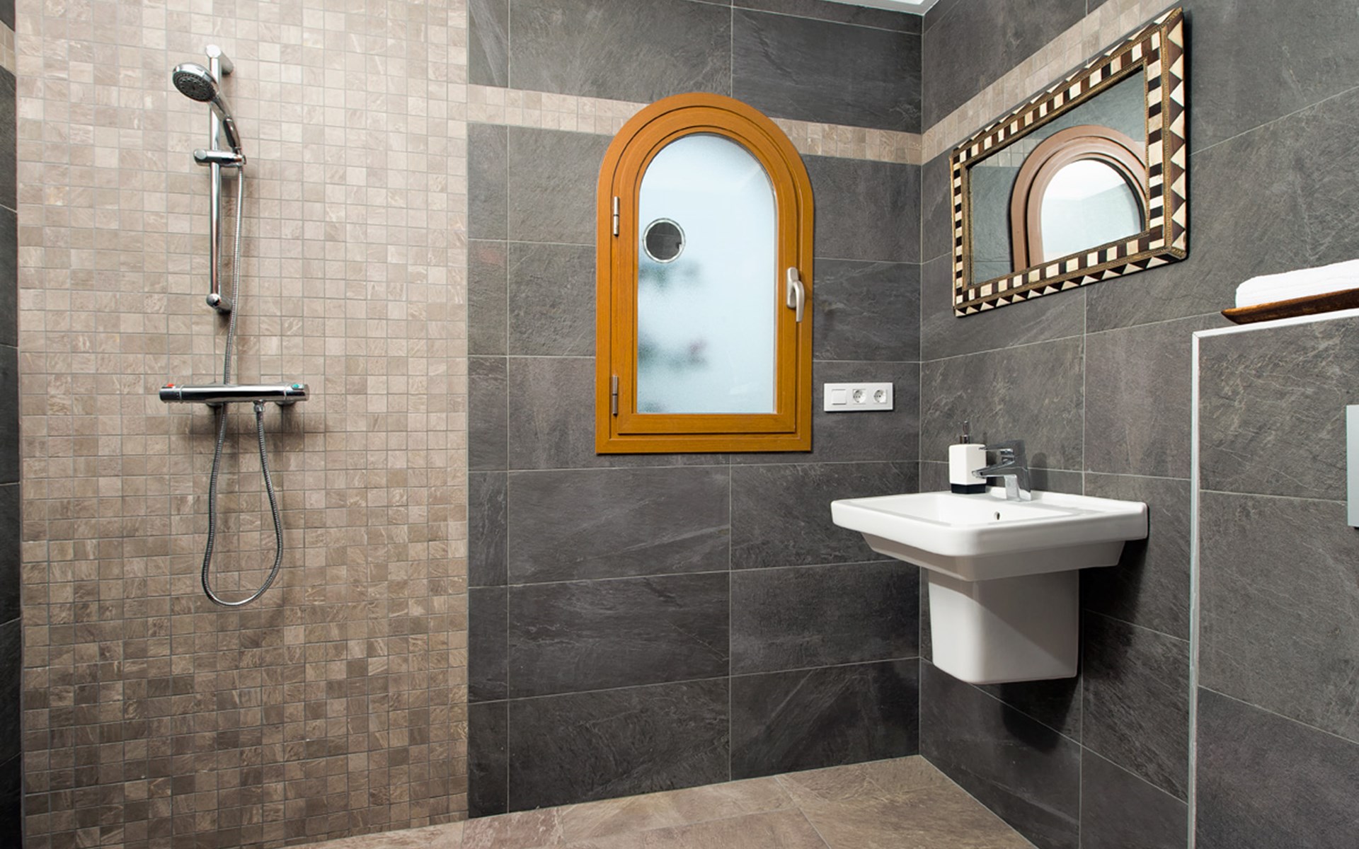 - Badezimmer mit Einzelwaschbecken, Dusche, Toilette und Föhn