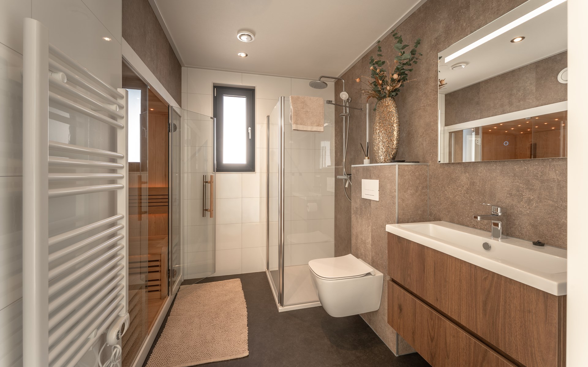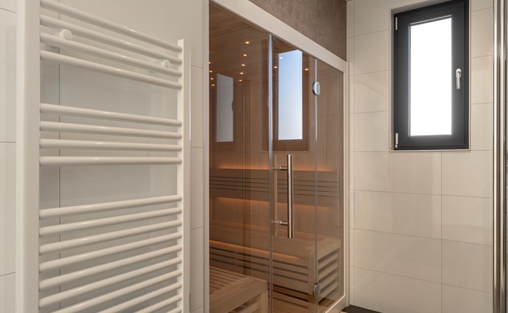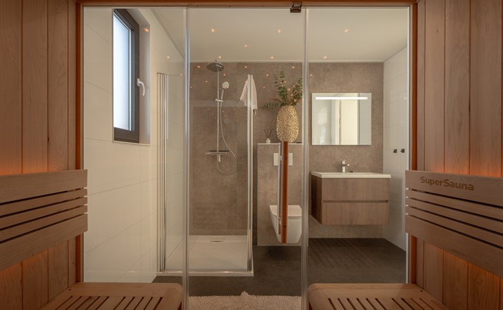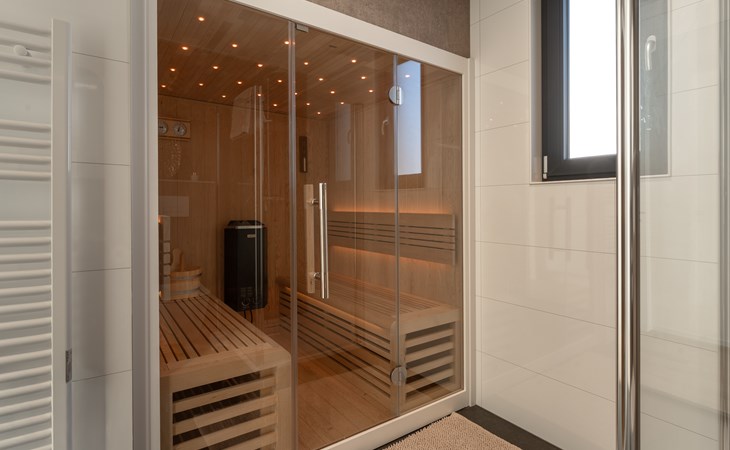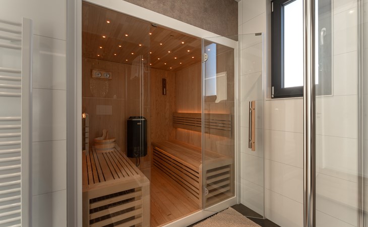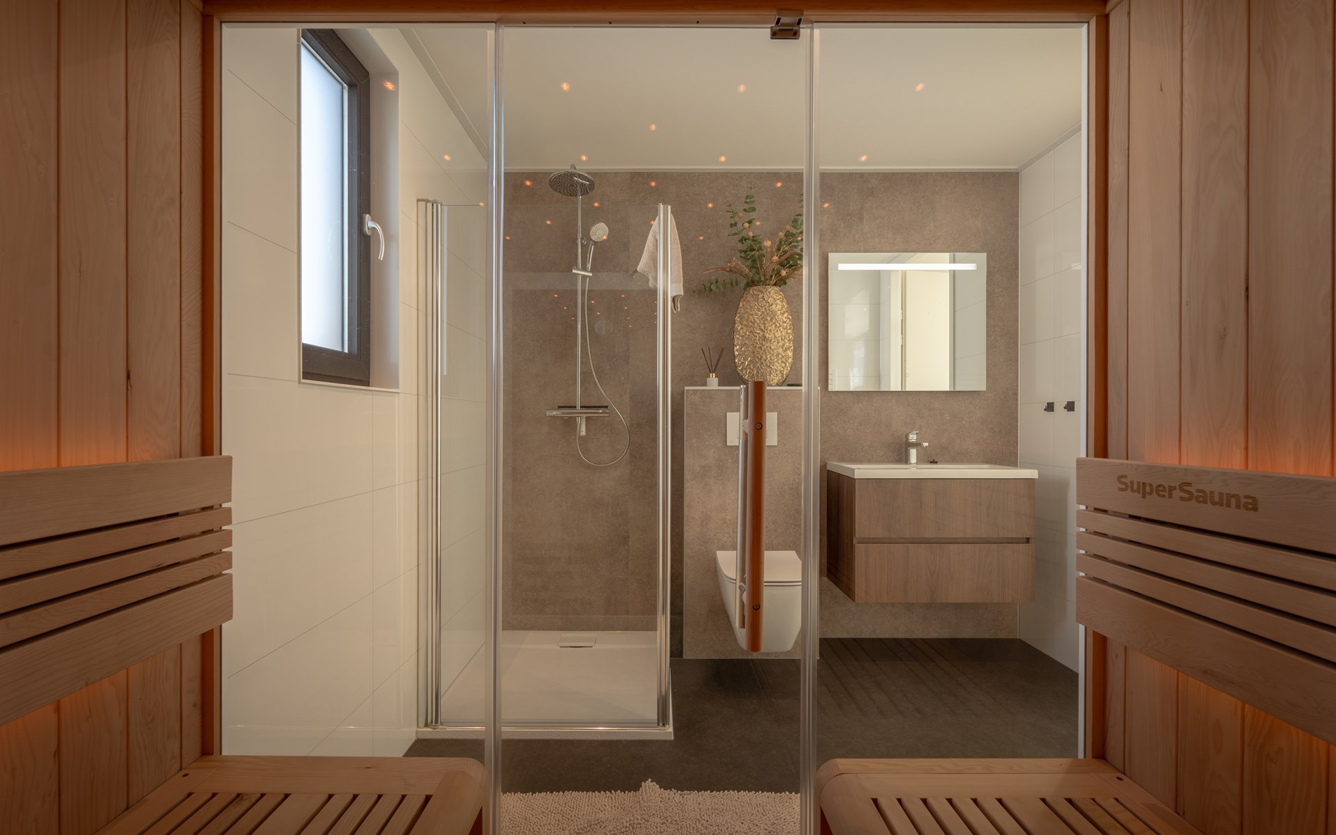 Das geräumige Badezimmer ist das Herzstück der Villa. Hier genießen Sie eine luxuriöse S-Line-Duo-Sauna, eine Regendusche und hochwertige Ausstattung. Ein wunderbarer Ort, um nach einem Tag im Freien vollkommen zu entspannen. Das Badezimmer ist mit Waschbecken und WC ausgestattet.