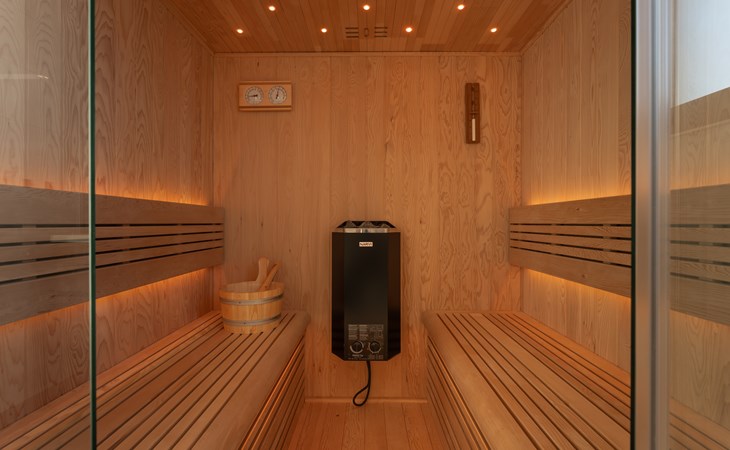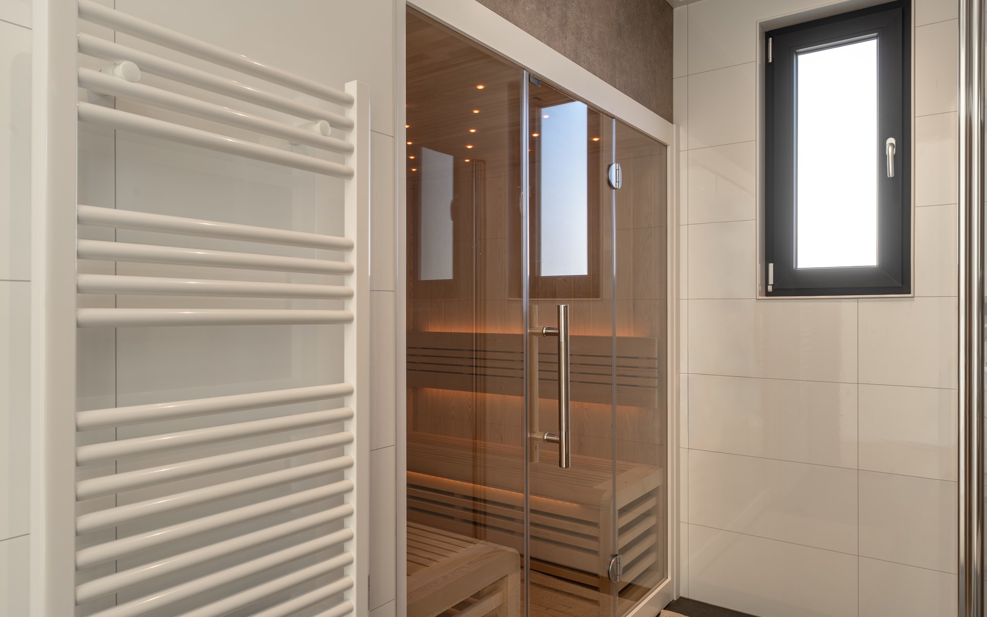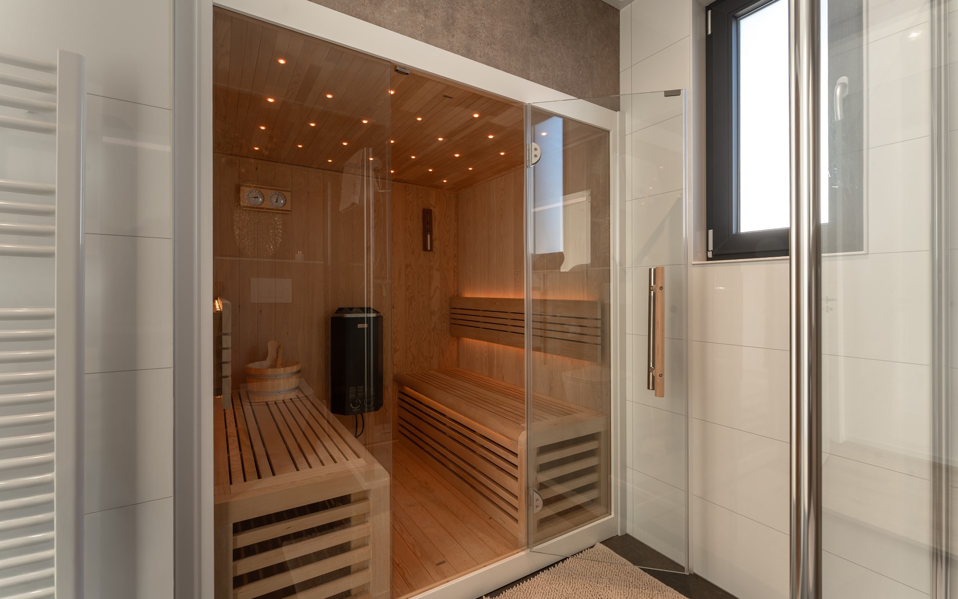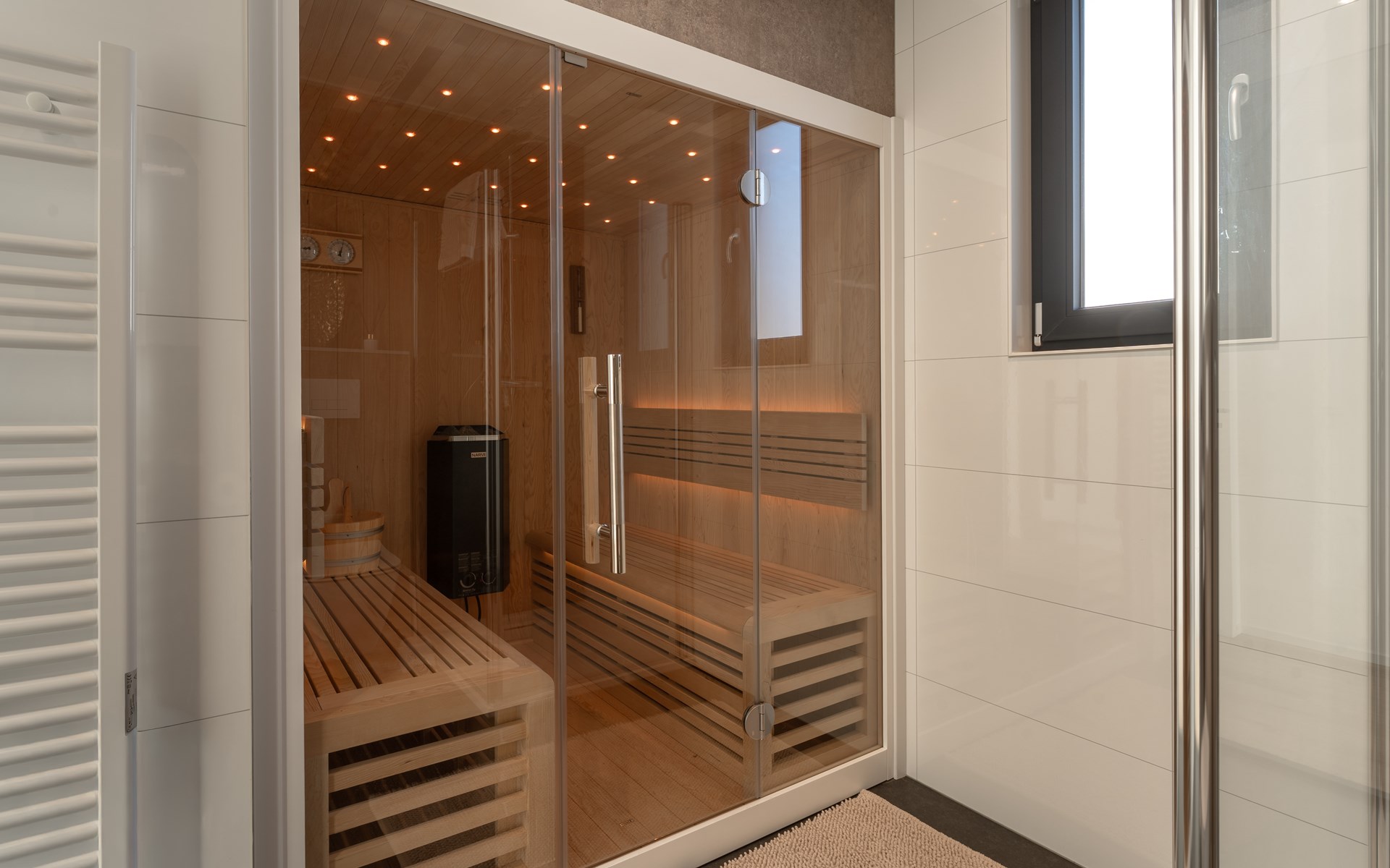 Das geräumige Badezimmer ist das Herzstück der Villa. Hier genießen Sie eine luxuriöse S-Line-Duo-Sauna, eine Regendusche und hochwertige Ausstattung. Ein wunderbarer Ort, um nach einem Tag im Freien vollkommen zu entspannen. Das Badezimmer ist mit Waschbecken und WC ausgestattet.
