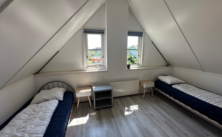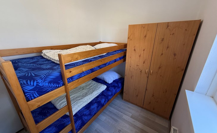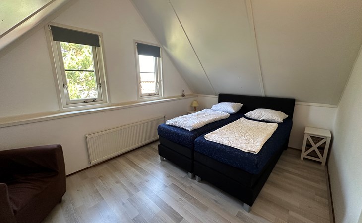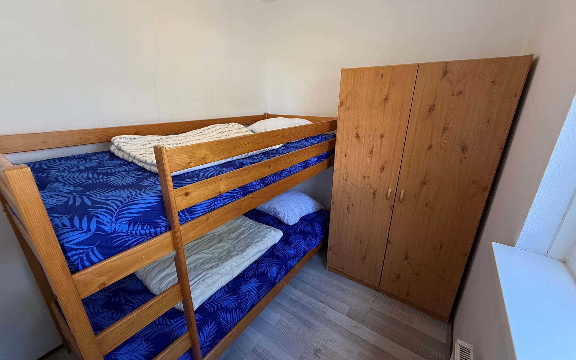 Die Schlafzimmer sind über zwei Etagen verteilt. Im Obergeschoss finden Sie zwei Schlafzimmer: eines mit einem Doppelbett (zwei Matratzen) und eines mit zwei Einzelbetten.