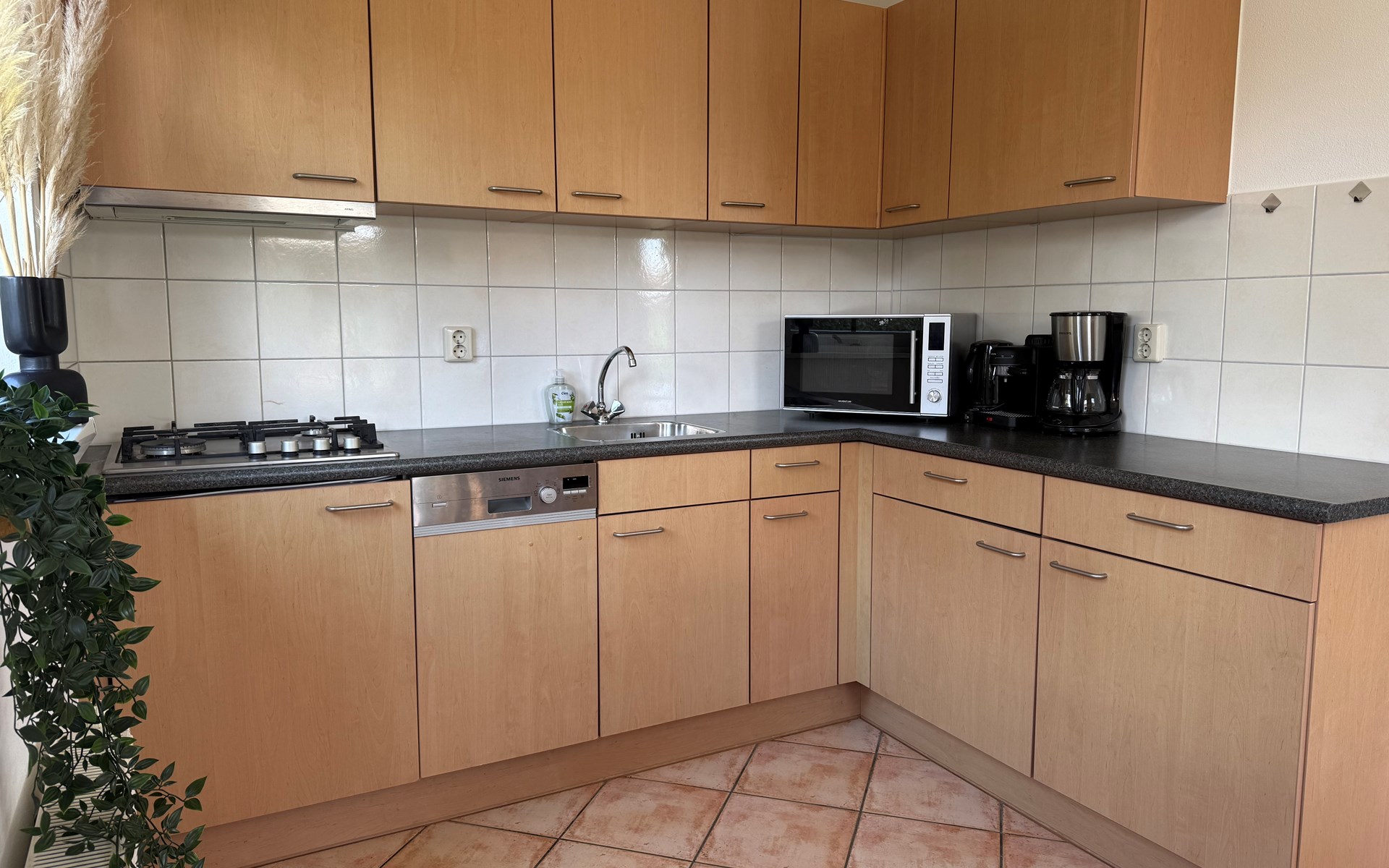 Die Küche ist komplett ausgestattet: Kühlschrank mit Gefrierfach, Geschirrspüler, Kombimikrowelle, Kaffeemaschine, Wasserkocher und Gasherd.