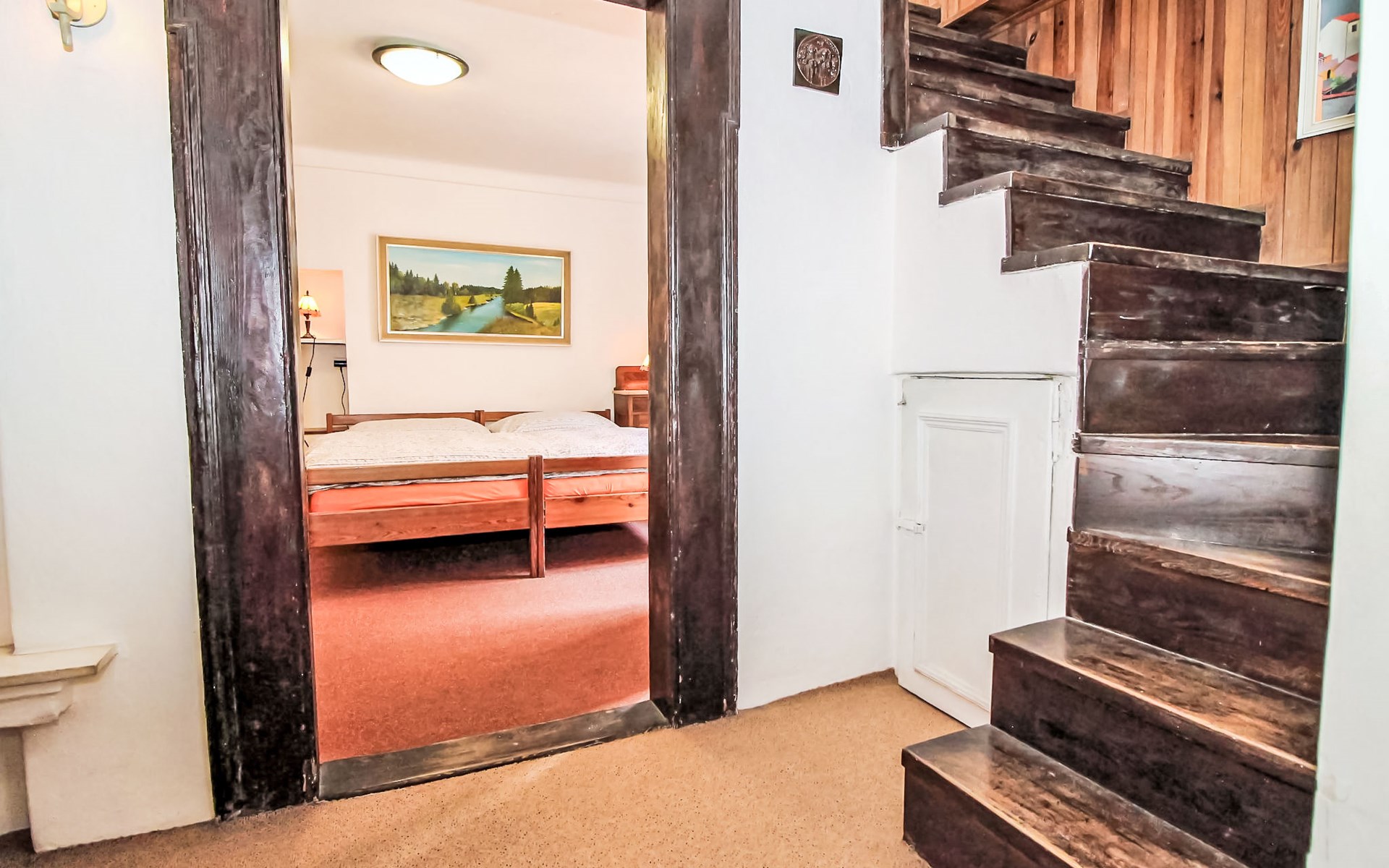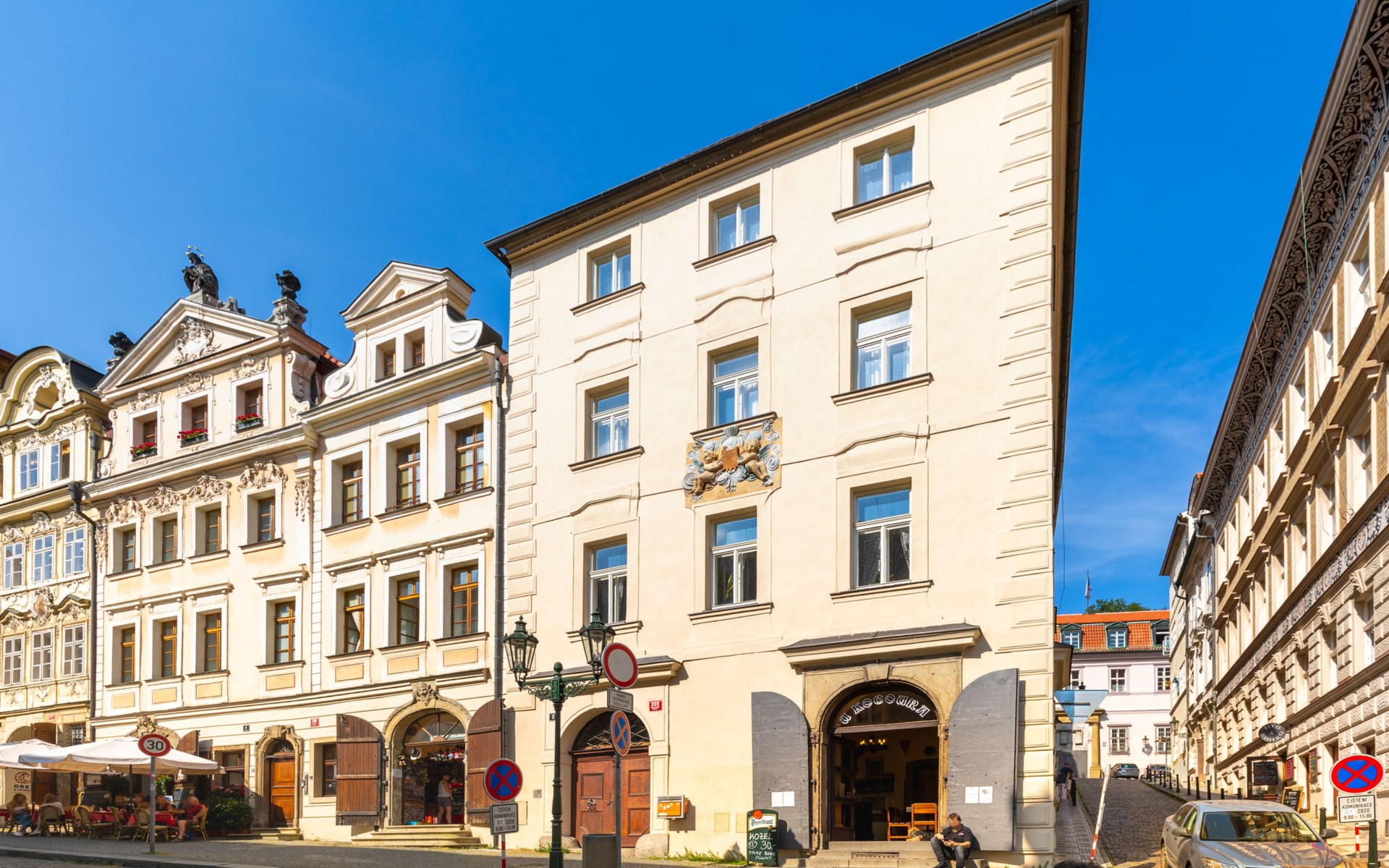 Historisches Appartementhaus. Im Ortsteil Malá Strana, im Ortszentrum von Praha, im Herzen der Stadt, 500 m vom Fluss. Zufahrt bis zum Haus. Öffentliche Parkplätze auf der Strasse extra. Einkaufsgeschäft 50 m, Lebensmittelgeschäft 200 m, Restaurant 10 m, Café 50 m, Straßenbahn "Malostranské náměstí" 200 m, Bushaltestelle "Nerudova" 50 m, U-Bahnstation "Malostranská" 800 m, Freibad 5 km, Hallenbad 2.5 km. Golfplatz (18 Loch) 5 km, Tennis 5 km, Sportzentrum 1.4 km, Kinderspielplatz 700 m. Nahe gelegene Sehenswürdigkeiten: Chrám Sv. Mikuláše 100 m, Hradčany/Pražský Hrad 300 m, Karlův most 600 m, Petřínská rozhledna 1.3 km, Staroměstské nám. Orloj 1.5 km, Václavské nám. 2 km, Vyšehrad 4 km, Zoo 5 km, Karlštejn 35 km, Křivoklát 55 km. Bekannte Seen in der Umgebung sind gut erreichbar: voní nádrž Džbán 6 km, Hostivařská přehrada 13 km, Velká Amerika 35 km. Wandergebiete: Petřínské sady 1 km, Stromovka 3.5 km, Divoká Šárka 8 km, Prokopské údolí 9 km.