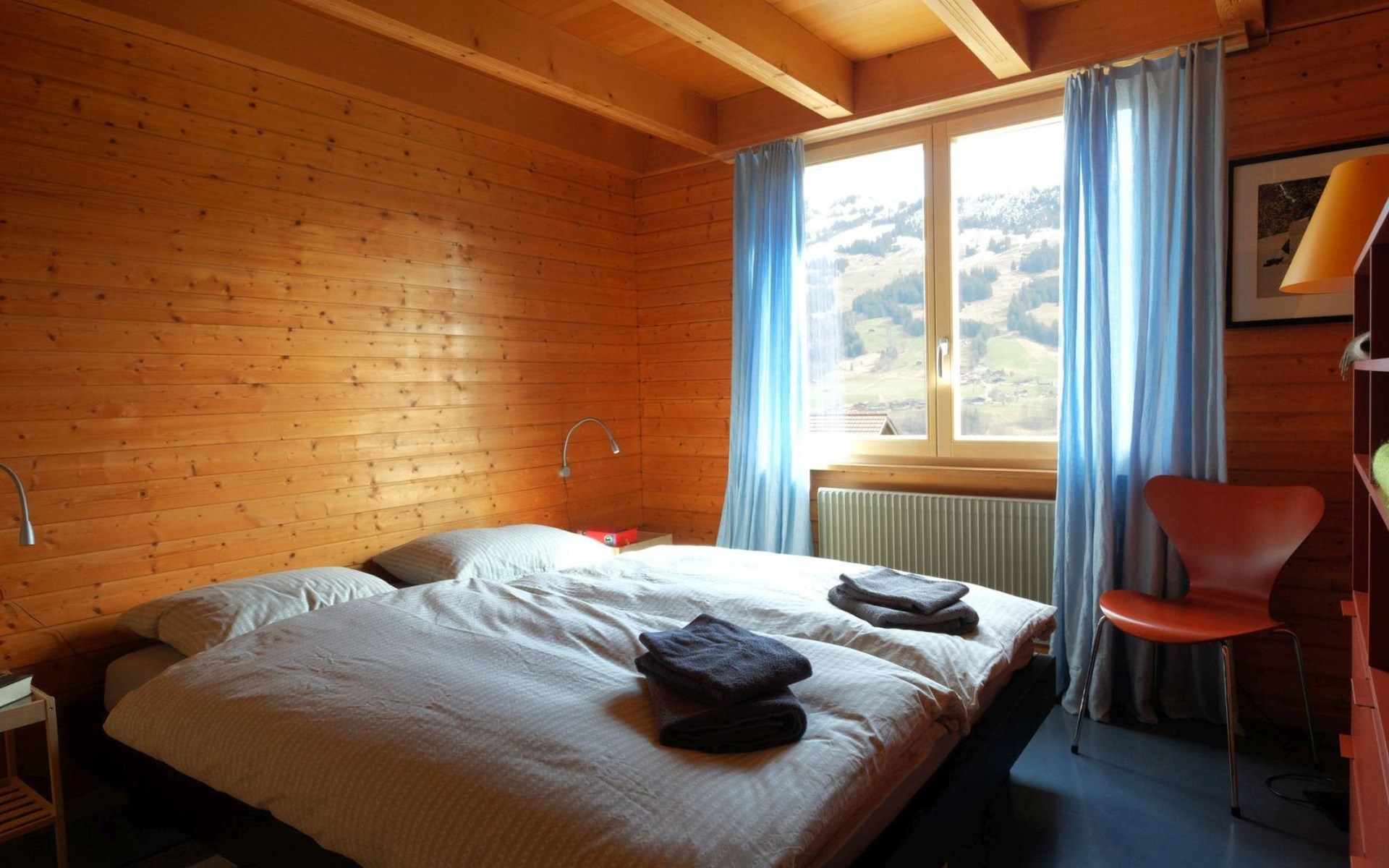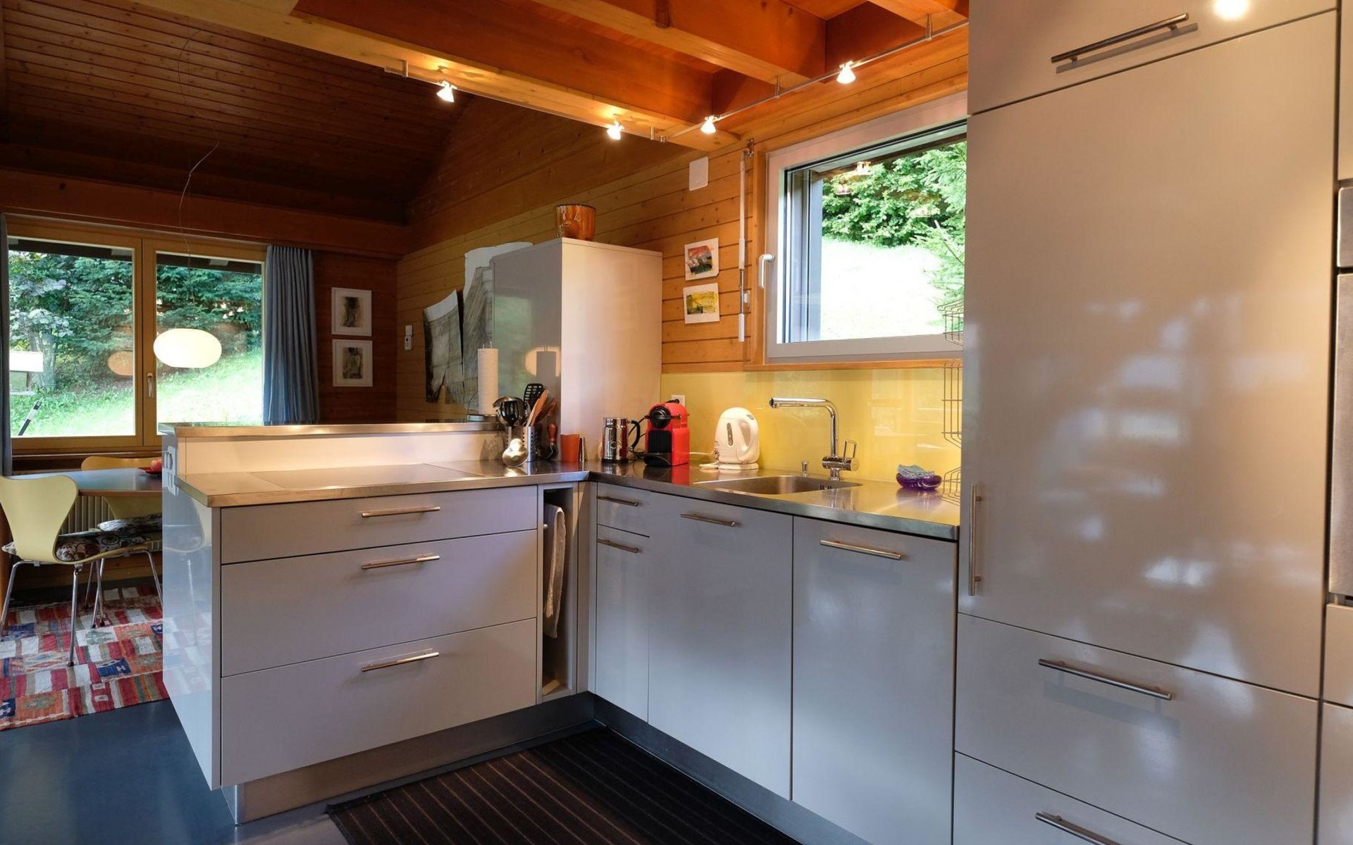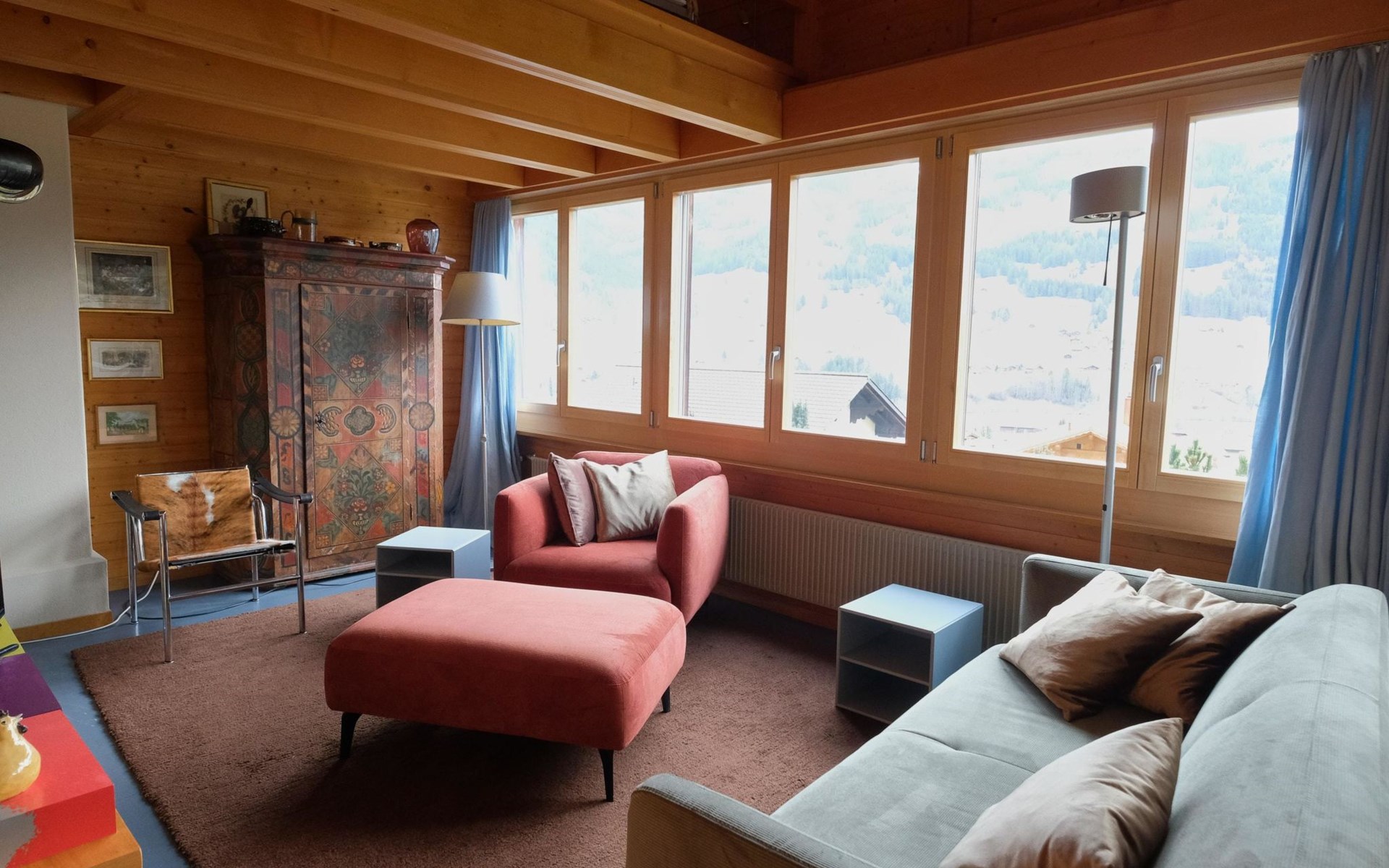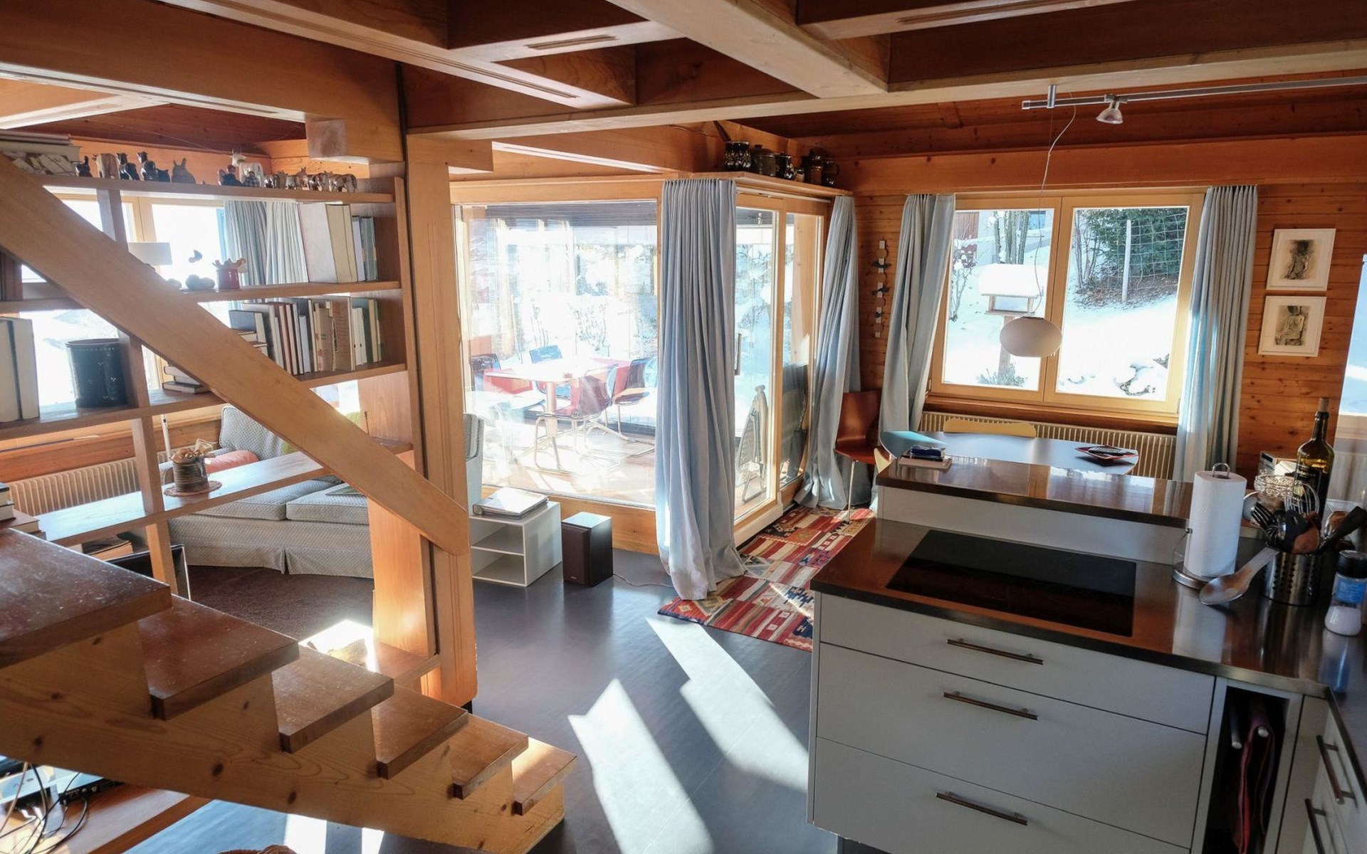 Hochparterre (Eingang): Grosses und helles Wohn-/Esszimmer mit Sofa, 2 Sesseln, TV, Teleboy mit über 250 Sendern, Apple TV und Netflix (eigenes Abo nötig), Essecke mit Esstisch. Offene Küche mit Geschirrspüler, Kapsel-Kaffeemaschine (Nespresso), Fondue- und Raclette-Set sowie diversen weiteren Küchengeräten. 1 Schlafzimmer mit Grand Lit (160x200cm). 1 Badezimmer mit Badewanne/WC. 1. Stock (Galerie): 1 separates Schlafzimmer mit 1 Grand Lit (140x200cm). 1 Grand Lit (140x200cm / automatisch verstellbares ergonomisches Bettsystem) auf der Galerie (kein abgeschlossener Raum). WiFi (1000MB/s).