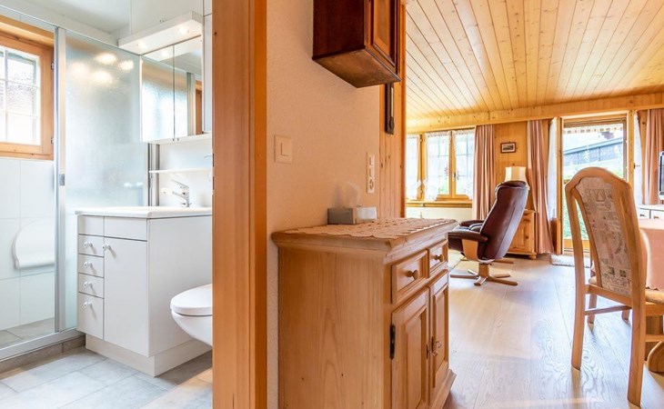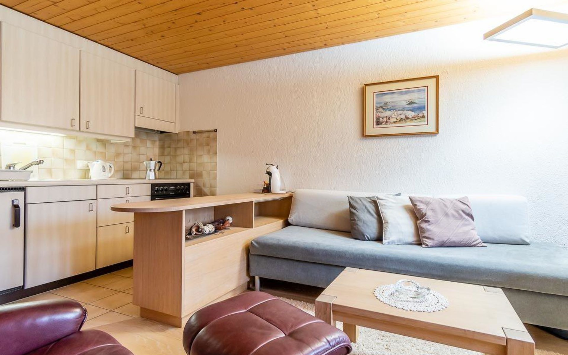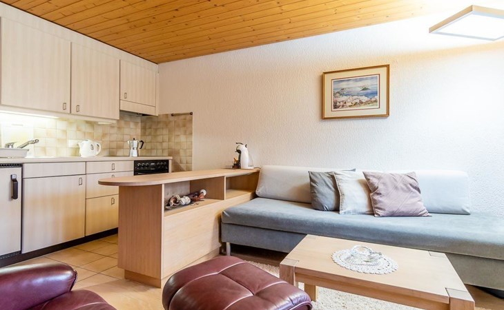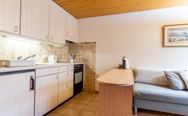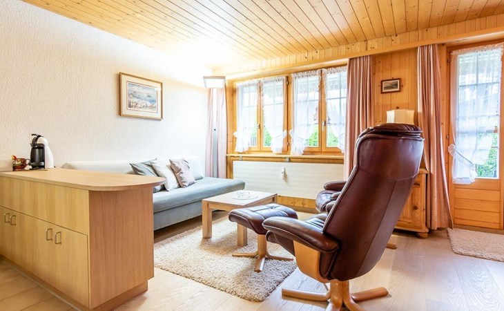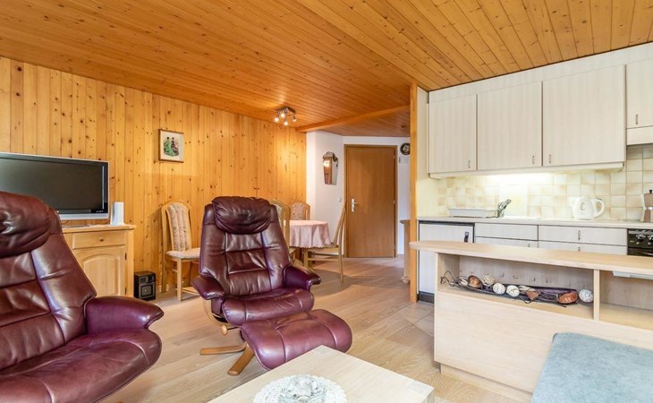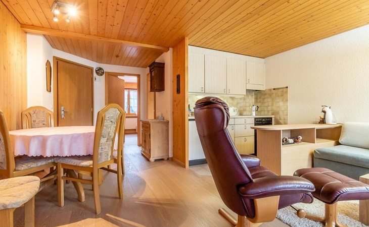 Wohn-/Esszimmer mit Esstisch, Bettsofa (80x200cm), 2 Sesseln, TV und offener Küche (u.a. ausgestattet mit Backofen, Kühlschrank mit Gefrierfach, Kapsel-Kaffeemaschine (Nespresso), Toaster, Wasserkocher sowie Raclette- und Fondue-Set). 1 Schlafzimmer mit 1 Doppelbett (2x90x200cm), TV und Einbauschrank. 1 Badezimmer mit Dusche und WC. WiFi.