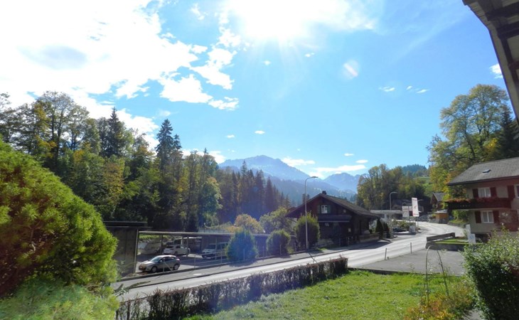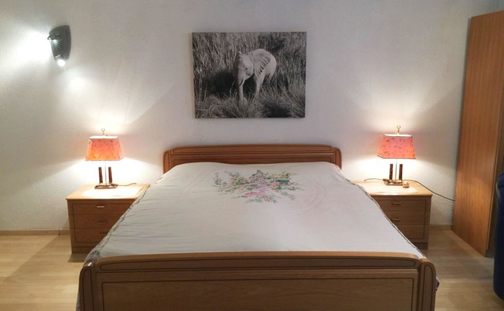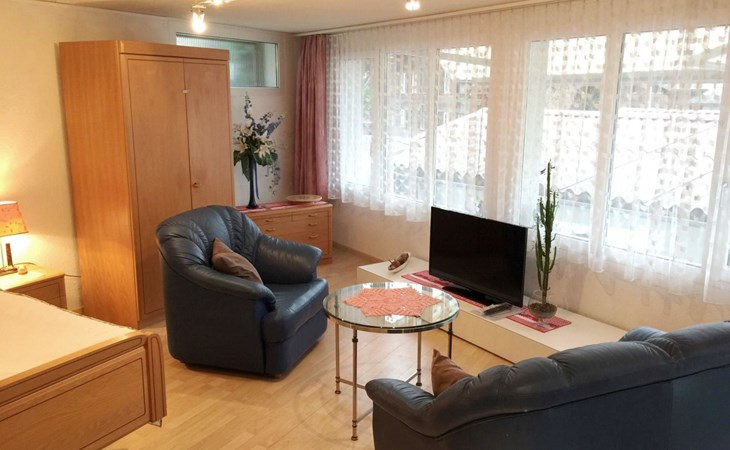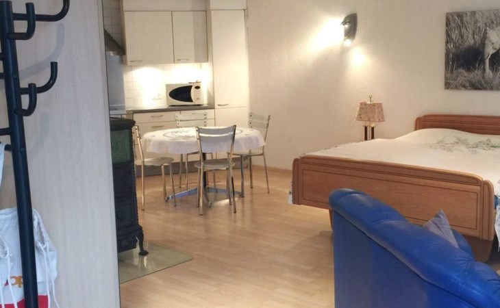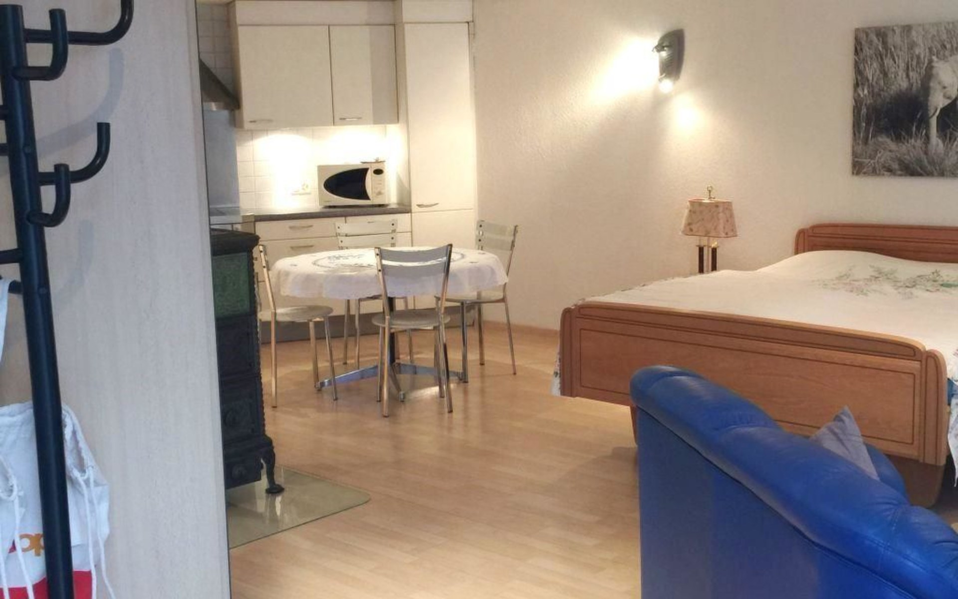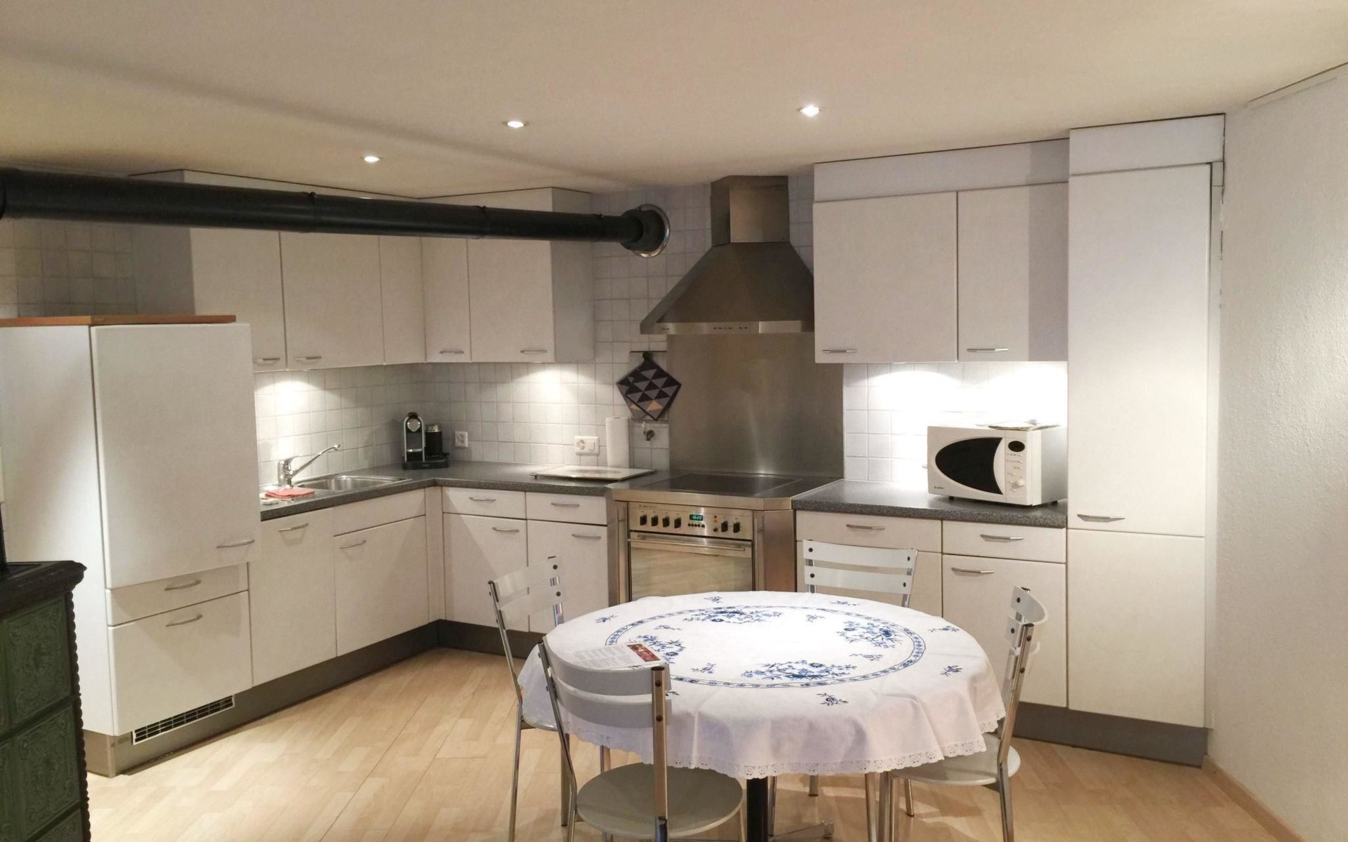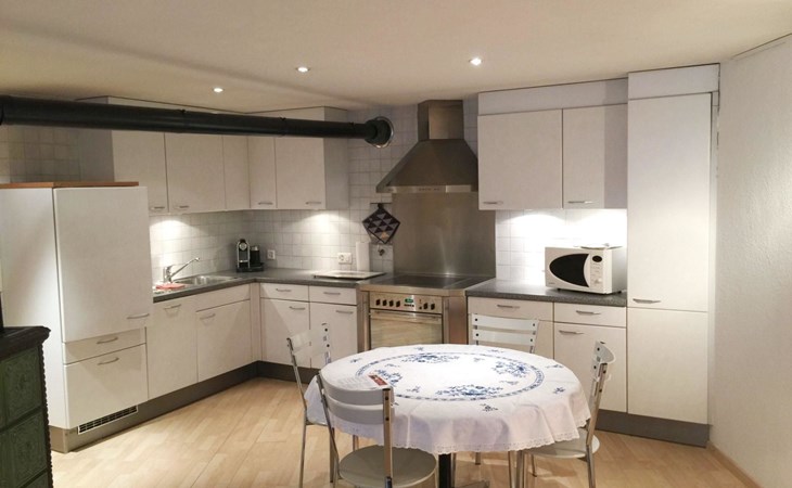 Wohn-/Ess-/Schlafzimmer mit offener Küche (Backofen, Mikrowelle, Geschirrspülmaschine, Kühlschrank mit Gefrierfach, Kapsel-Kaffeemaschine (Nespresso), Wasserkocher und Raclette-Set), Esstisch mit 4 Stühlen, Sofa, 1 Sessel, TV, 2 Schränke und 1 Doppelbett (180x200cm). 1 Badezimmer mit Dusche, Badewanne und WC. Der Schwedenofen darf von Gästen nicht benutzt werden. Die Wohnung verfügt über eine Bodenheizung. Kinderbett (60x120cm, inkl. Bettwäsche) und WiFi vorhanden.