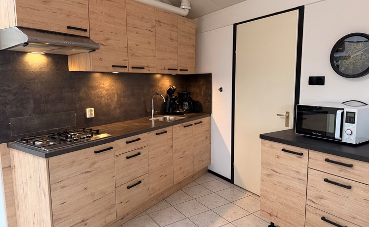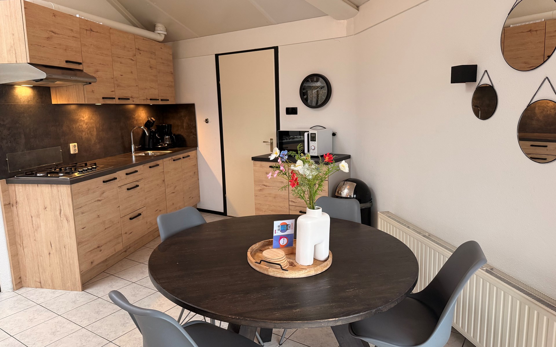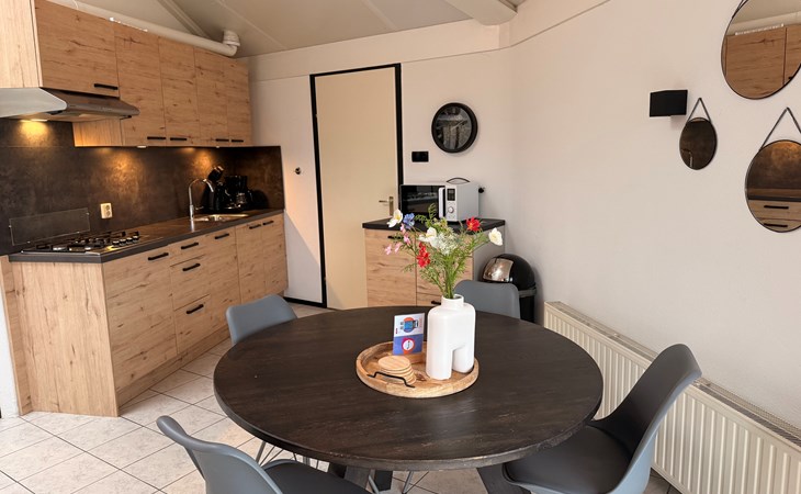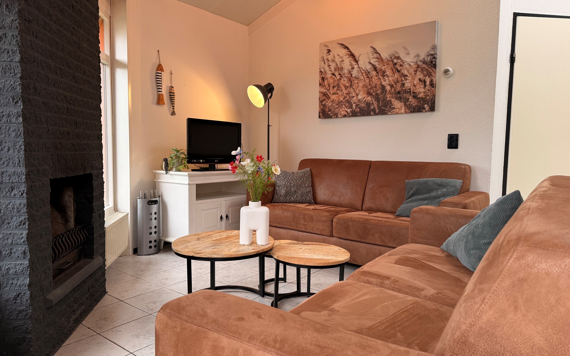 Im Inneren finden Sie ein helles Wohnzimmer mit offener Küche und einer Schiebetür zum Garten. Im Wohnzimmer sorgt der Kamin in den kälteren Monaten für zusätzliche Atmosphäre. Die Küche ist komplett ausgestattet, unter anderem mit Backofen, Mikrowelle, Gasherd, Geschirrspüler, Kühlschrank mit Gefrierfach, Kaffeemaschine und Wasserkocher.