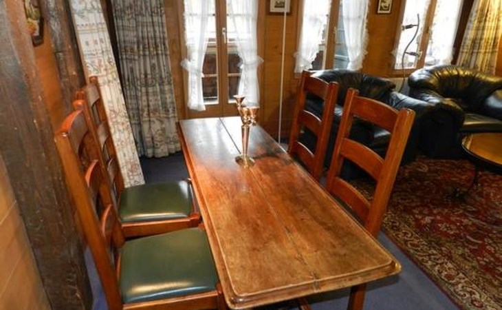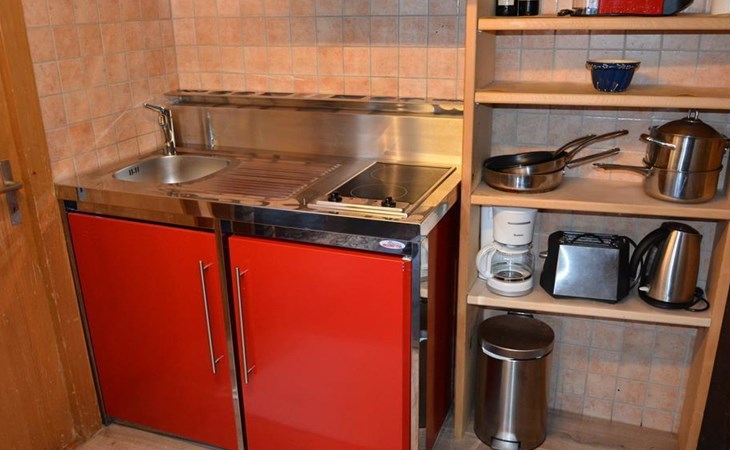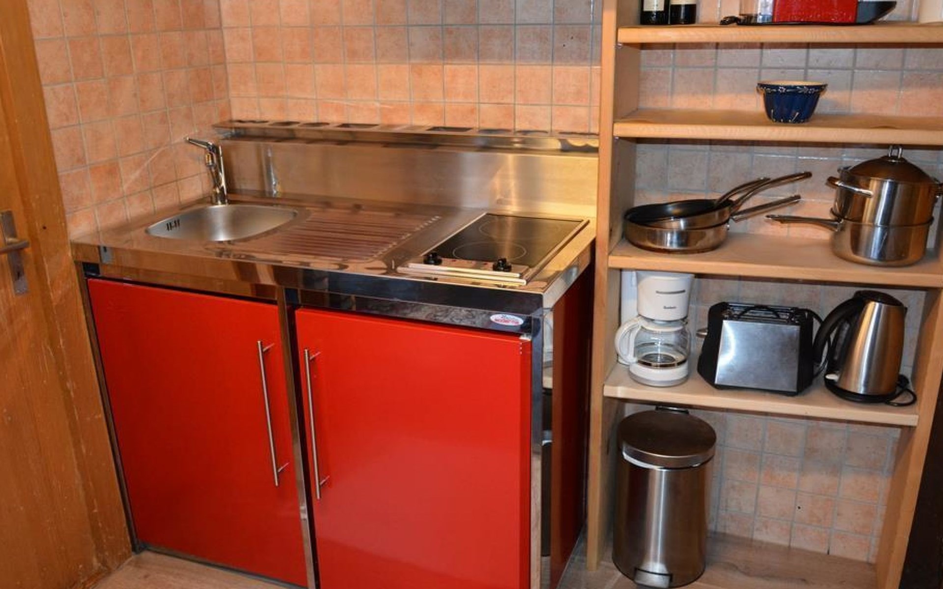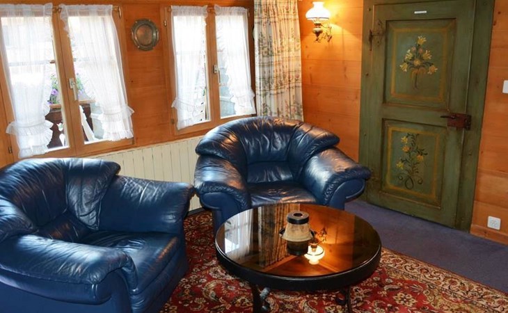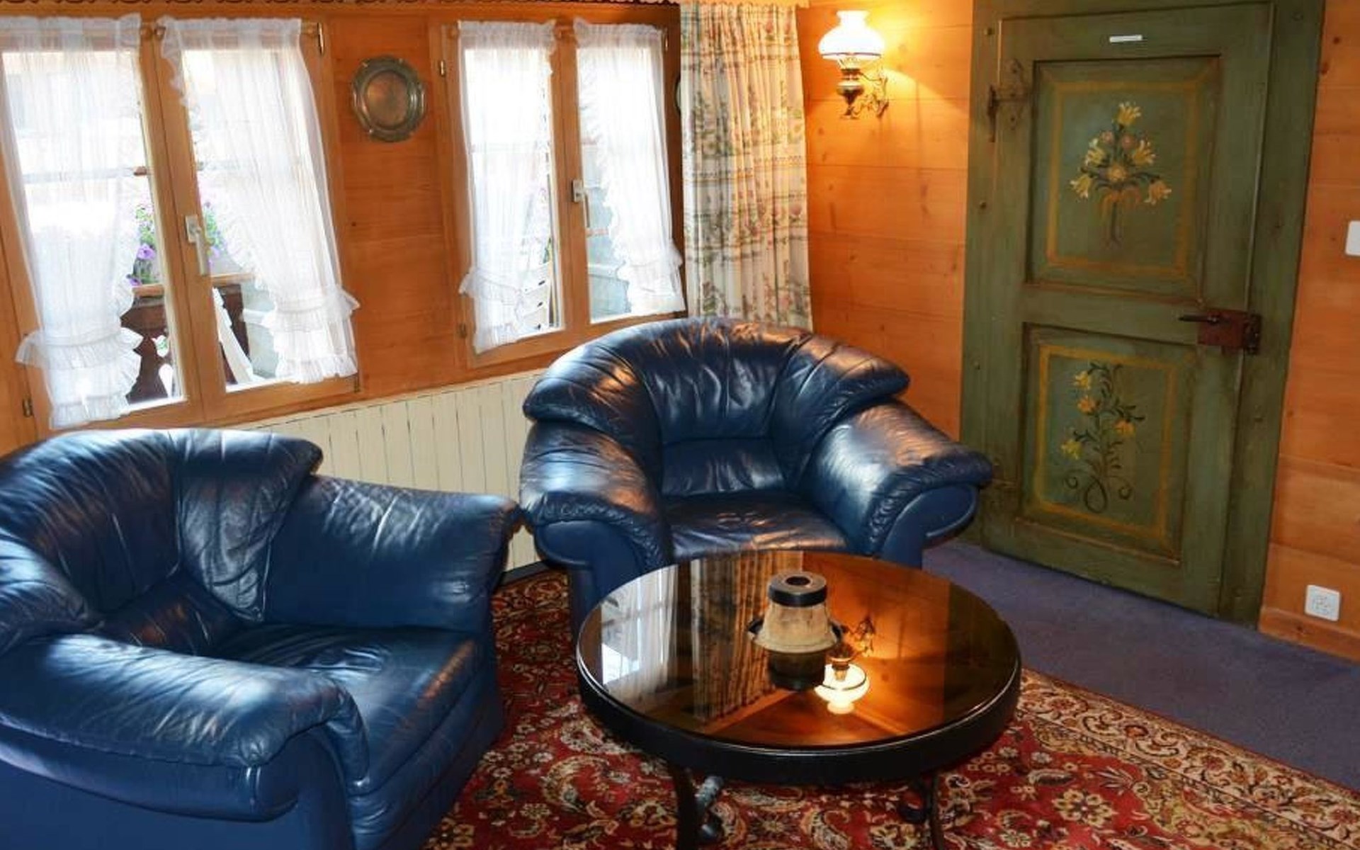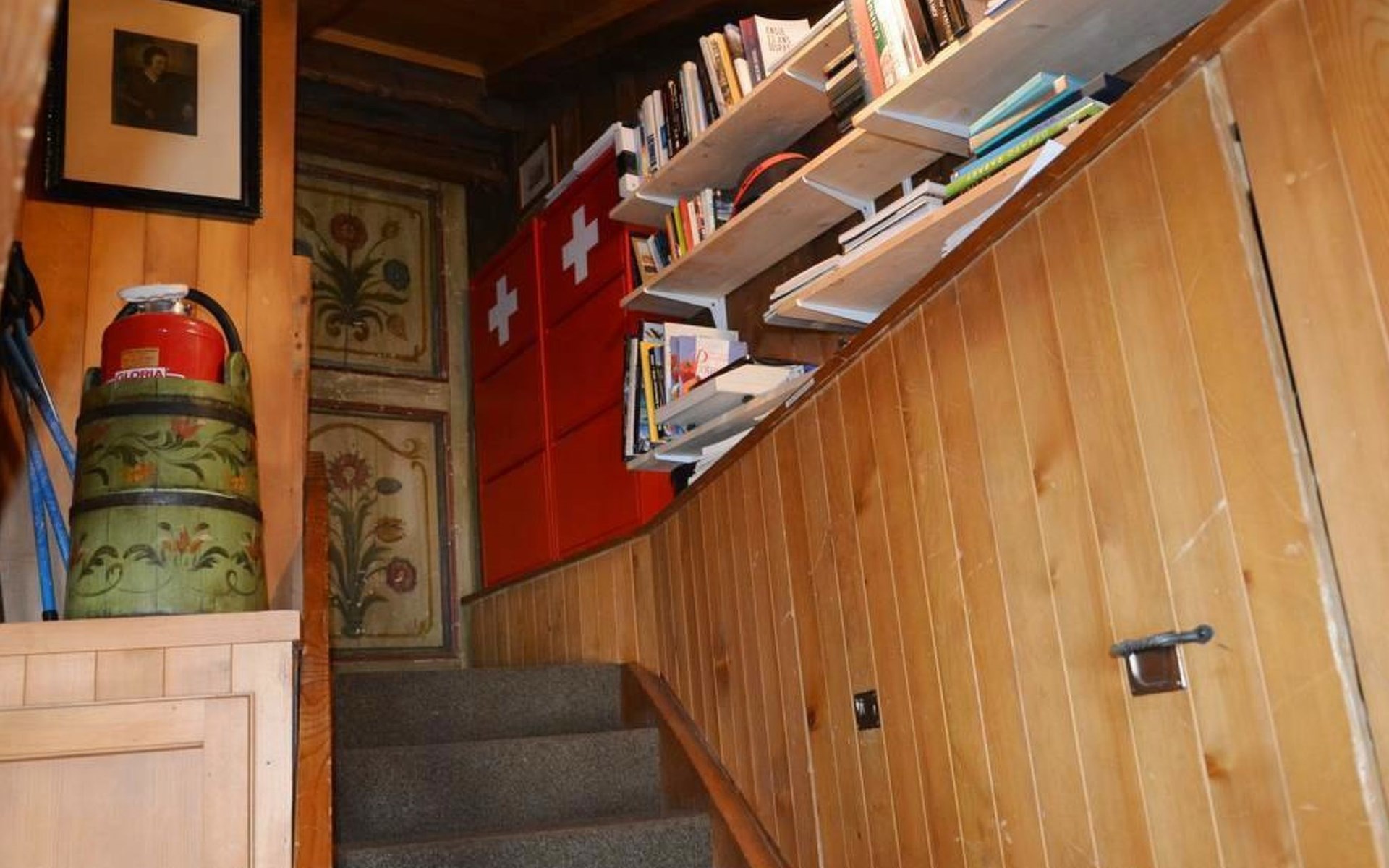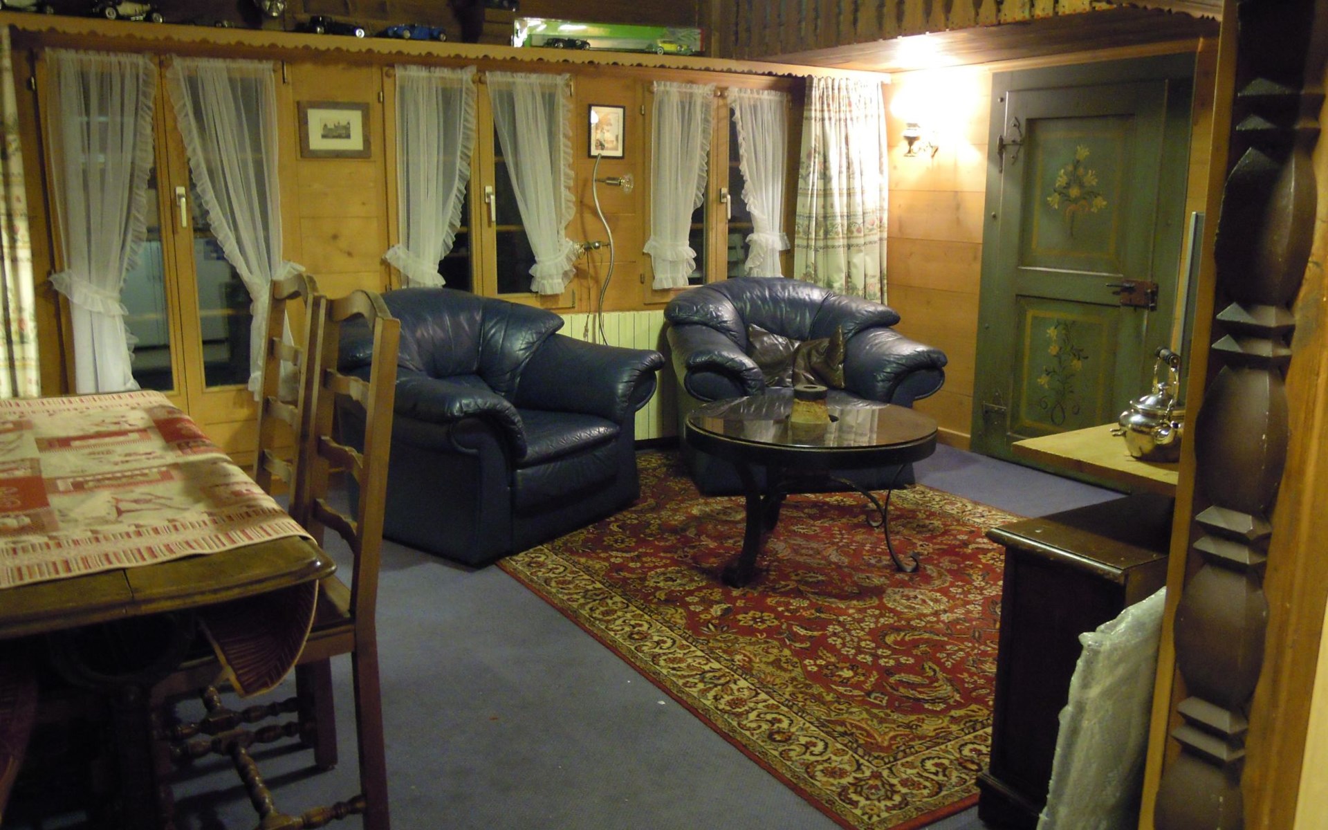Wohn-/Esszimmer mit 2 Sesseln, Salontisch, Esstisch und Flachbildschirm-TV. WiFi. Kleine offene Küche mit Kitchenette (2 Herdplatten, Kapsel-Kaffeemaschine (Nespresso), Fondue- und Raclette-Set). Ein vom Wohnzimmer mit einem Vorhang abgetrenntes kleines Schlafzimmer in Dachschräge mit Doppelbett (180x200cm), kleinem Schrank und Kommode. 2 Einzelbetten (90x190cm) auf der Galerie (nicht für Kleinkinder geeignet). Eine schmale Klapptreppe ohne Geländer führt auf die Galerie. 1 Badezimmer mit WC und Dusche. Kleiner Balkon mit Gartenmöbeln, Abstellraum für Ski- und Sportgeräte.