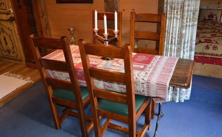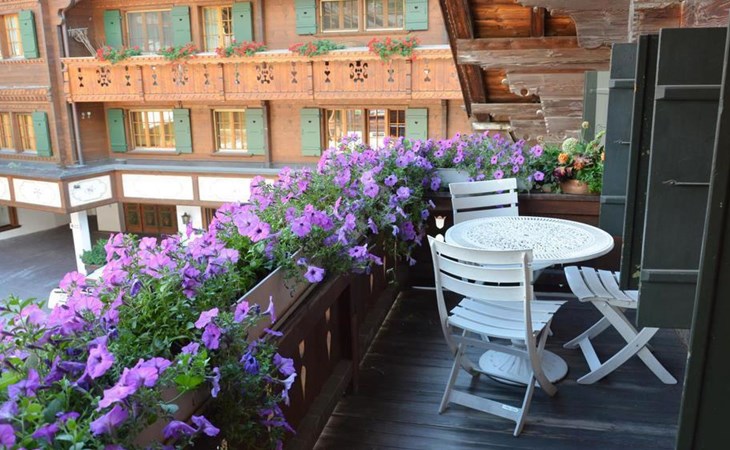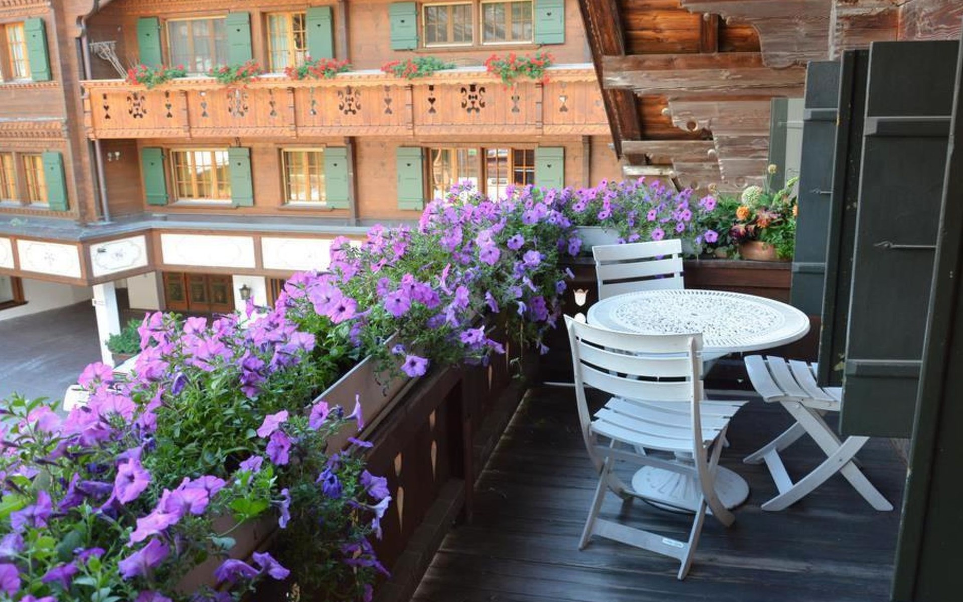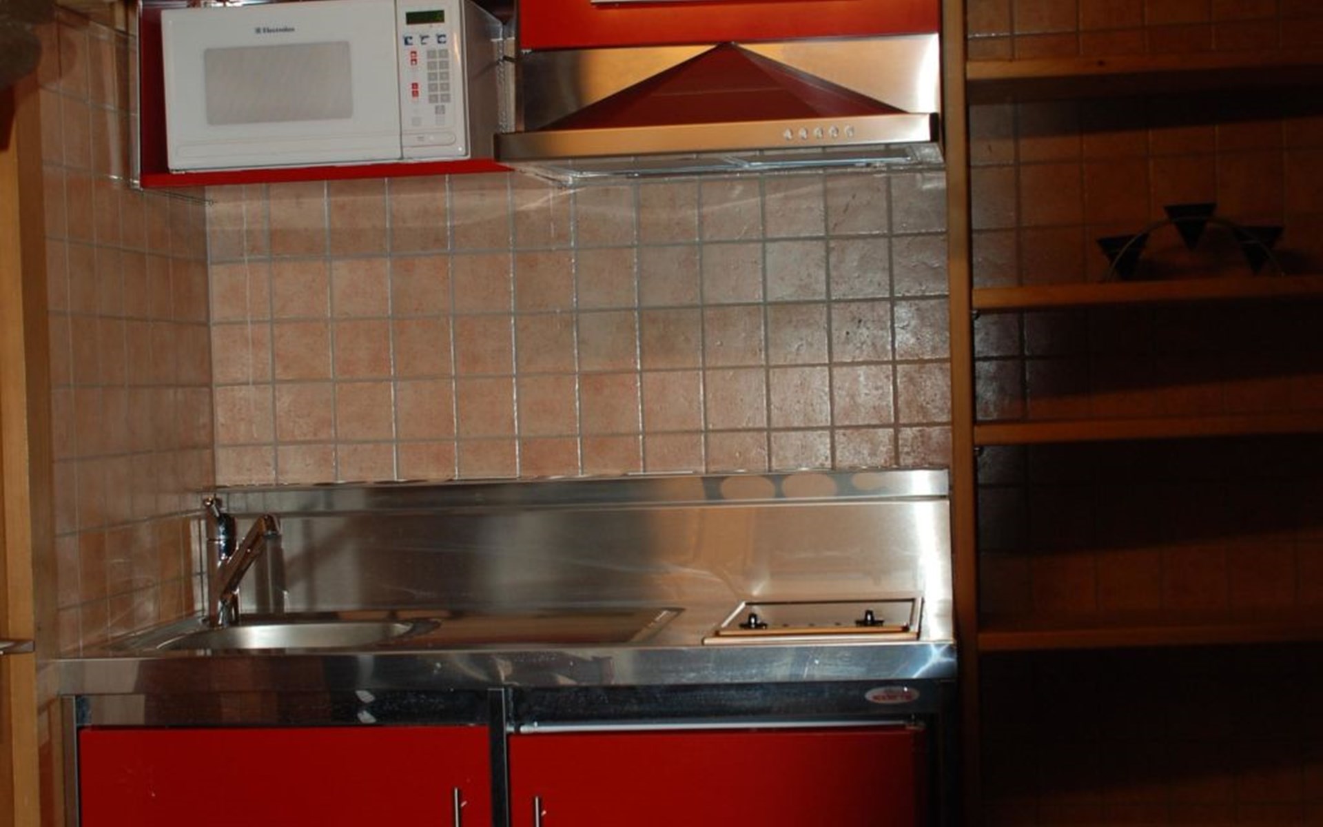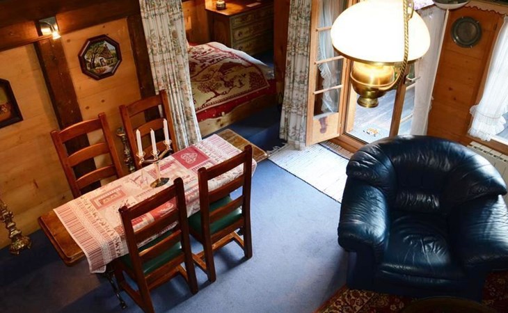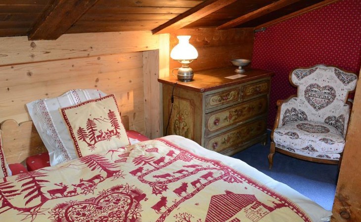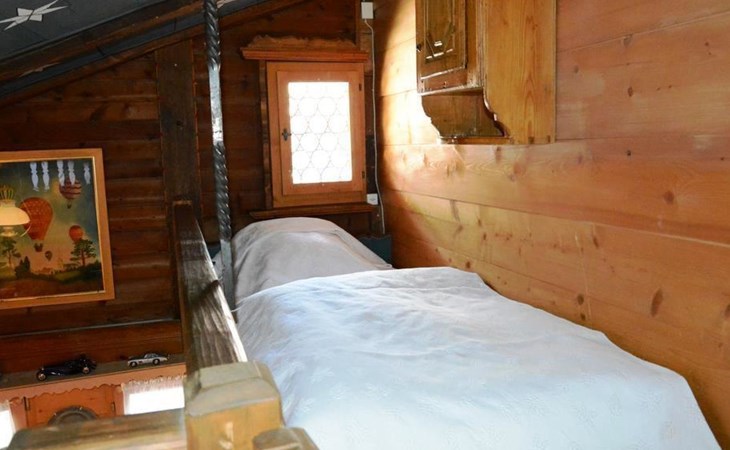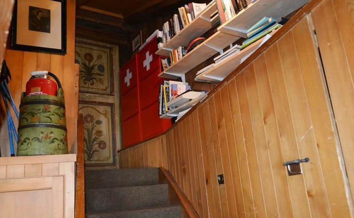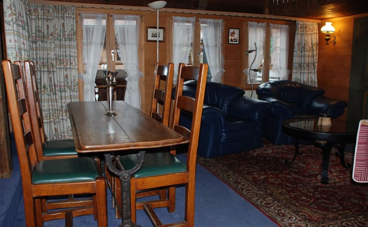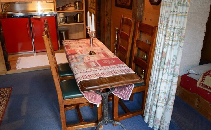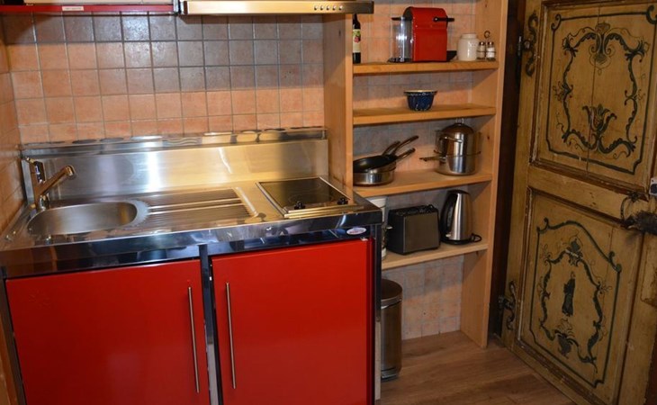 Wohn-/Esszimmer mit 2 Sesseln, Salontisch, Esstisch und Flachbildschirm-TV. WiFi. Kleine offene Küche mit Kitchenette (2 Herdplatten, Kapsel-Kaffeemaschine (Nespresso), Fondue- und Raclette-Set). Ein vom Wohnzimmer mit einem Vorhang abgetrenntes kleines Schlafzimmer in Dachschräge mit Doppelbett (180x200cm), kleinem Schrank und Kommode. 2 Einzelbetten (90x190cm) auf der Galerie (nicht für Kleinkinder geeignet). Eine schmale Klapptreppe ohne Geländer führt auf die Galerie. 1 Badezimmer mit WC und Dusche. Kleiner Balkon mit Gartenmöbeln, Abstellraum für Ski- und Sportgeräte.
