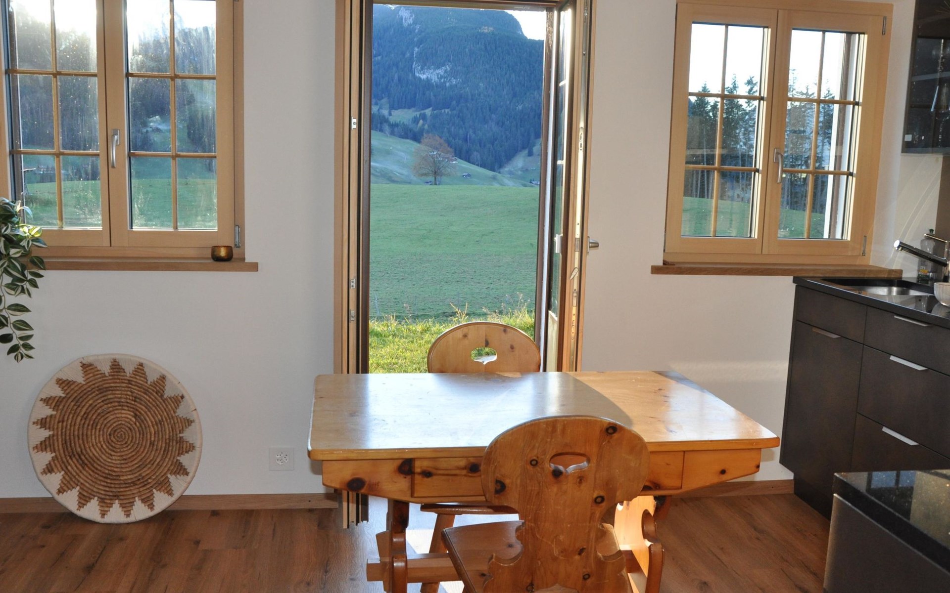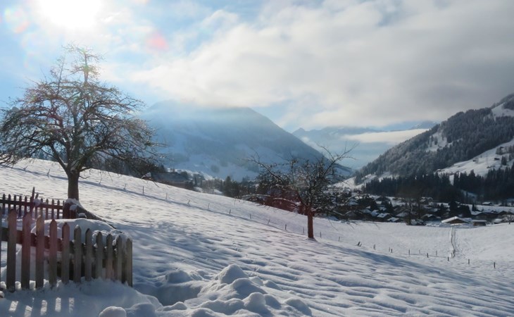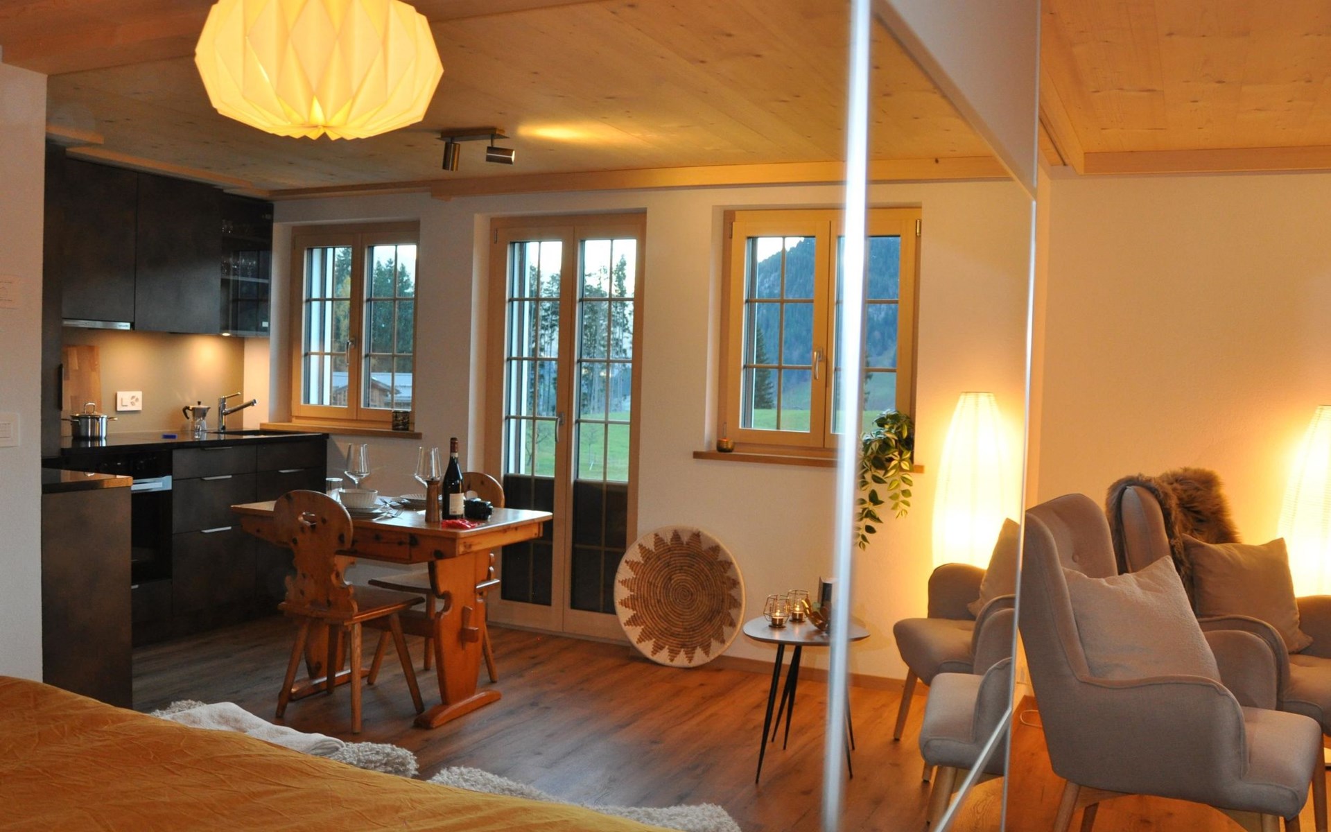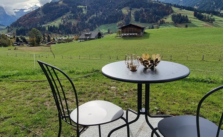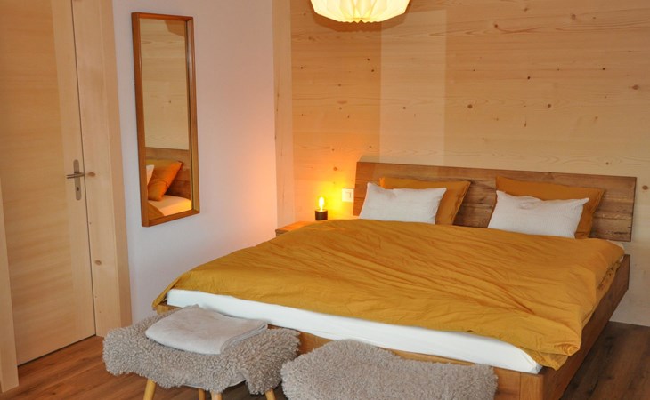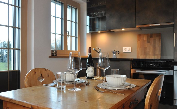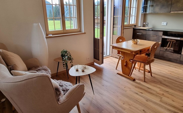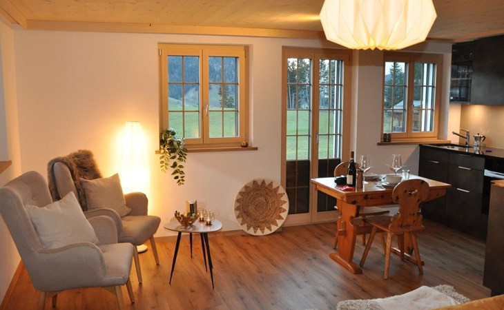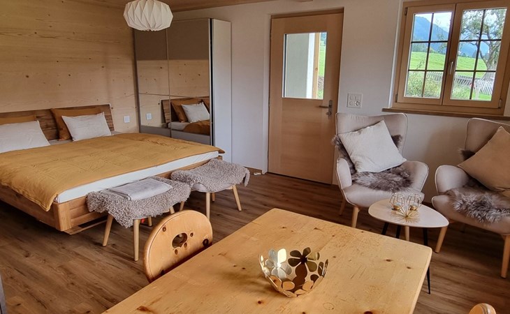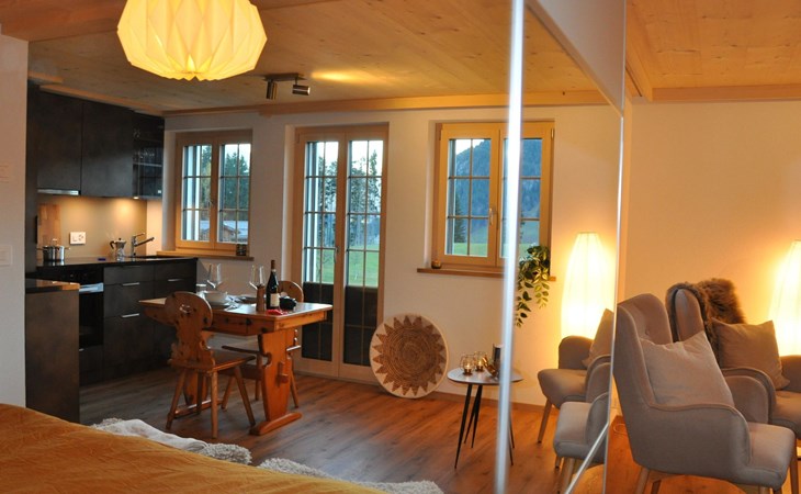 Neu, stivoll und mit viel Liebe eingerichtetes Studio. Helles Zimmer mit Blick in die Berge und auf die Weiden. Das Studio hat eine offene Küche (Induktionsherd, Backofen, Kühlschrank, Geschirrspülmaschine, Kapsel-Kaffeemaschine (Nespresso), sowie Fondue- und Raclette-Set), Esstisch mit 2 Stühlen, 2 Sessel und ein Bett (180x200cm). 1 Badezimmer mit begehbarer Dusche, Lavabo mit Spiegelschrank und WC. Individuell regulierbare Bodenheizung, WiFi.