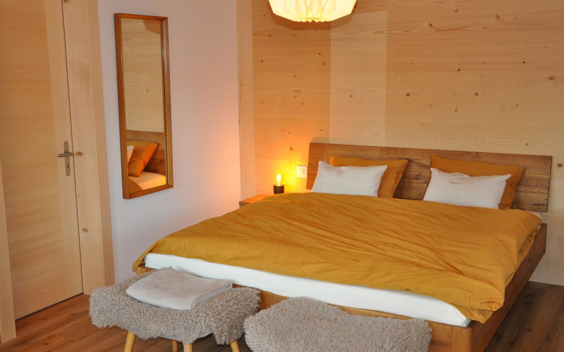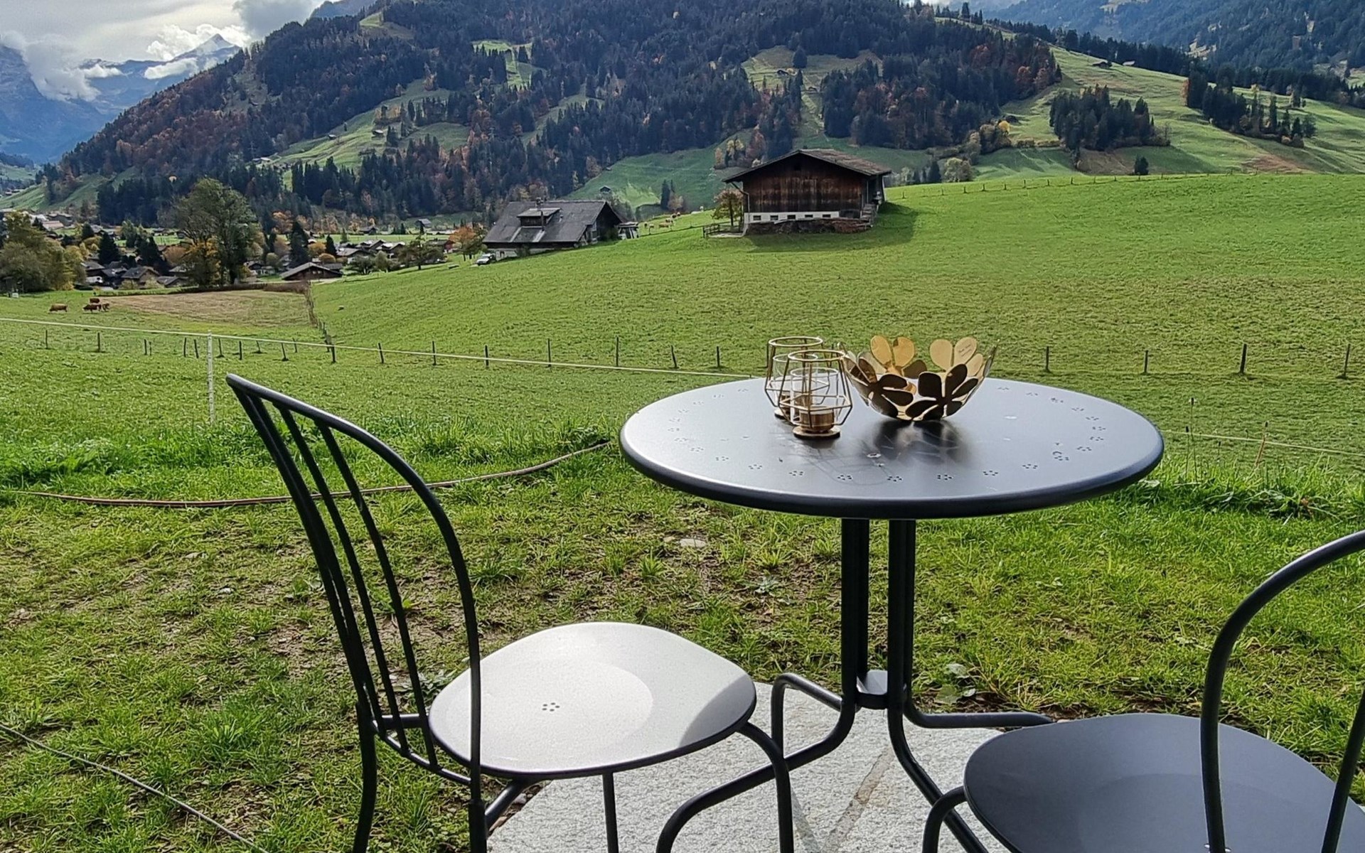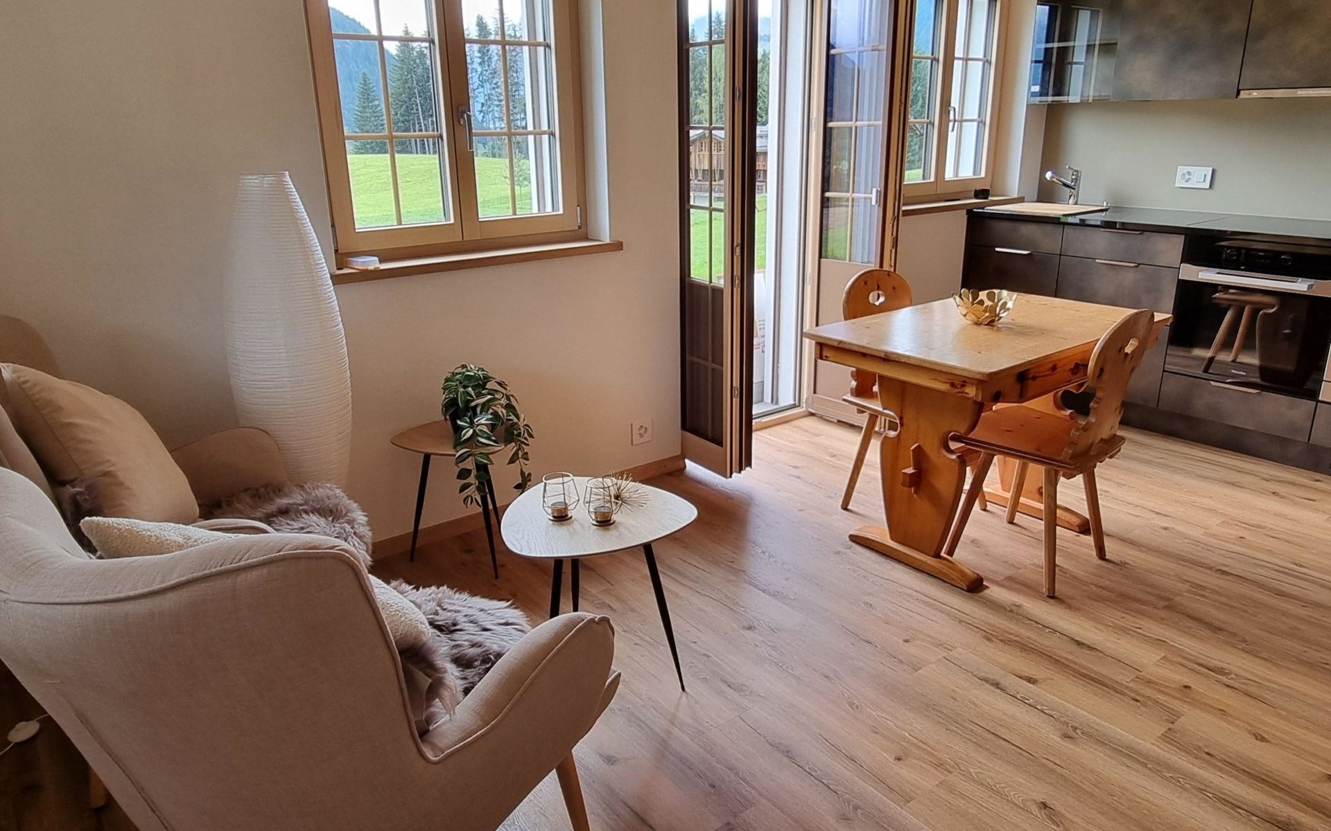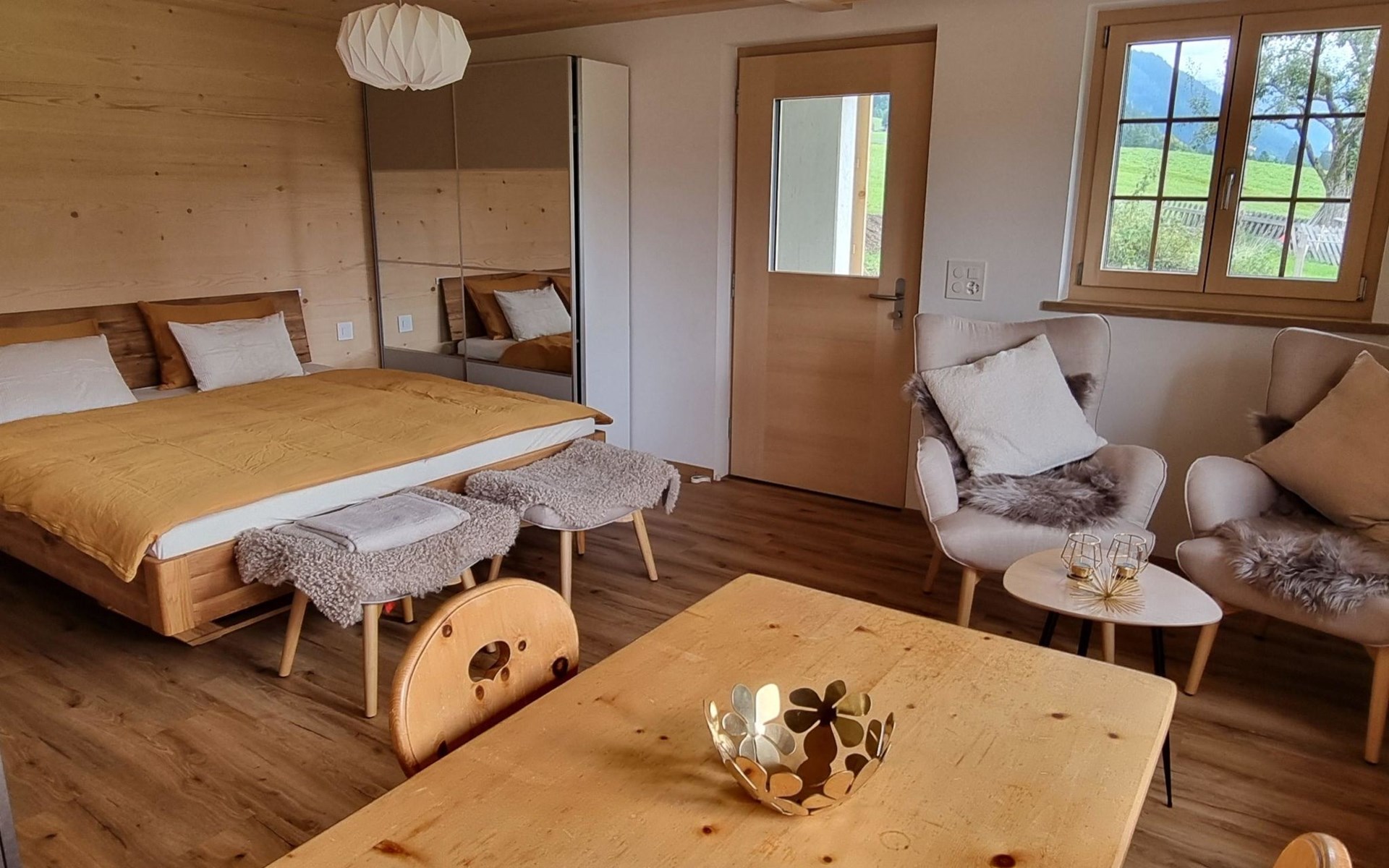 Neu, stivoll und mit viel Liebe eingerichtetes Studio. Helles Zimmer mit Blick in die Berge und auf die Weiden. Das Studio hat eine offene Küche (Induktionsherd, Backofen, Kühlschrank, Geschirrspülmaschine, Kapsel-Kaffeemaschine (Nespresso), sowie Fondue- und Raclette-Set), Esstisch mit 2 Stühlen, 2 Sessel und ein Bett (180x200cm). 1 Badezimmer mit begehbarer Dusche, Lavabo mit Spiegelschrank und WC. Individuell regulierbare Bodenheizung, WiFi.