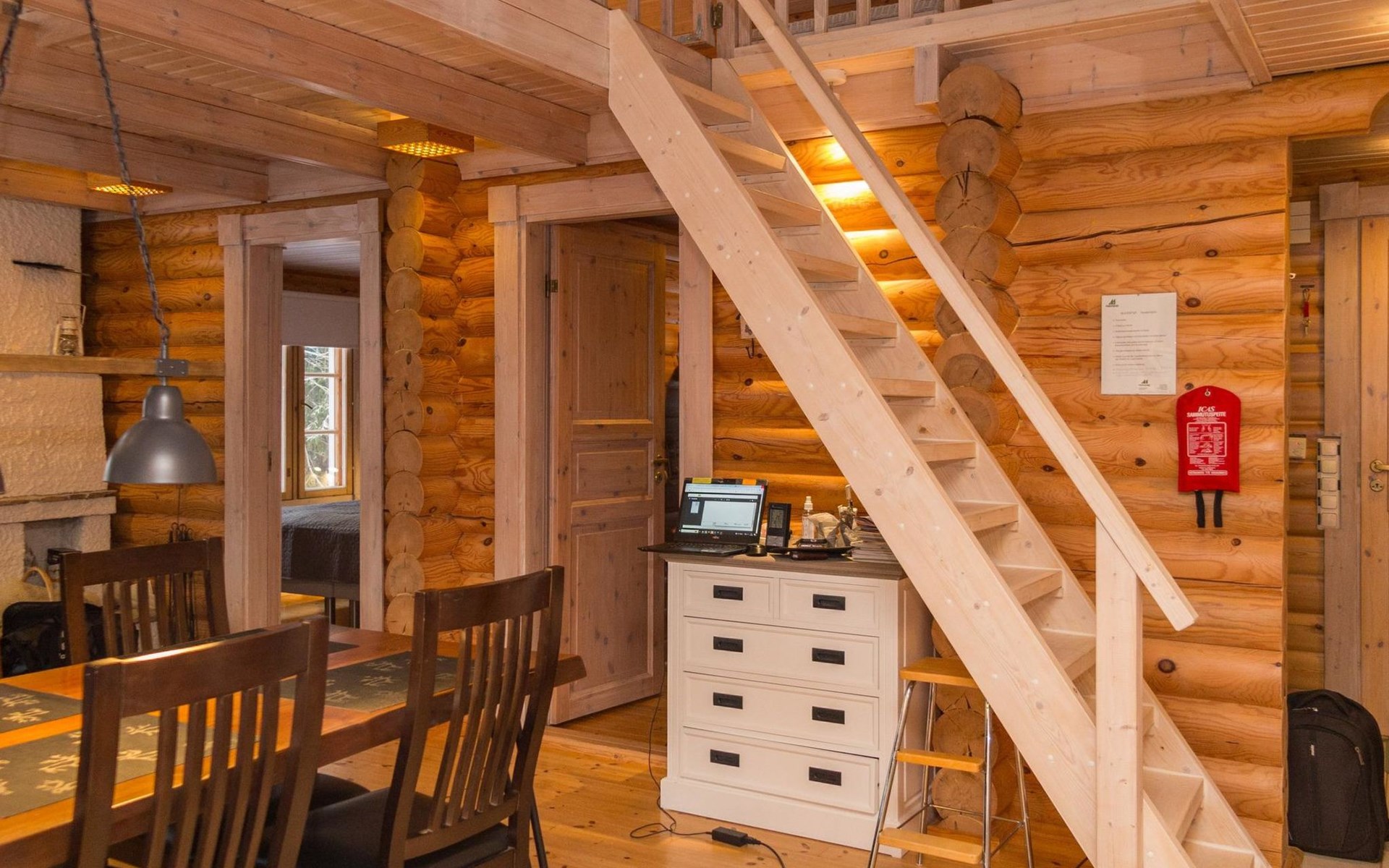 Log cabin, kitchen/living room, bedroom with a double bed, small bedroom with a bunk bed, double bed and 2 beds in the loft. As an alternative to the upper bed for the bunk bed, there is also an extra bed in the loft.