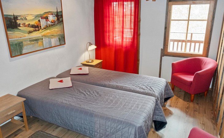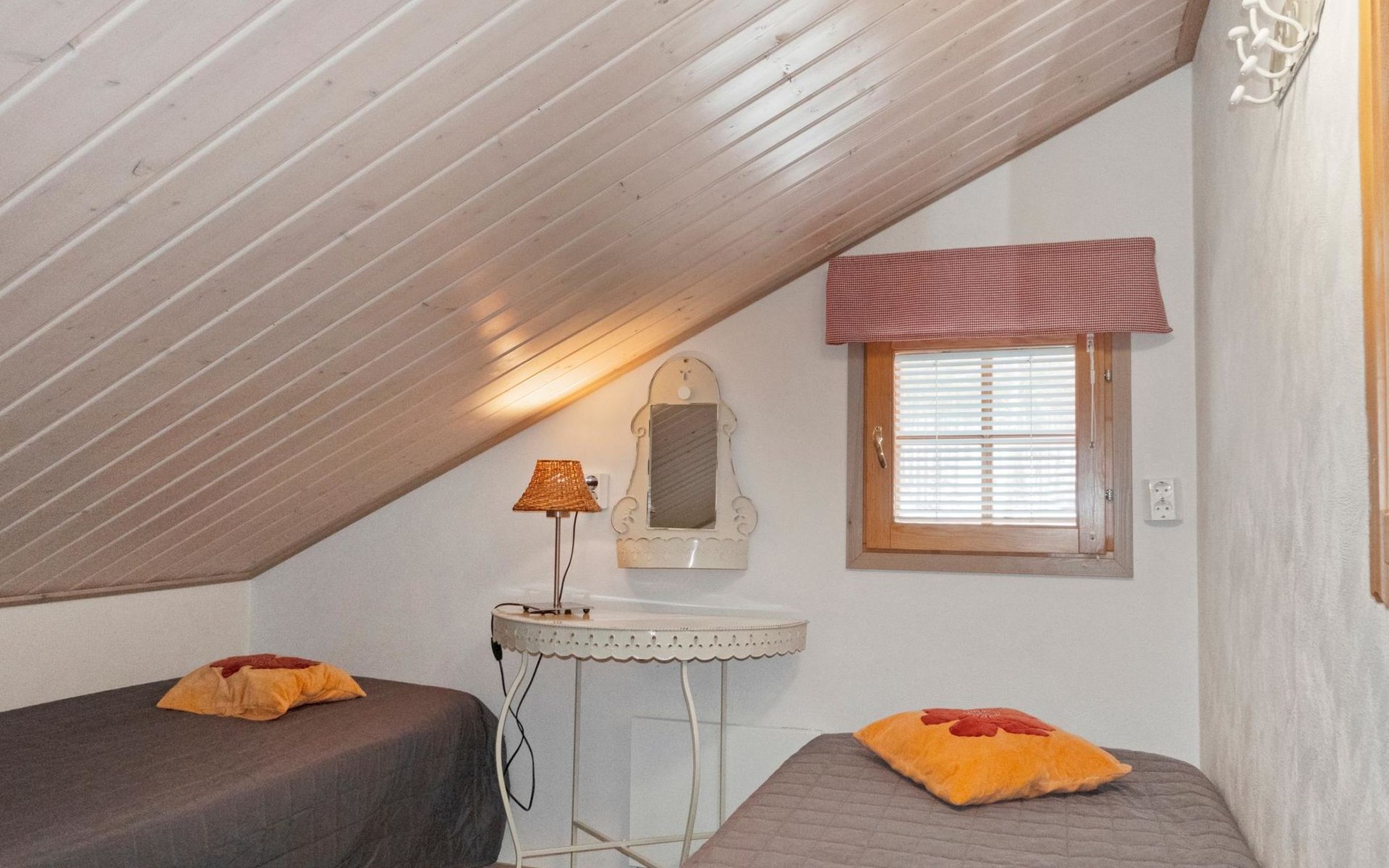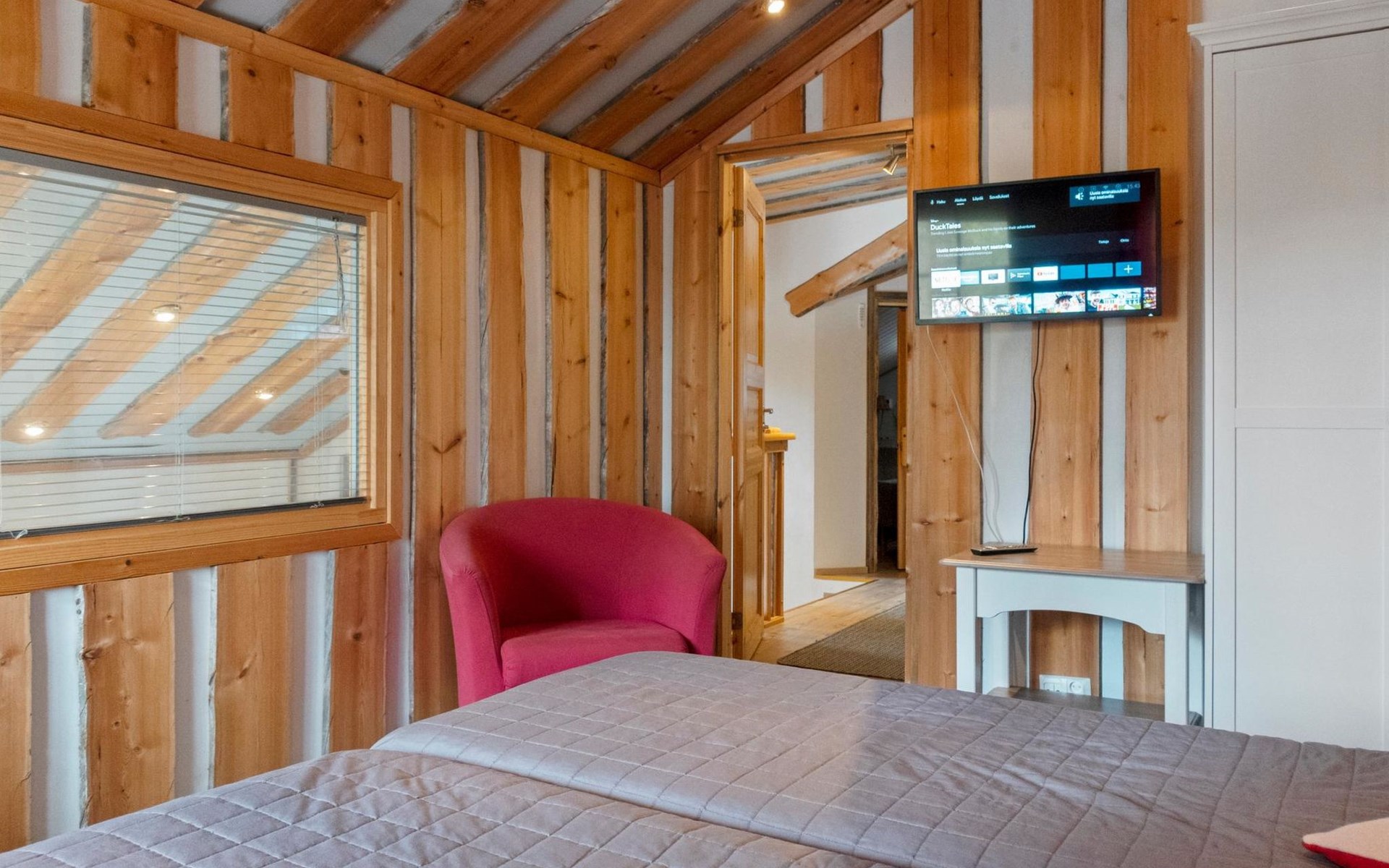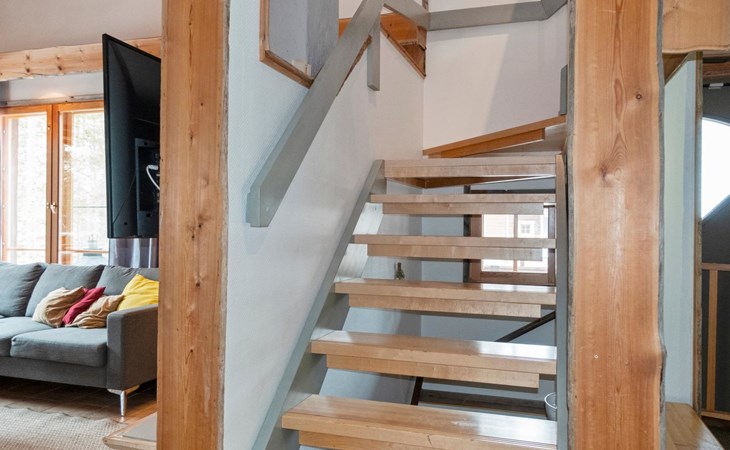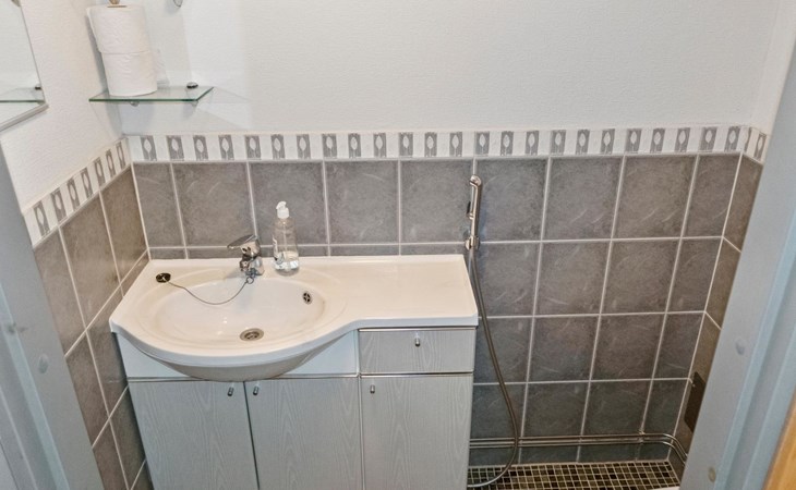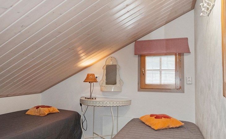 On the upper floor 2 bedrooms, both with 2 single beds, alcove with 2 single beds (folding door, sloping roof), WC and shower.