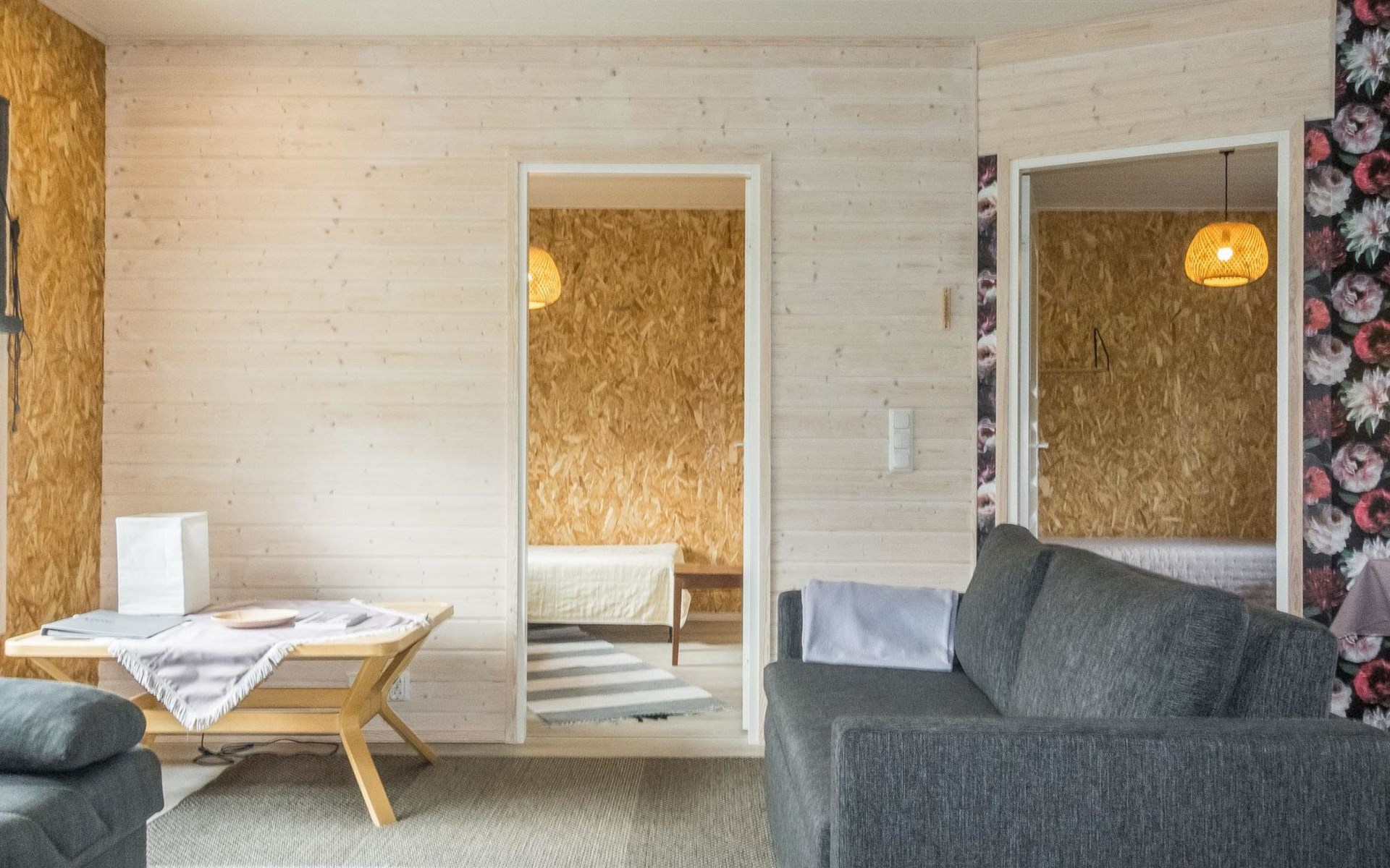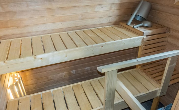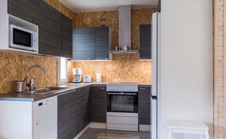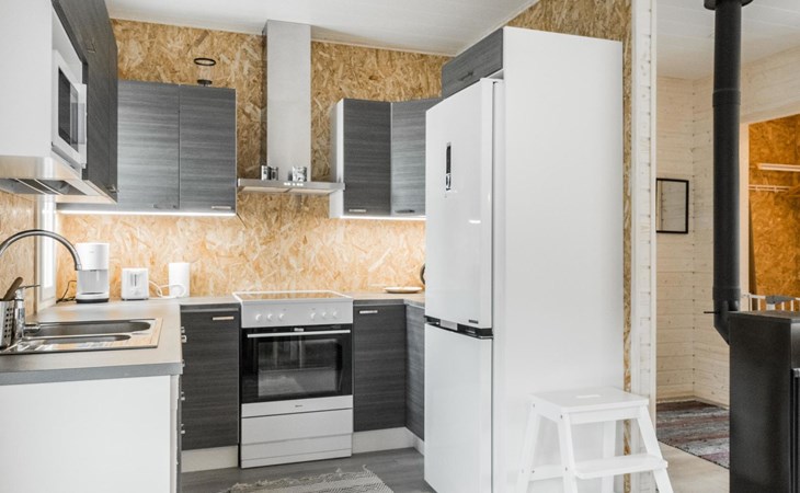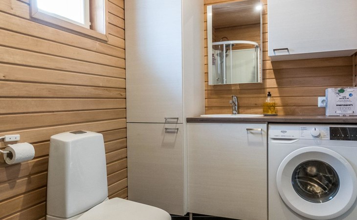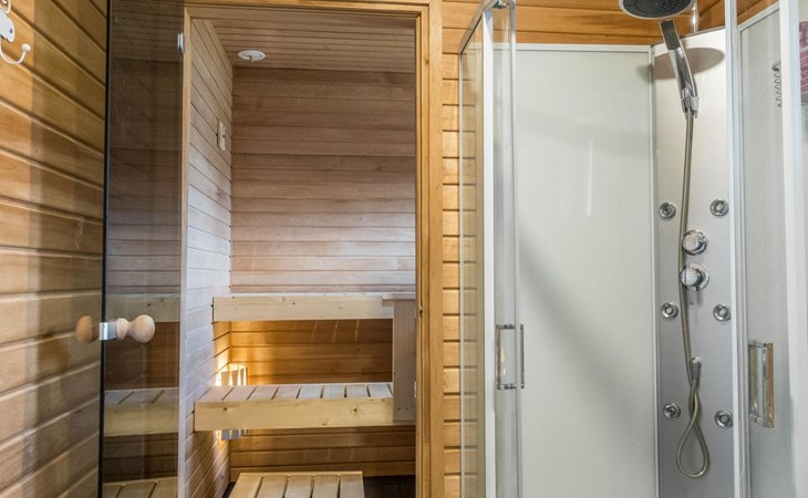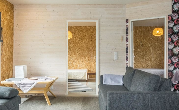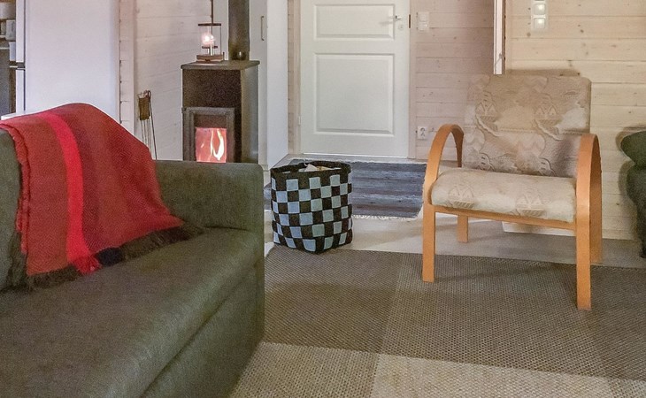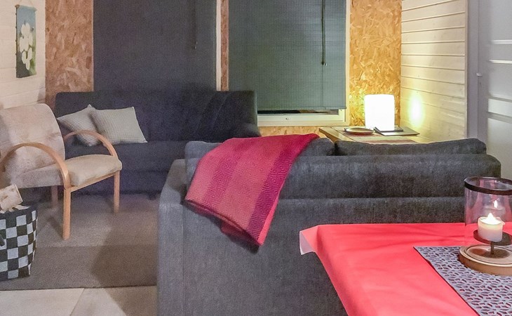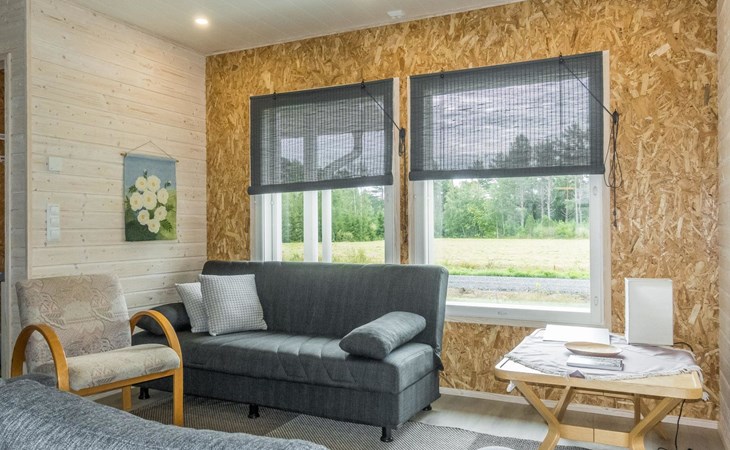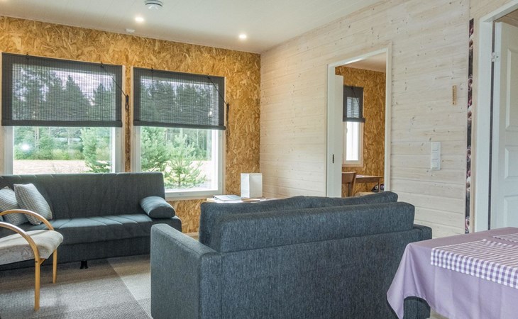 The house has a living room/kitchen, one bedroom with 2 beds and other bedroom with 1 bed. In the living area, there are two spreadable sofas, with widths of 160 cm and 110 cm when opened. Sauna and shower room/WC. No TV.