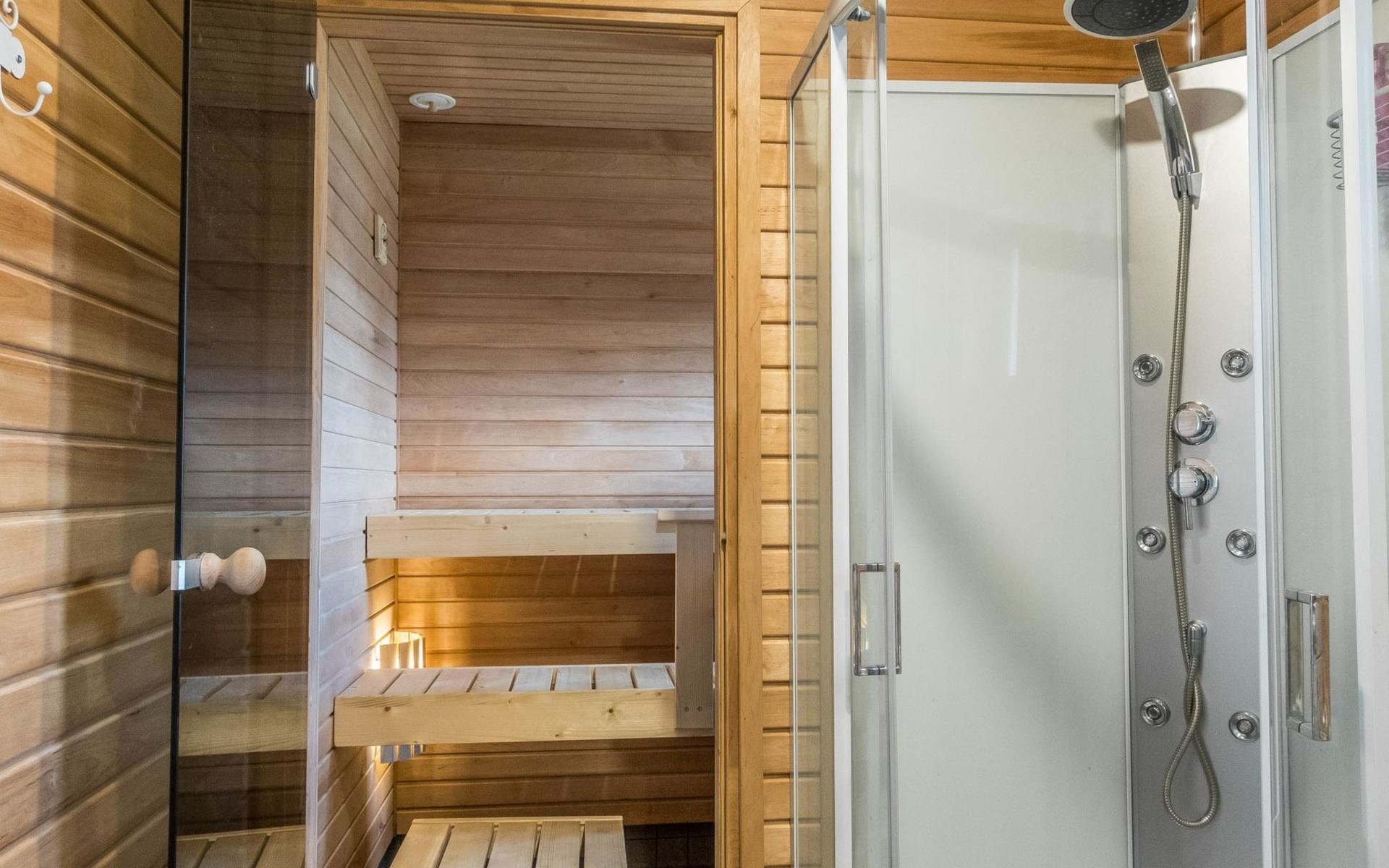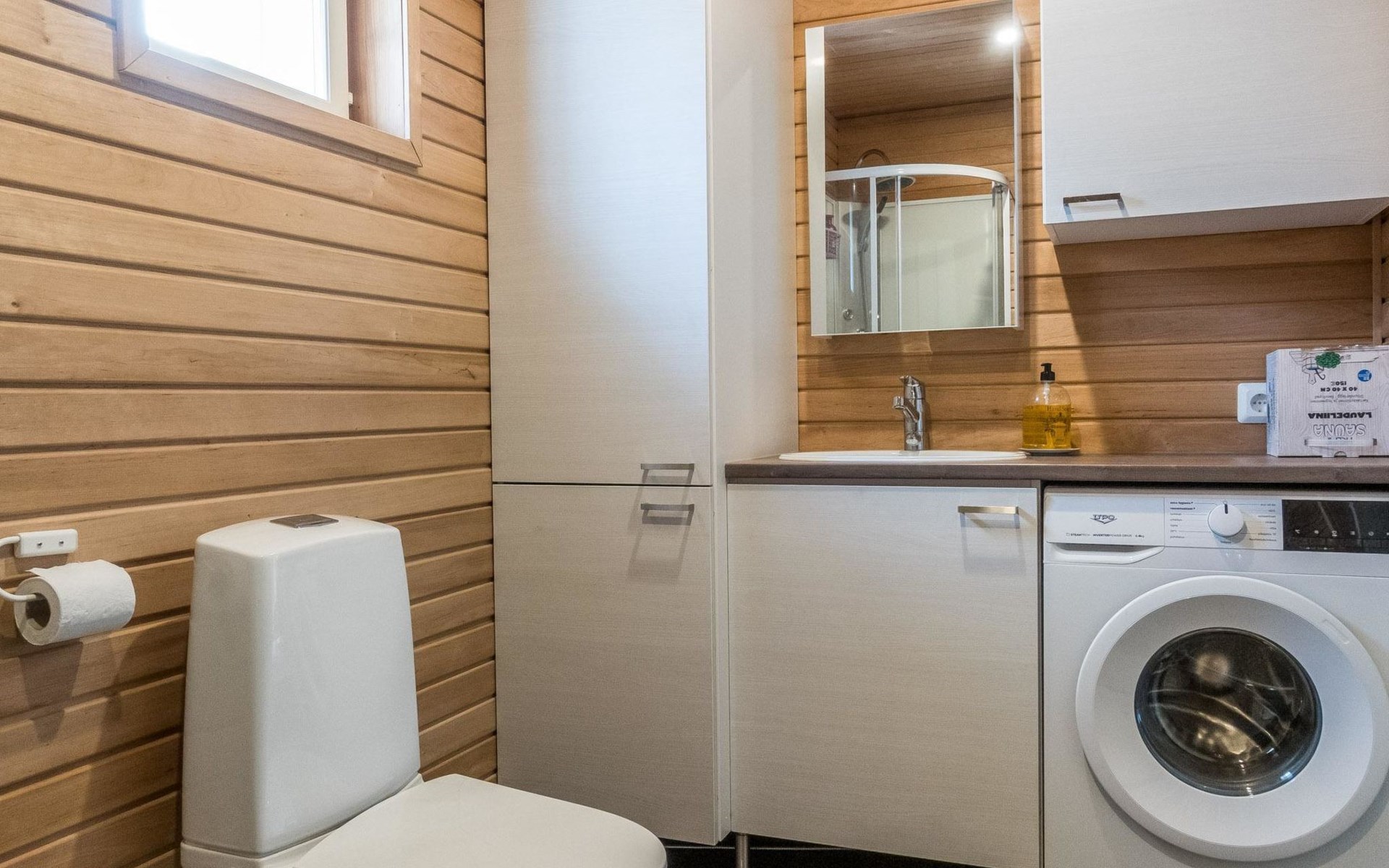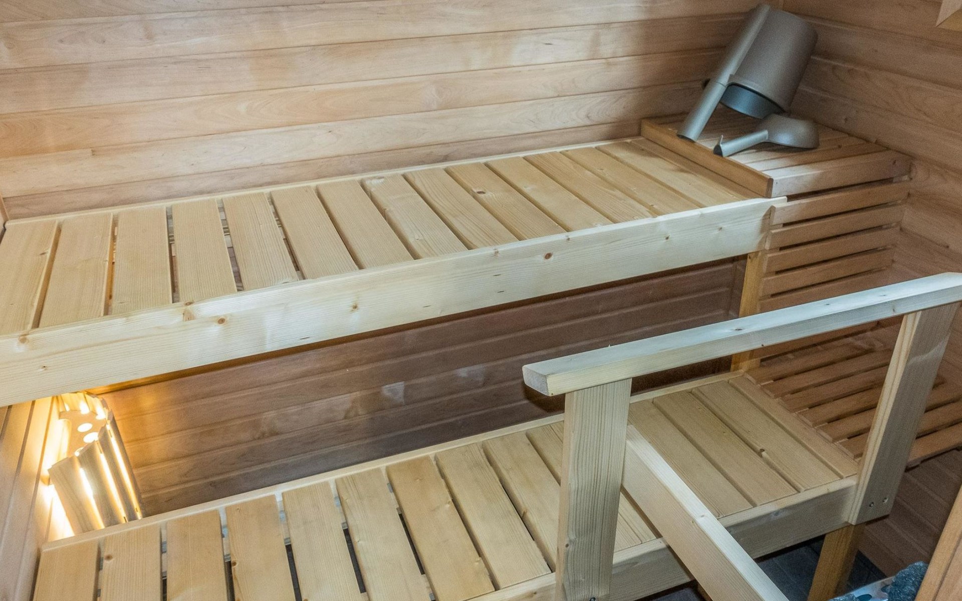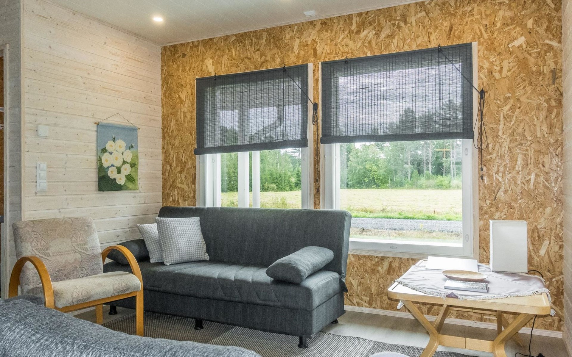 The house has a living room/kitchen, one bedroom with 2 beds and other bedroom with 1 bed. In the living area, there are two spreadable sofas, with widths of 160 cm and 110 cm when opened. Sauna and shower room/WC. No TV.
