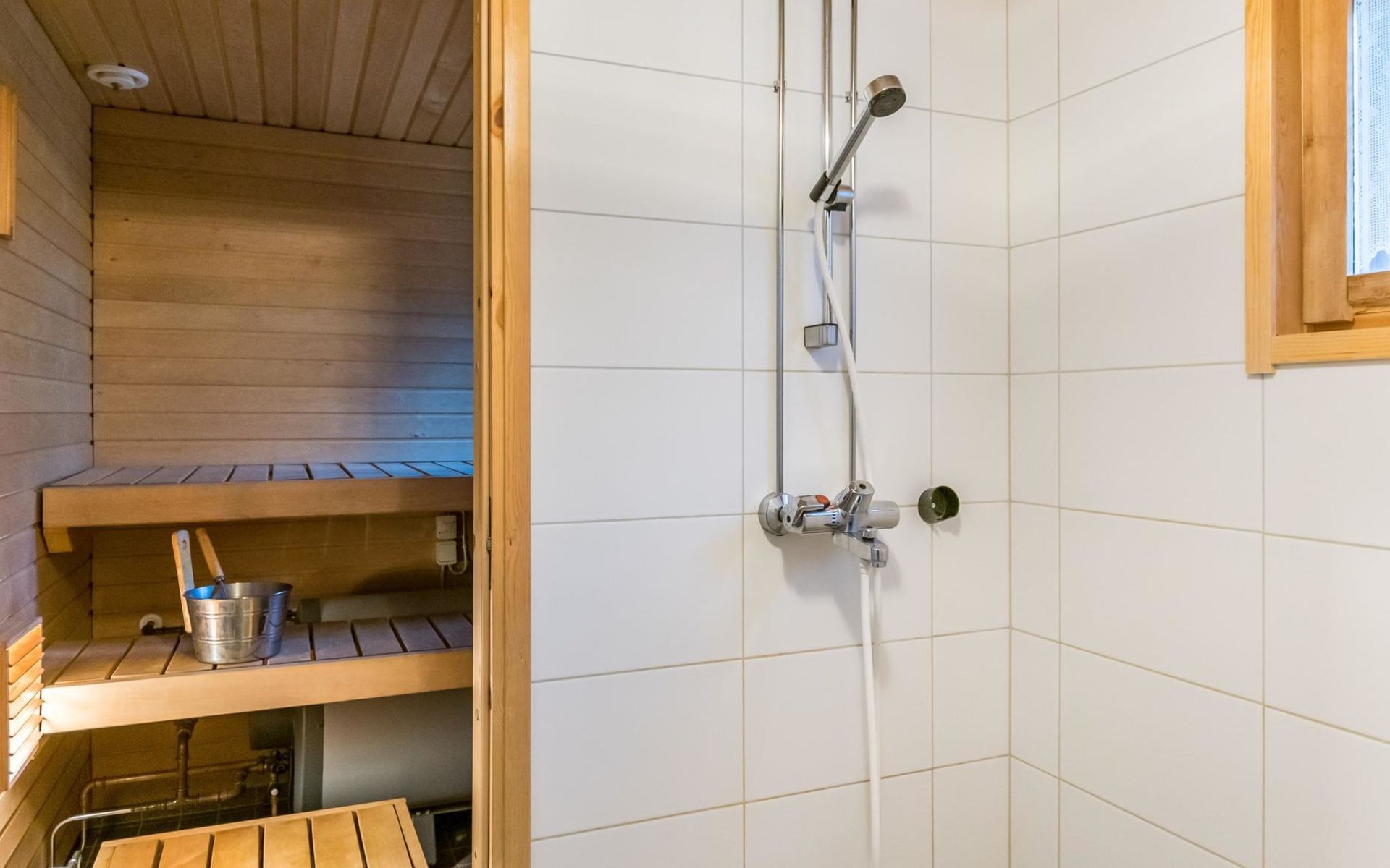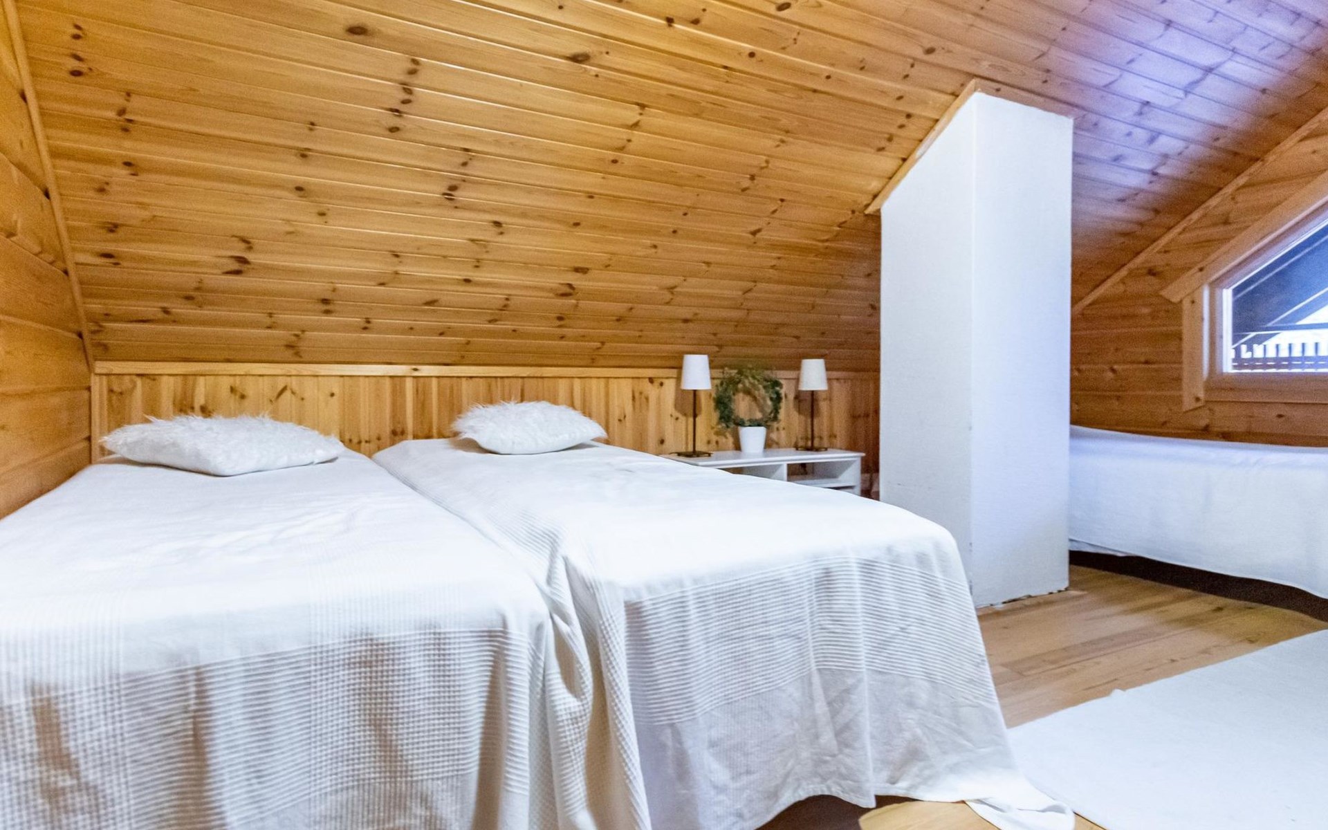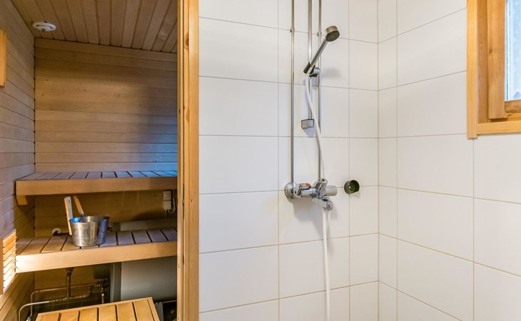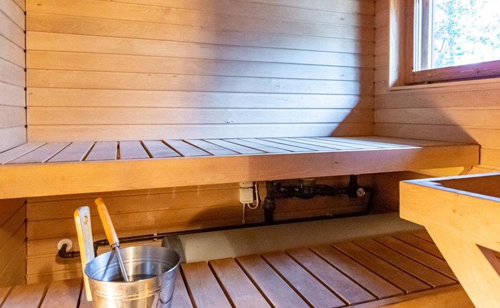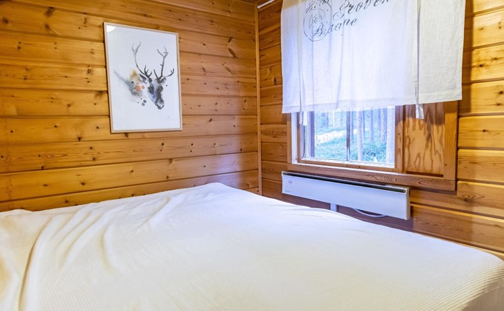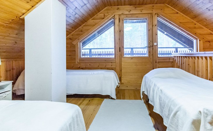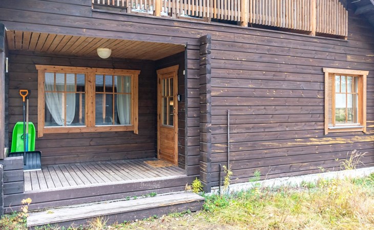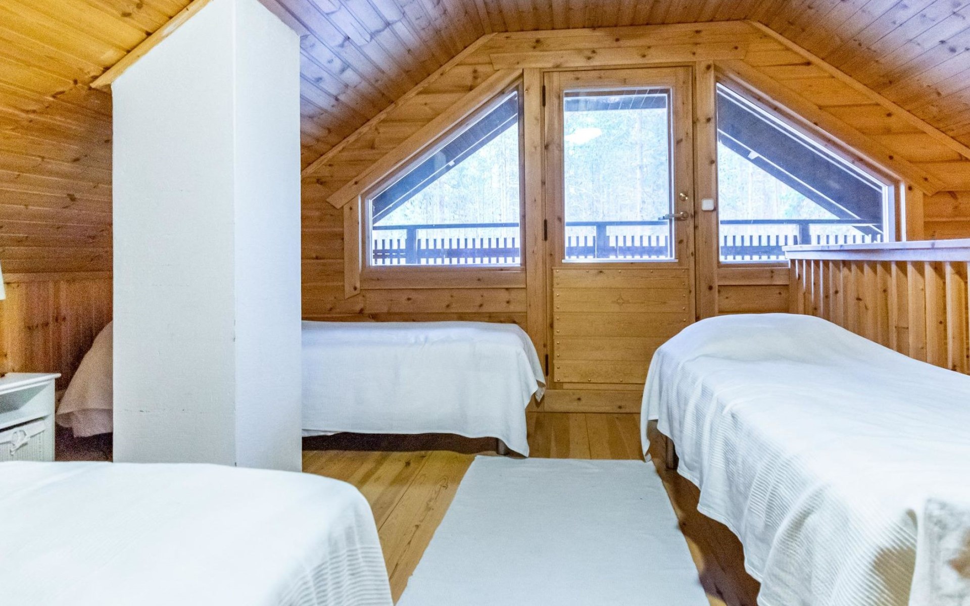 Semi-detached house with living room/kitchen, downstairs bedroom with double bed 160cm wide, toilet, washroom and sauna (electric stove), upstairs 4 beds (80cm), open porch.