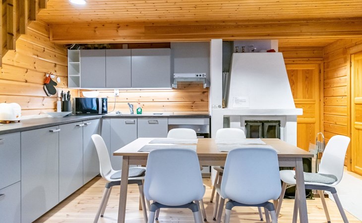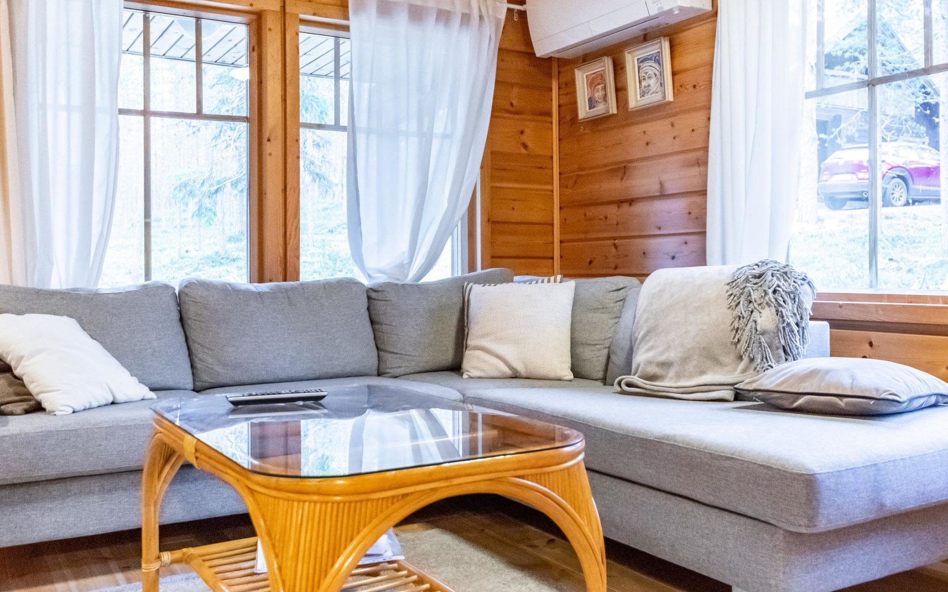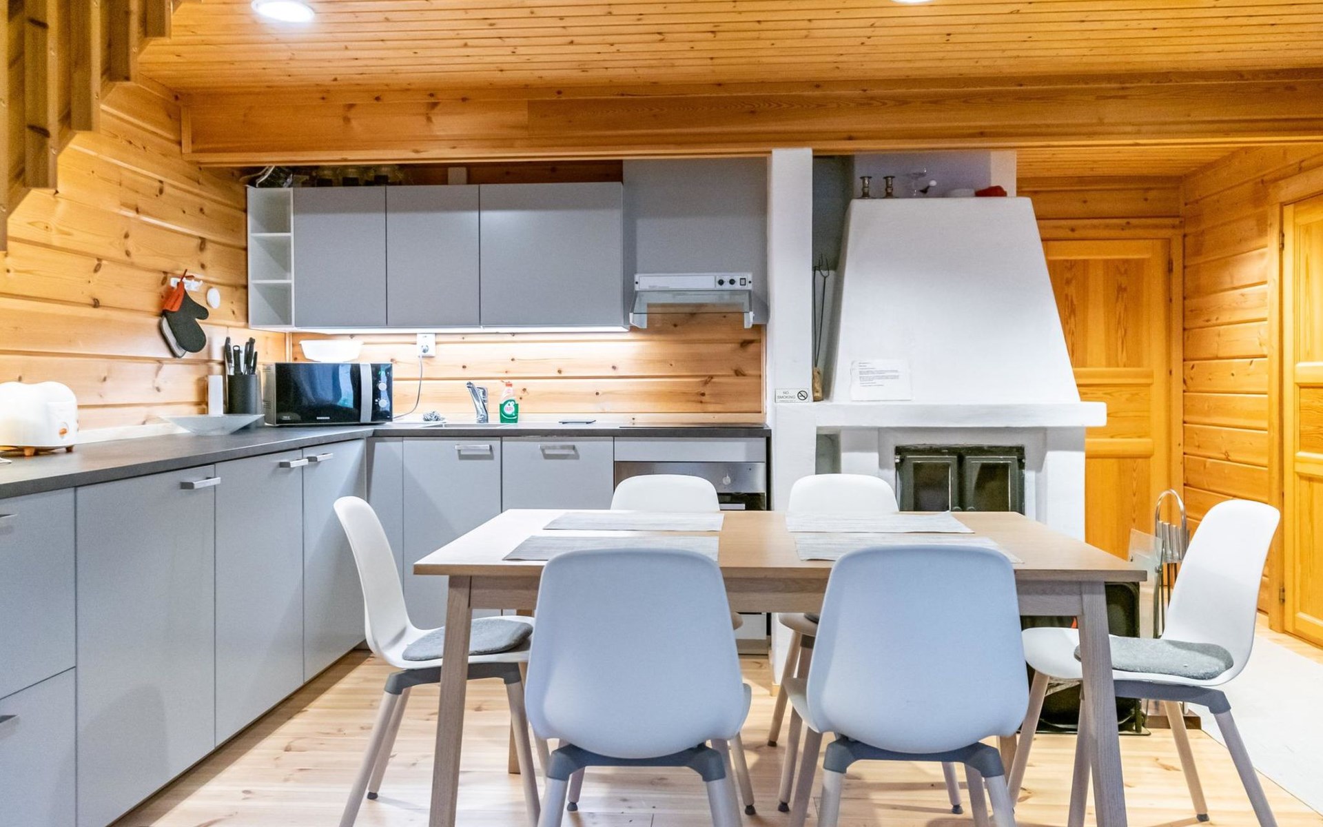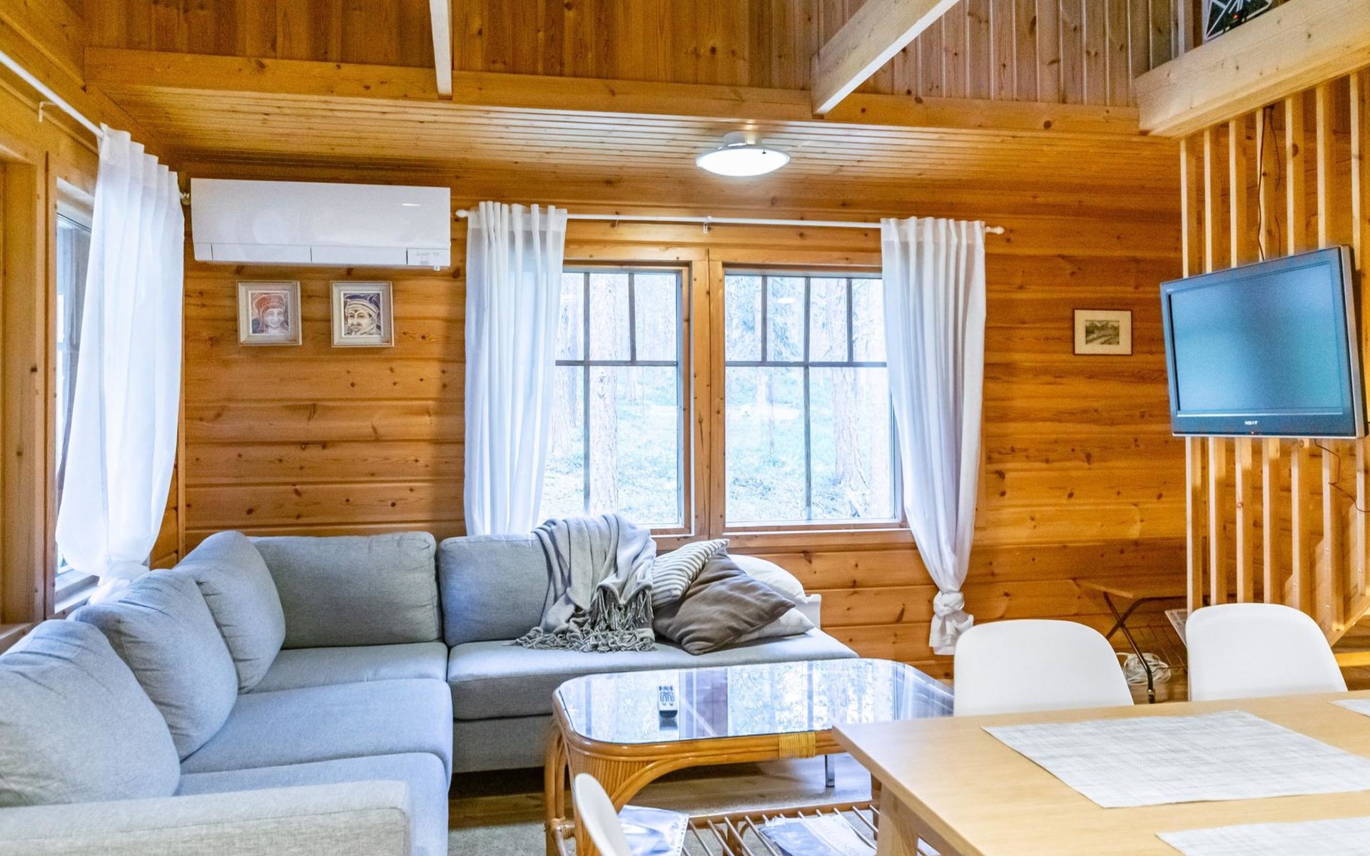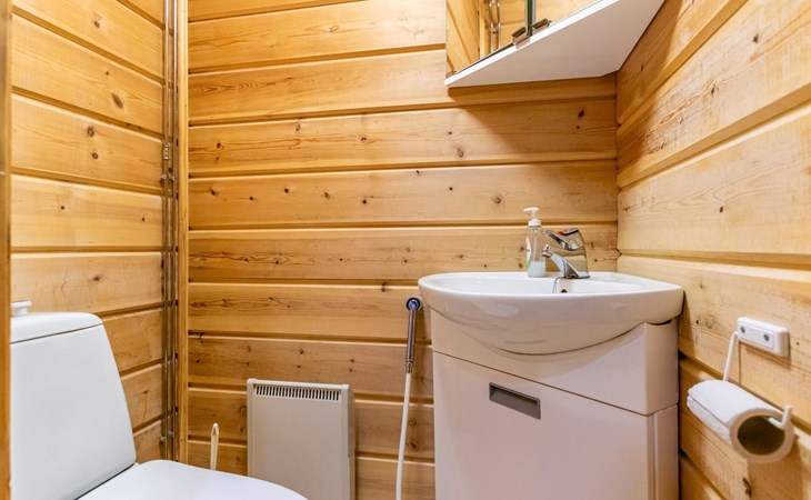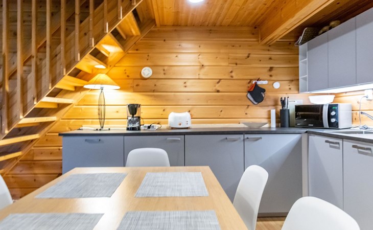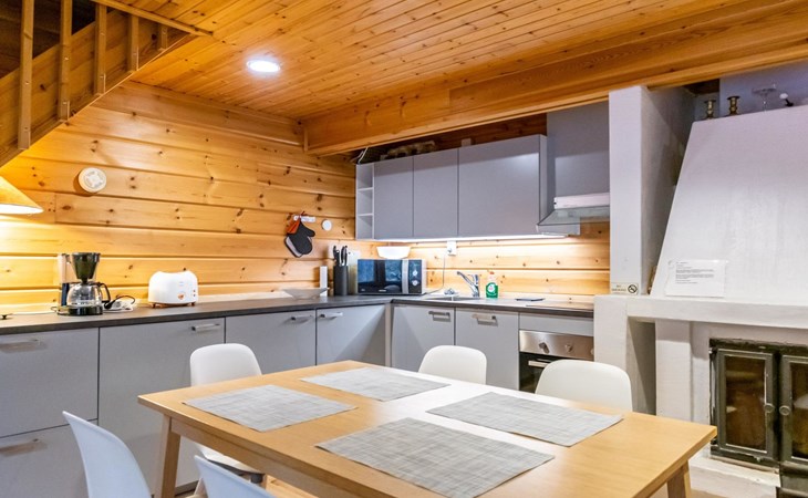 Semi-detached house with living room/kitchen, downstairs bedroom with double bed 160cm wide, toilet, washroom and sauna (electric stove), upstairs 4 beds (80cm), open porch.