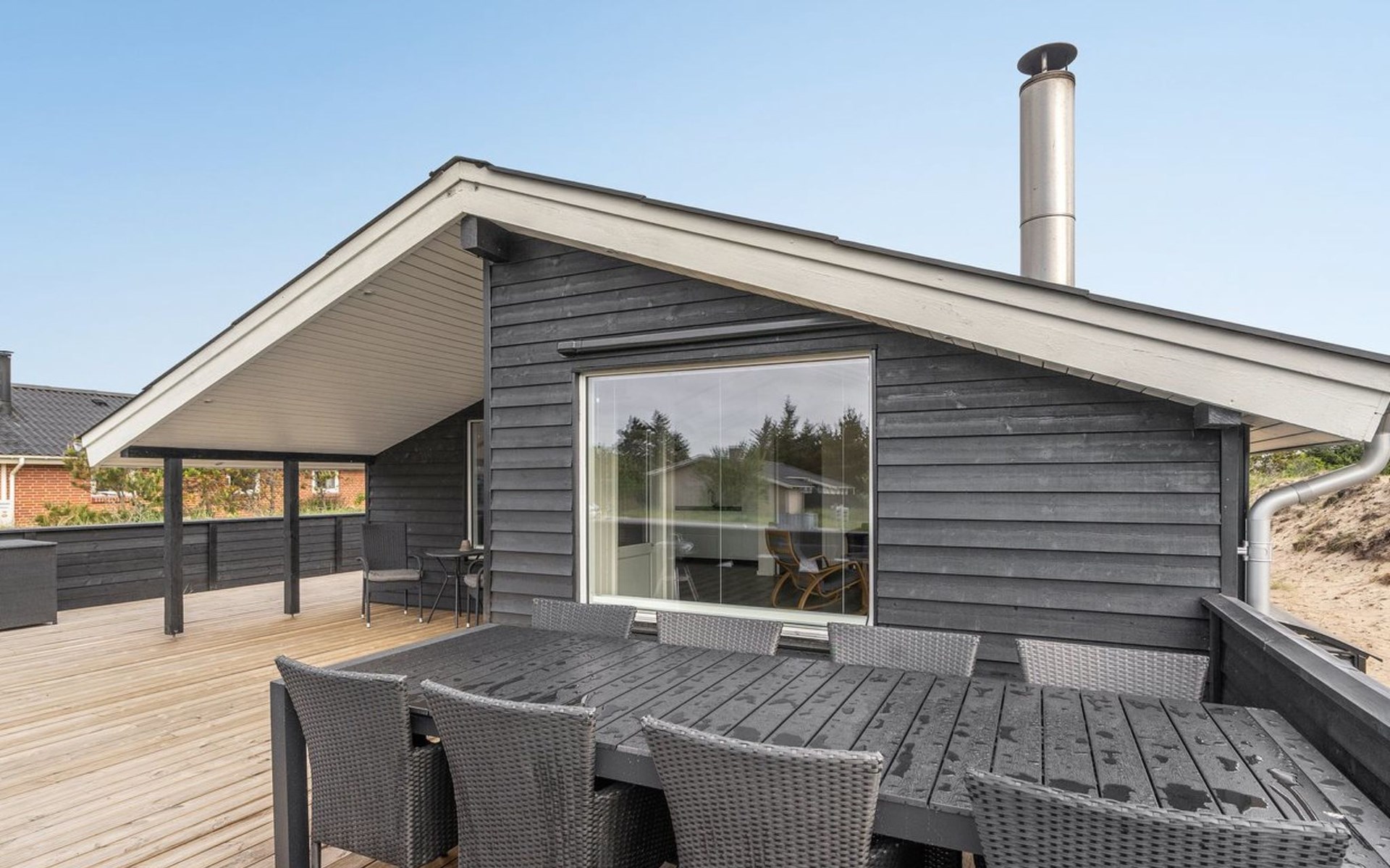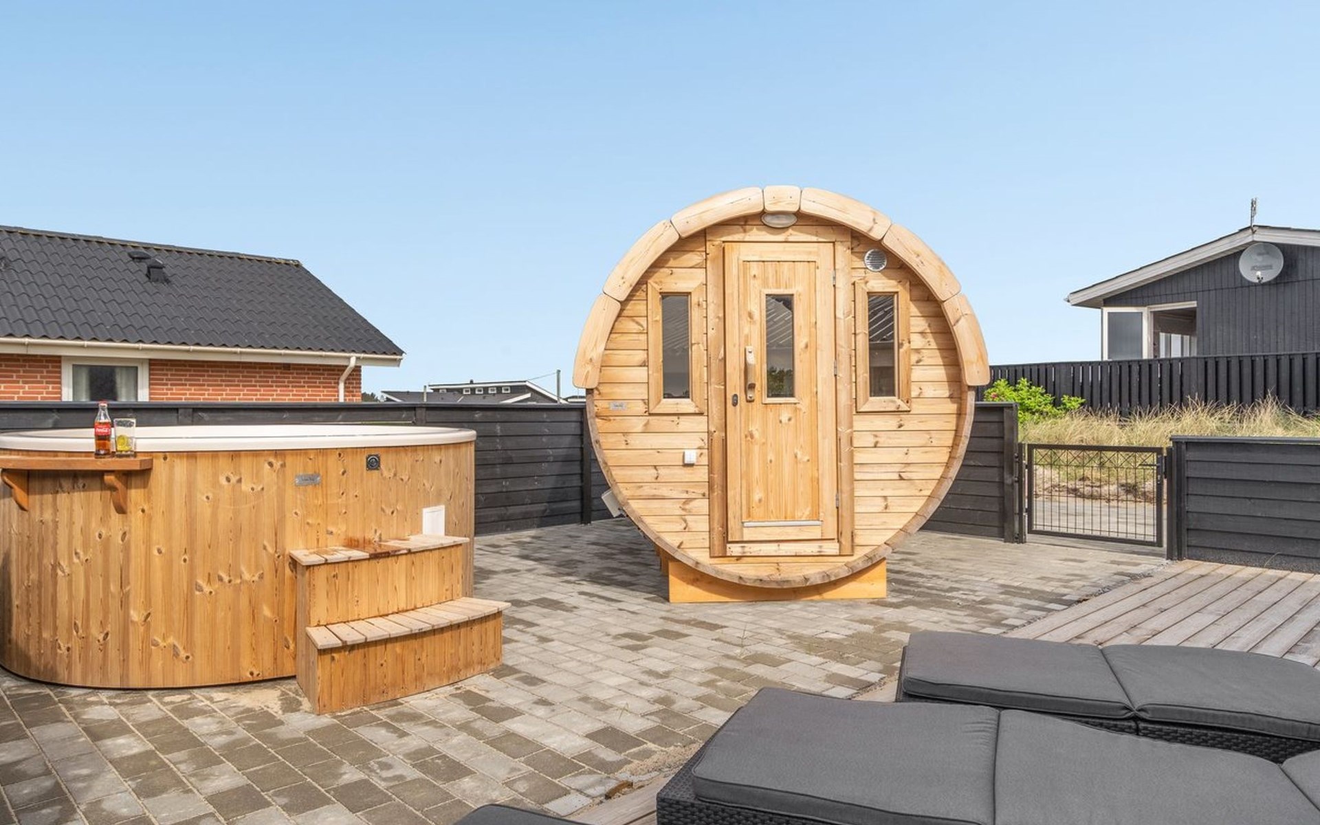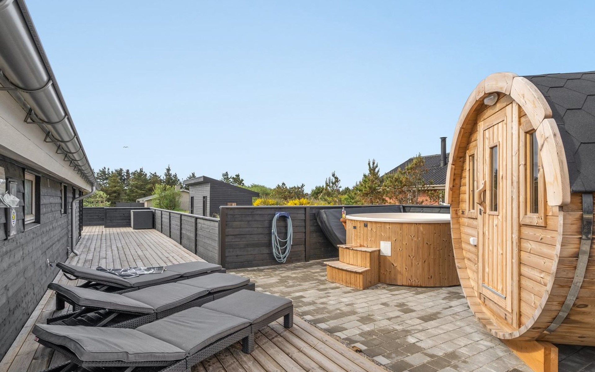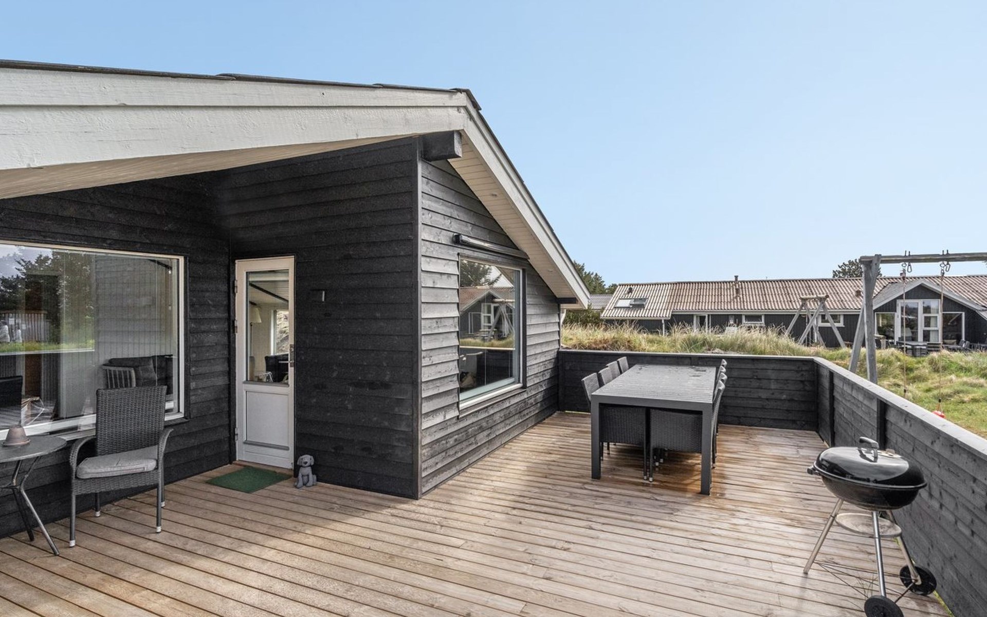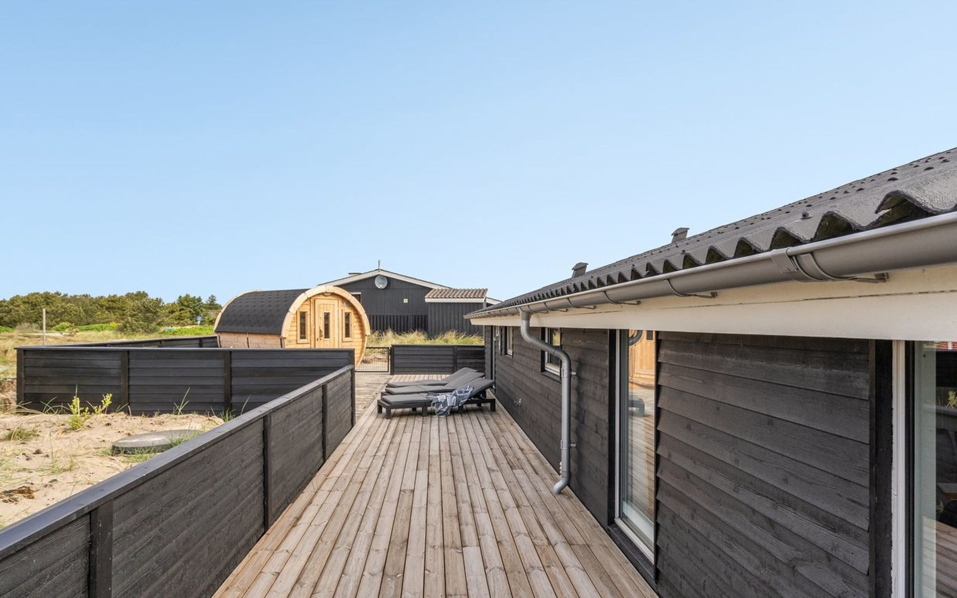 Einfamilienhaus, Baujahr 1984. 850 m vom Meer. Zur Alleinbenutzung: naturbelassenes Grundstück 1'251 m2. Terrasse (80 m2), Kinderspielplatz (Schaukel). Im Hause: Sauna, Waschmaschine, Wäschetrockner. Lebensmittelgeschäft 300 m. Der Besitzer akzeptiert keine Jugendgruppen.