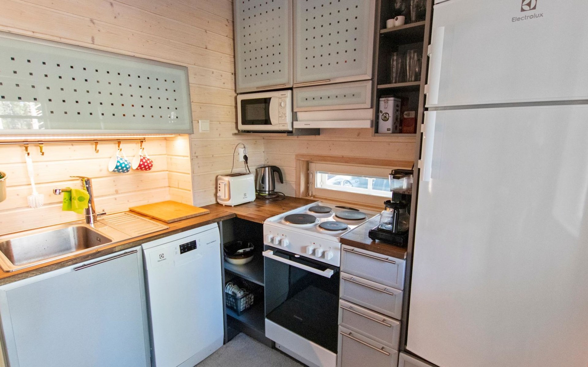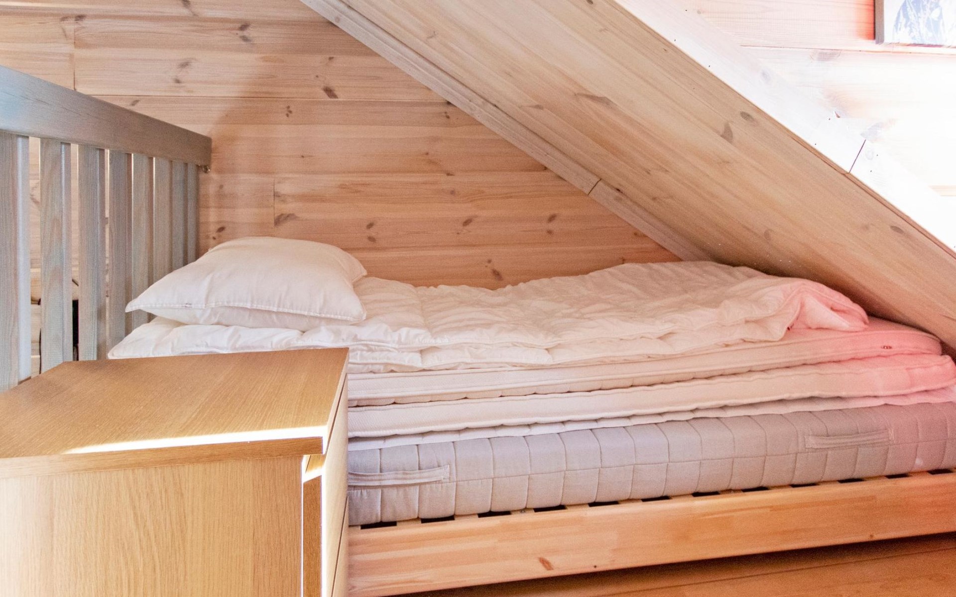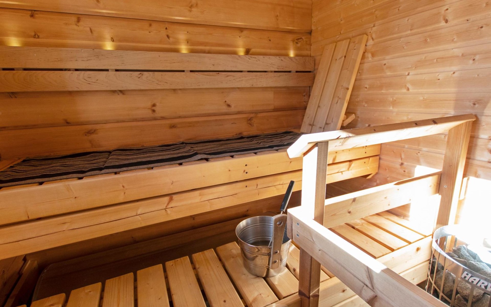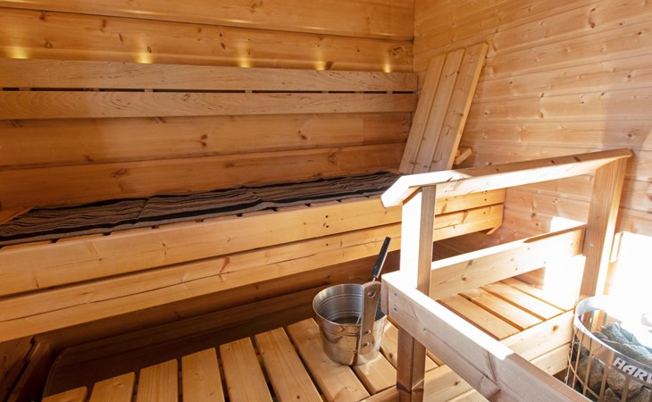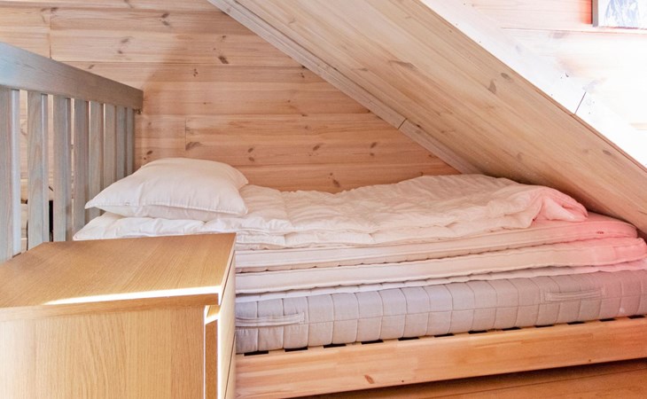 Living room/kitchen, 1 small bedroom (double bed), plus 2 extra beds in the loft (10m²). Sauna (electrically heated), shower, toilet.