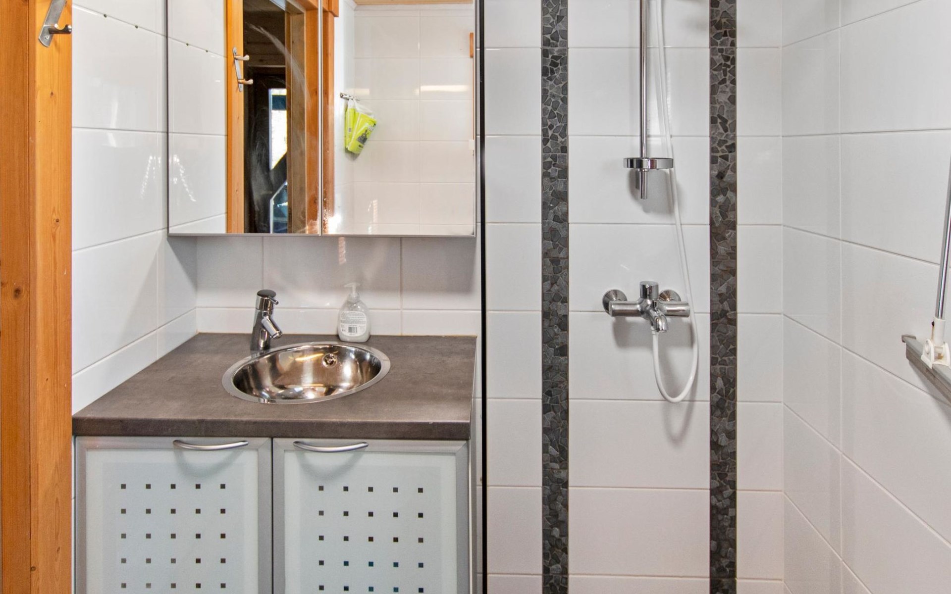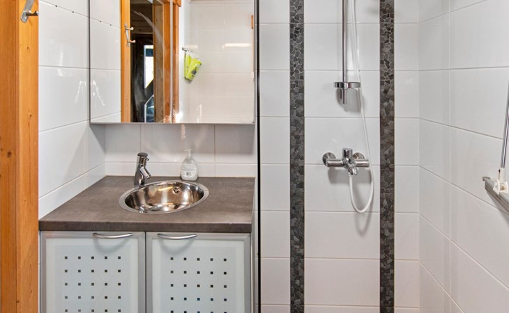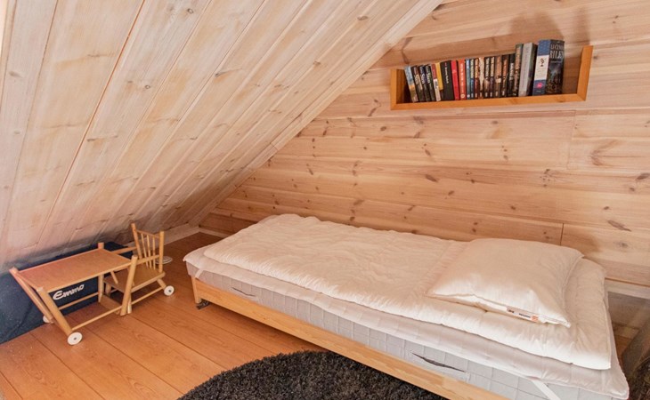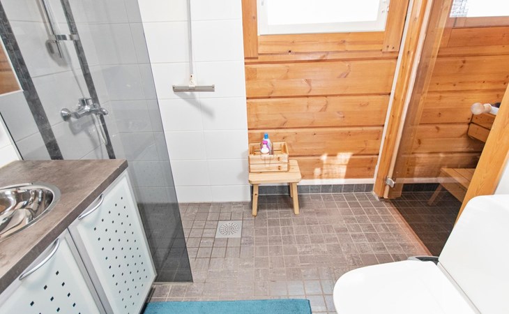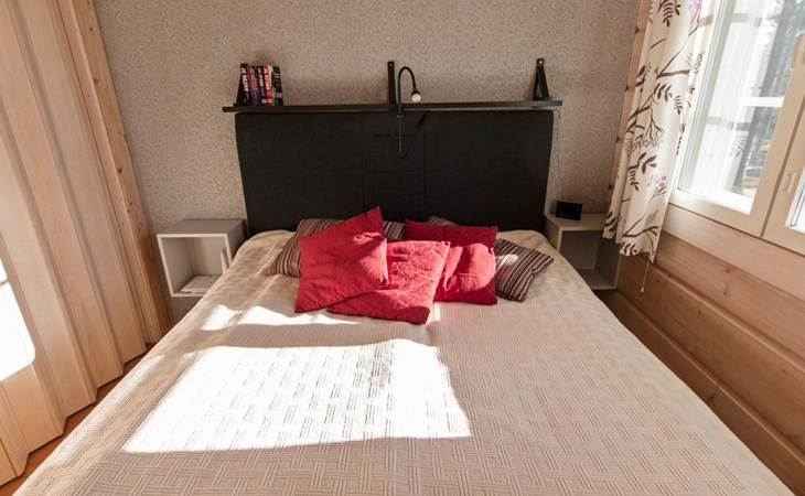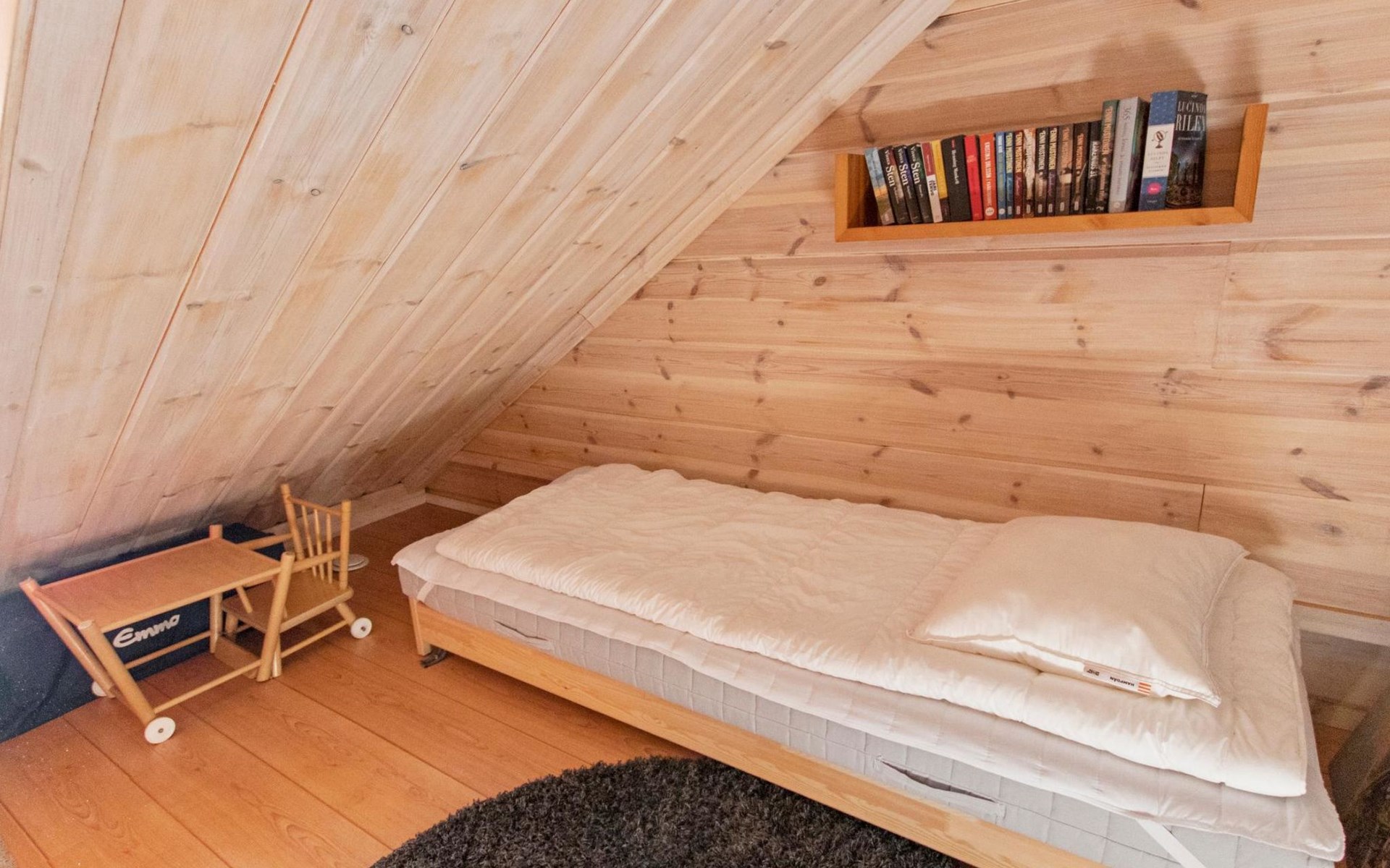 Living room/kitchen, 1 small bedroom (double bed), plus 2 extra beds in the loft (10m²). Sauna (electrically heated), shower, toilet.