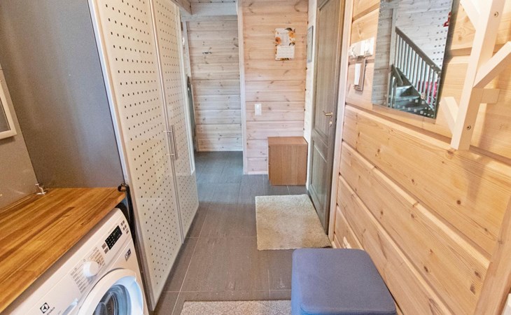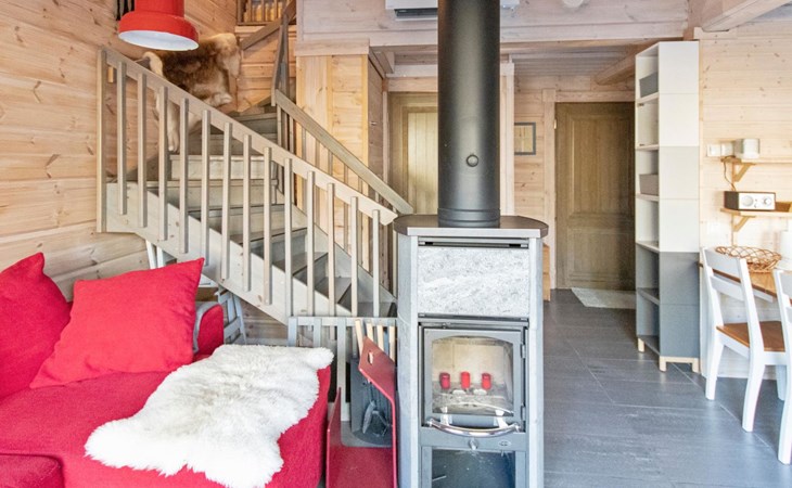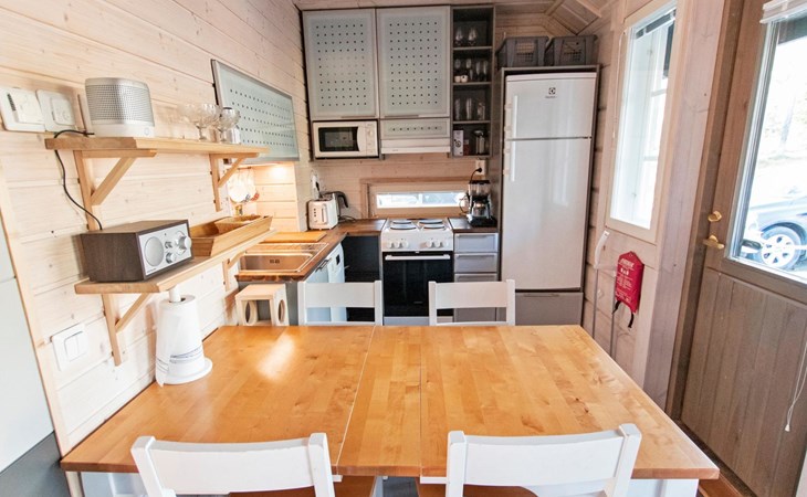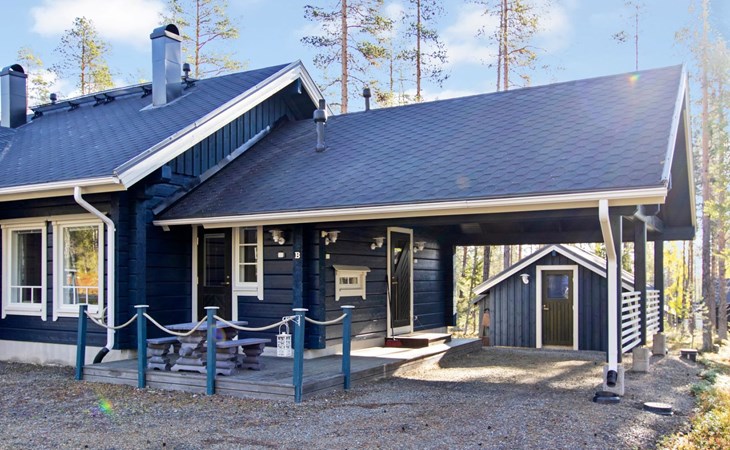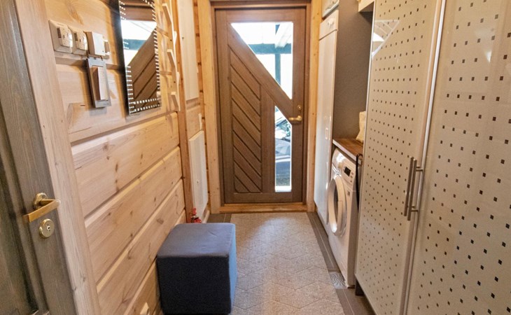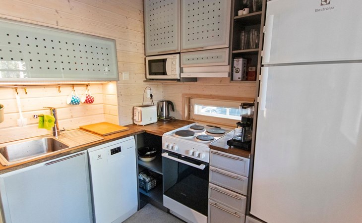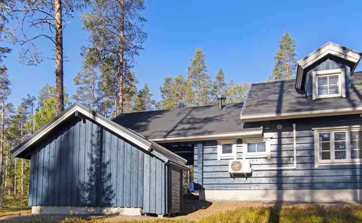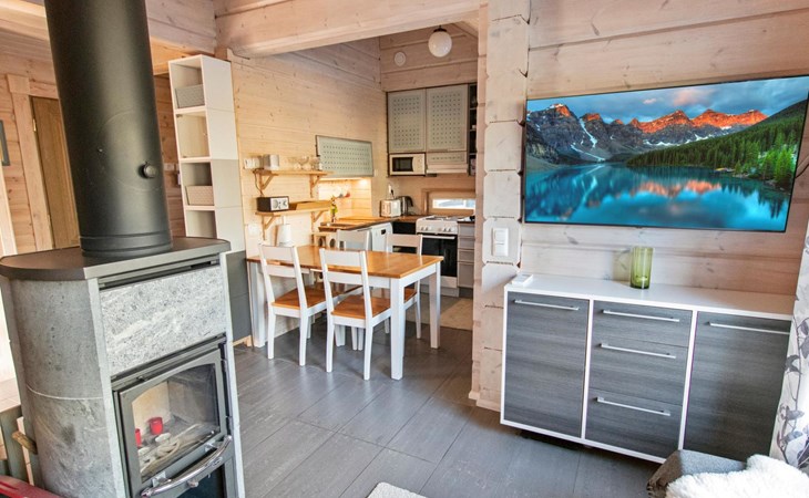 The cabin is well suited for holidays, but if you want to go to Lapland for remote work, it suits well thanks to the fast Internet connection and working desk equipped with a screen. Because of the road, there are tree-free space in front of the terrace, so you can easily observe the northern lights by lying on the terraces table, for example.