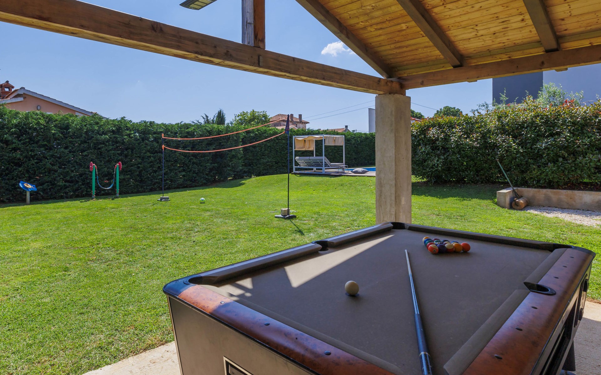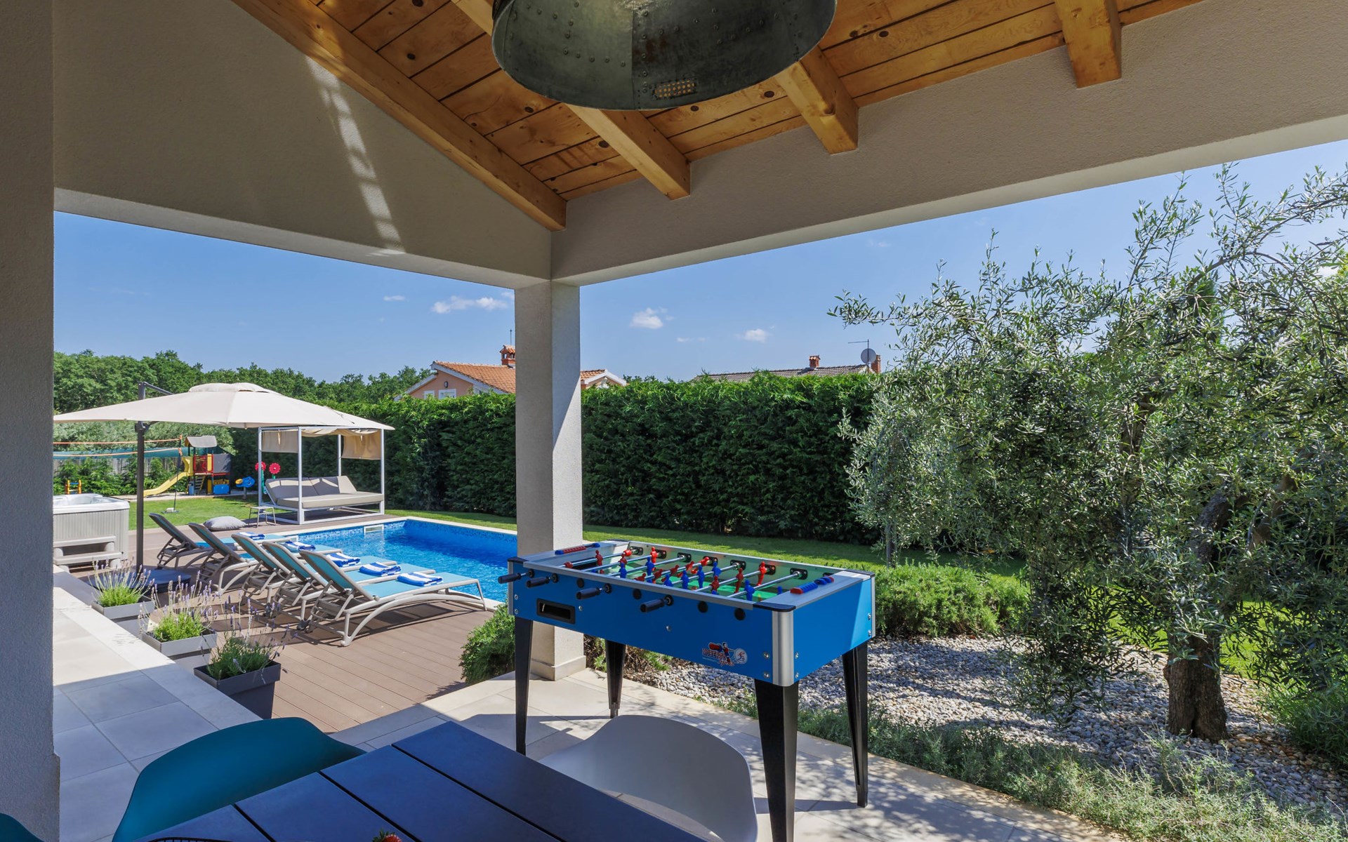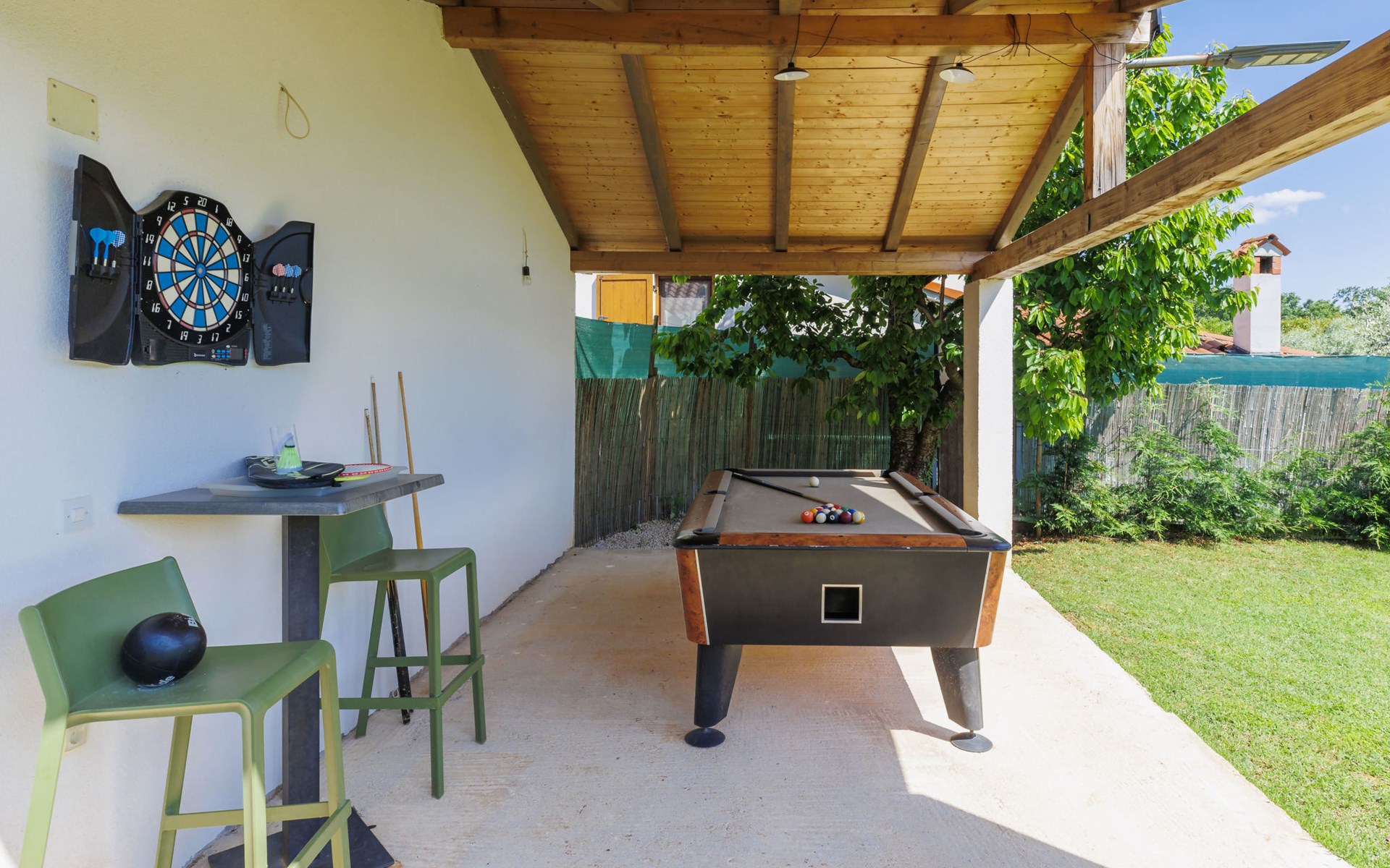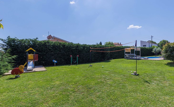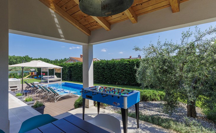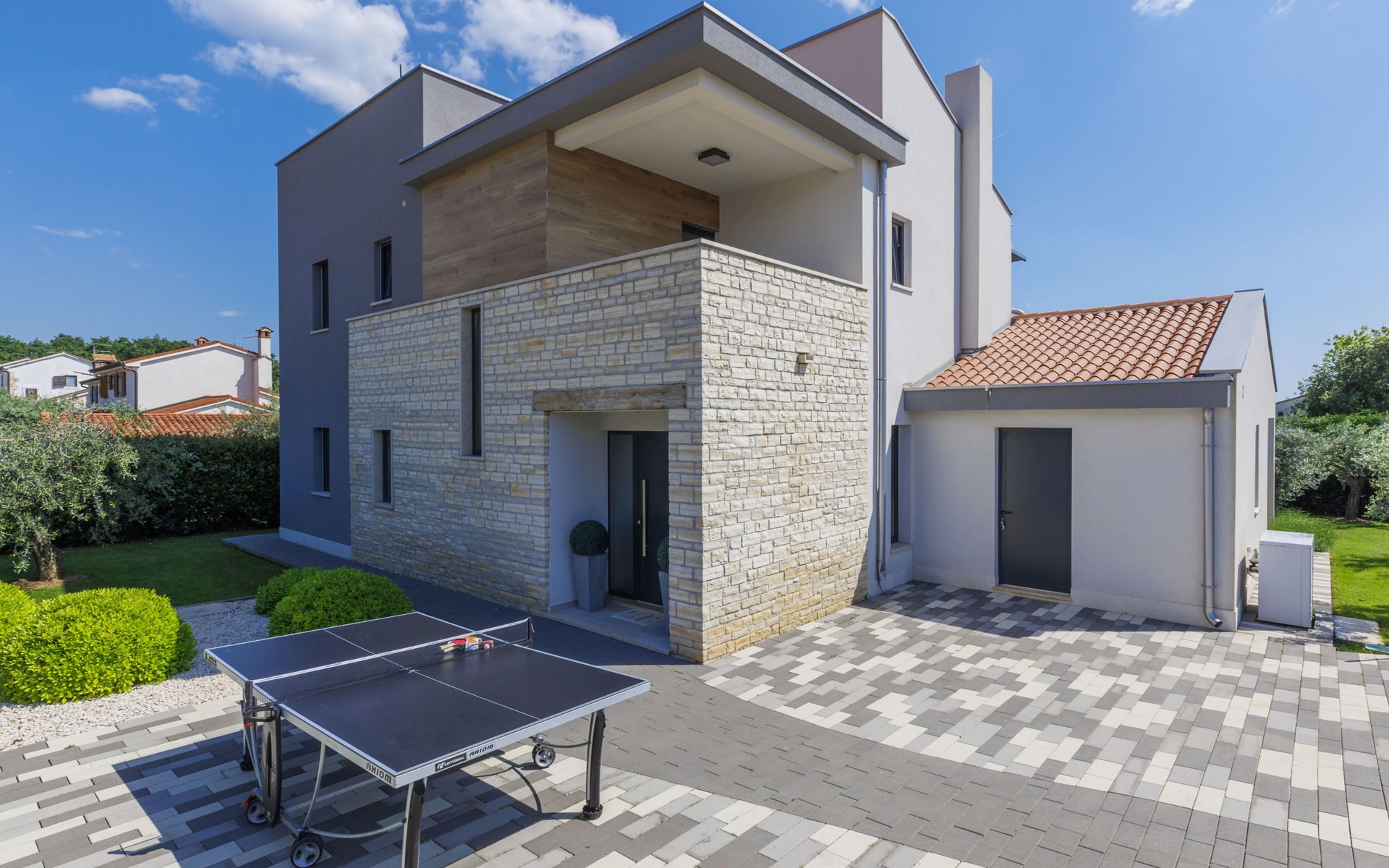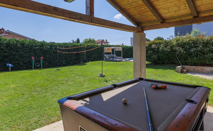 Tar 7 km von Poreč: Schöne Villa "Grande", auf 2 Stockwerken, Baujahr 2019. Im Weiler Rogovići, 2 km vom Zentrum von Tar, ruhige, sonnige Lage, 3.5 km vom Meer, 3.5 km vom Strand. Zur Alleinbenutzung: Grundstück 1'000 m2 (eingezäunt), Garten, Schwimmbad eckig (9 x 3 m, 150 cm tief, saisonale Verfügbarkeit: 01.Mai. - 15.Okt.) mit Innentreppe. Aussendusche, Sprudelbad, Badminton, Terrasse (18 m2), Gartenmöbel, Grill (Rutschbahn, Schaukel). Im Hause: Internetzugang, Billard, Tischfussball, Klimaanlage, Waschmaschine. Parkplatz (für 2 Autos) beim Haus auf dem Grundstück. Einkaufsgeschäft 2 km, Restaurant 2 km, Bushaltestelle 3.2 km, Kieselstrand 3.5 km, Felsstrand 3.5 km. Tennis 3.5 km, Reitstall 3.5 km, Wanderwege ab Haus 200 m, Radweg 250 m, Kinderspielplatz 15 m. Nahe gelegene Sehenswürdigkeiten: Aquapark 25 km. Der Besitzer akzeptiert keine Jugendgruppen. Das veranstalten von Feiern ist nicht gestattet. Verfügung: Darts (inbegriffen).