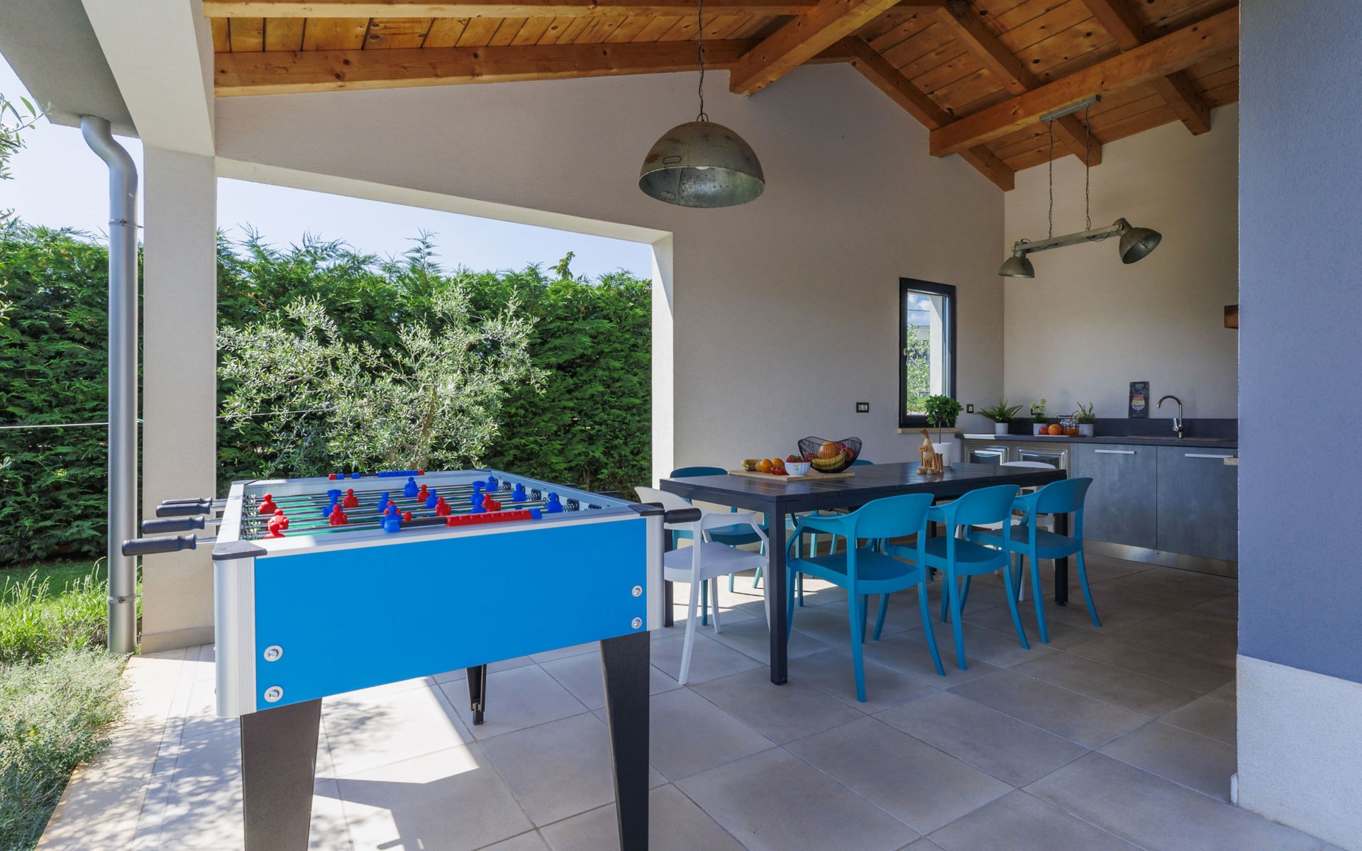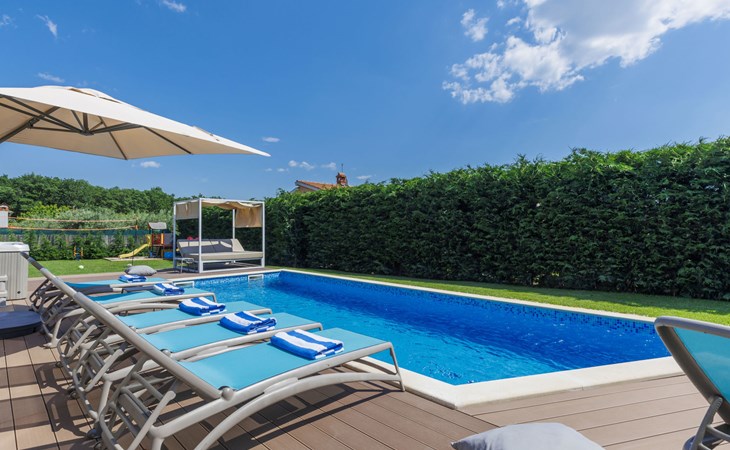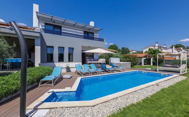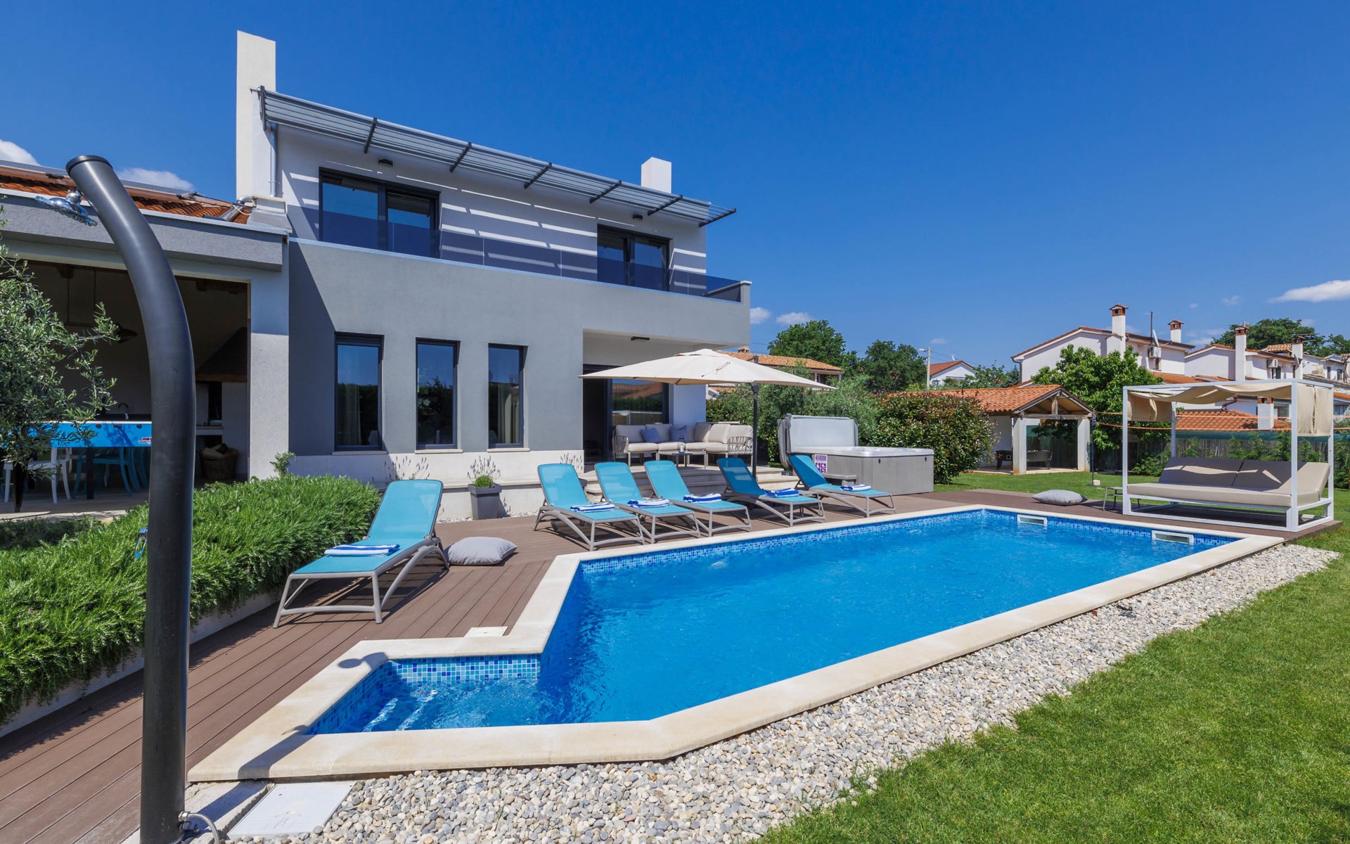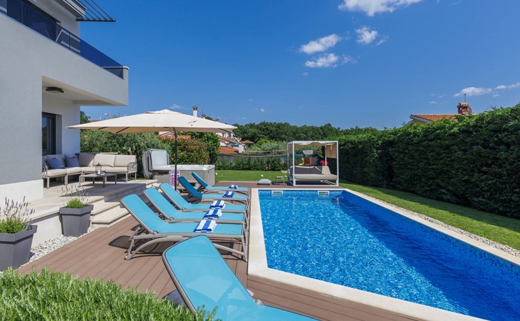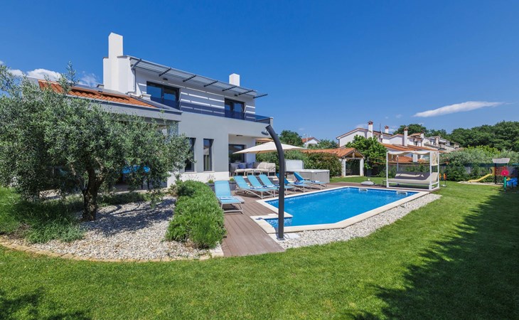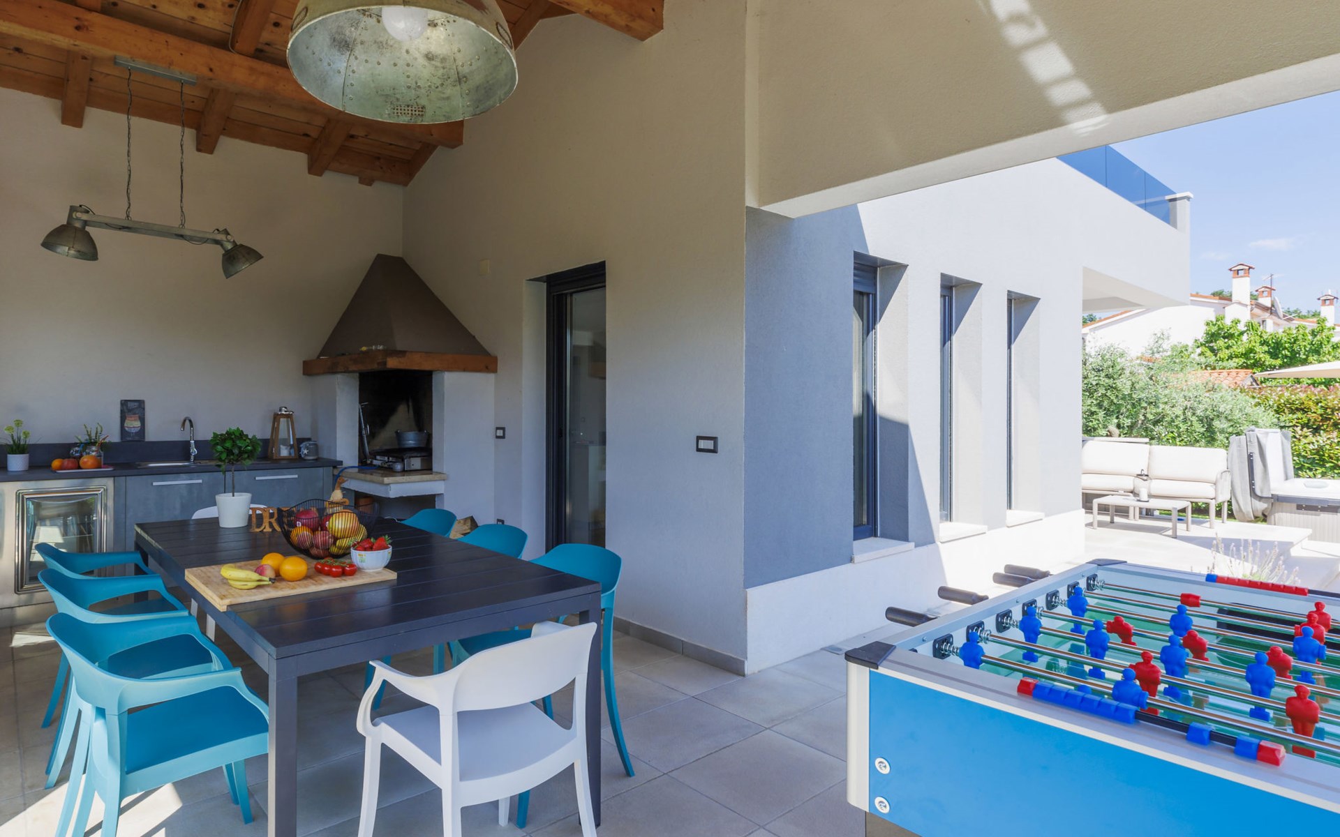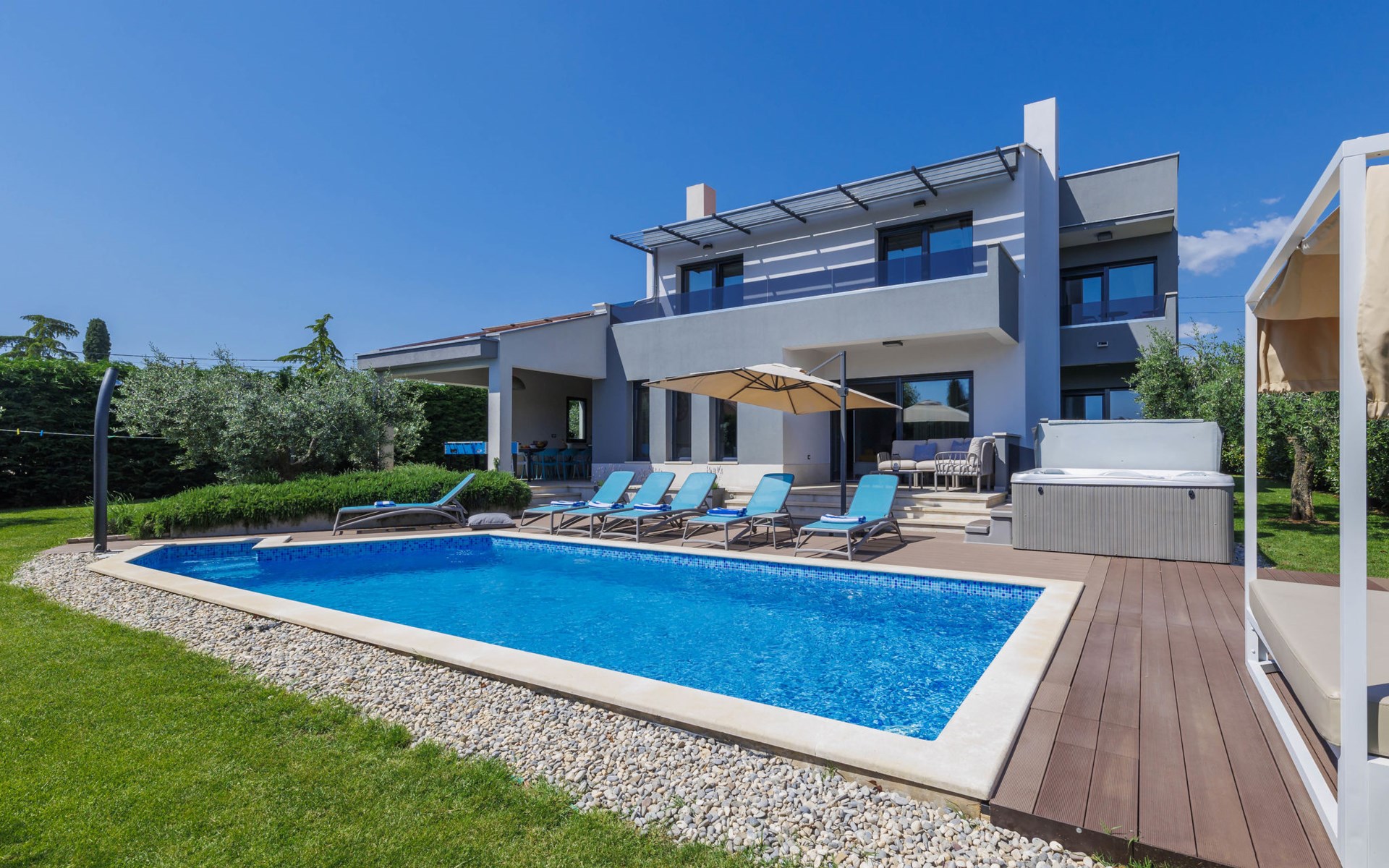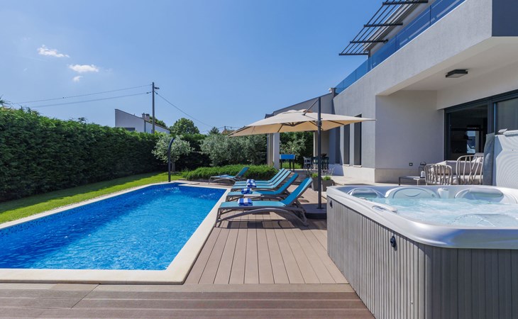 Tar 7 km von Poreč: Schöne Villa "Grande", auf 2 Stockwerken, Baujahr 2019. Im Weiler Rogovići, 2 km vom Zentrum von Tar, ruhige, sonnige Lage, 3.5 km vom Meer, 3.5 km vom Strand. Zur Alleinbenutzung: Grundstück 1'000 m2 (eingezäunt), Garten, Schwimmbad eckig (9 x 3 m, 150 cm tief, saisonale Verfügbarkeit: 01.Mai. - 15.Okt.) mit Innentreppe. Aussendusche, Sprudelbad, Badminton, Terrasse (18 m2), Gartenmöbel, Grill (Rutschbahn, Schaukel). Im Hause: Internetzugang, Billard, Tischfussball, Klimaanlage, Waschmaschine. Parkplatz (für 2 Autos) beim Haus auf dem Grundstück. Einkaufsgeschäft 2 km, Restaurant 2 km, Bushaltestelle 3.2 km, Kieselstrand 3.5 km, Felsstrand 3.5 km. Tennis 3.5 km, Reitstall 3.5 km, Wanderwege ab Haus 200 m, Radweg 250 m, Kinderspielplatz 15 m. Nahe gelegene Sehenswürdigkeiten: Aquapark 25 km. Der Besitzer akzeptiert keine Jugendgruppen. Das veranstalten von Feiern ist nicht gestattet. Verfügung: Darts (inbegriffen).