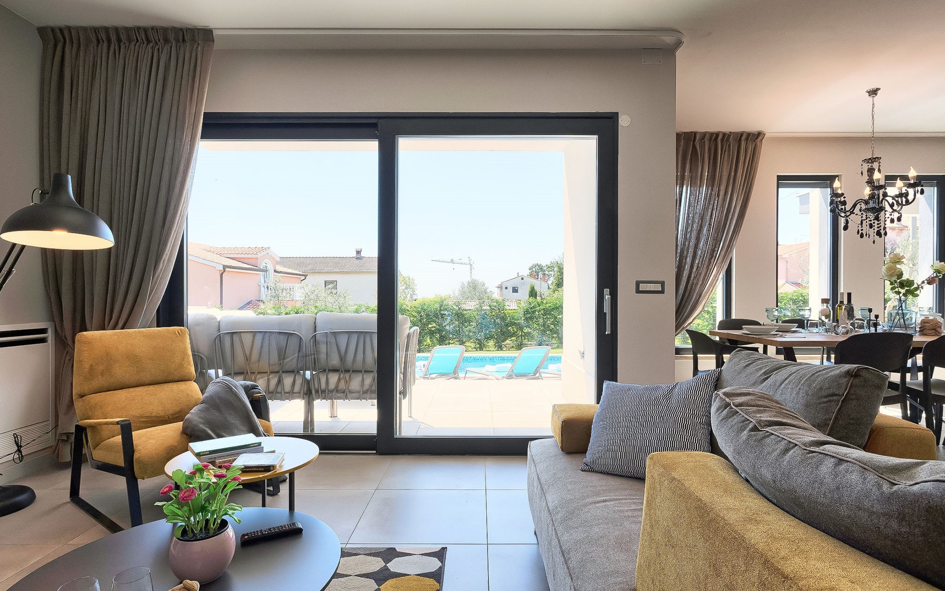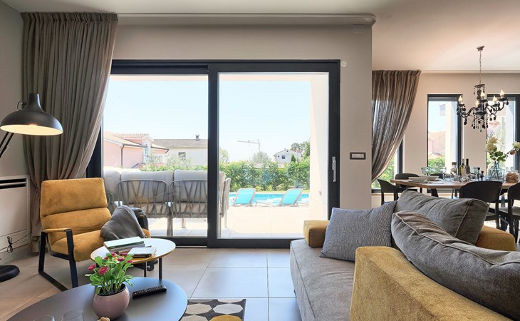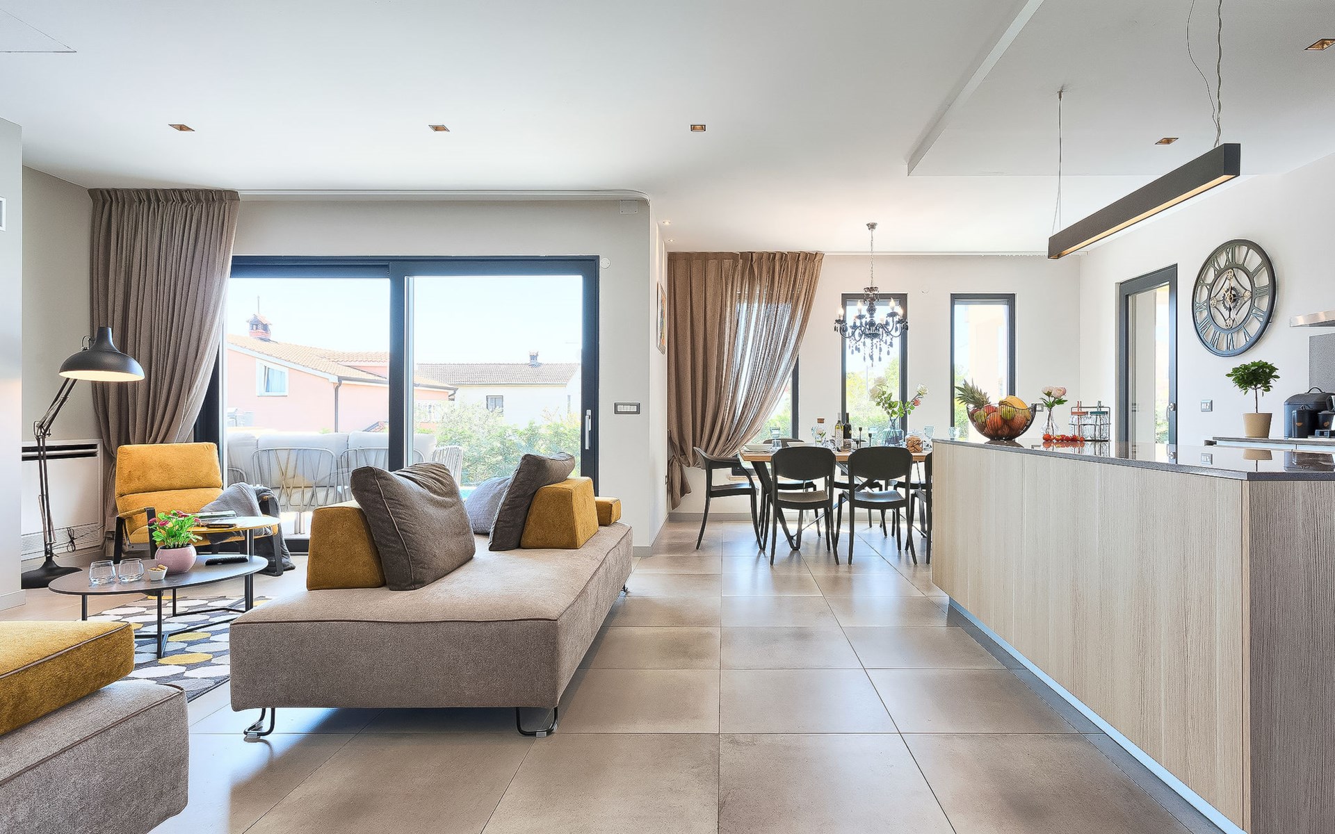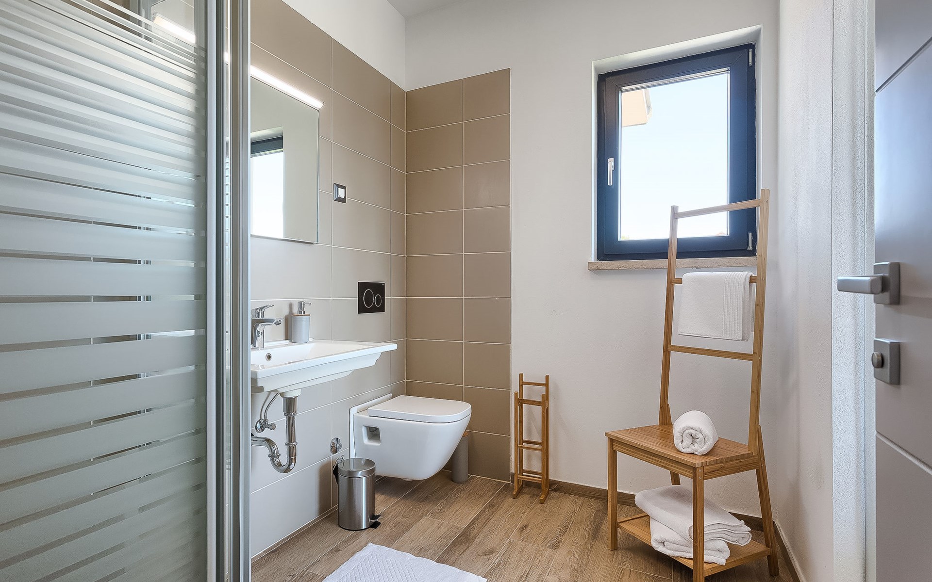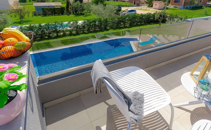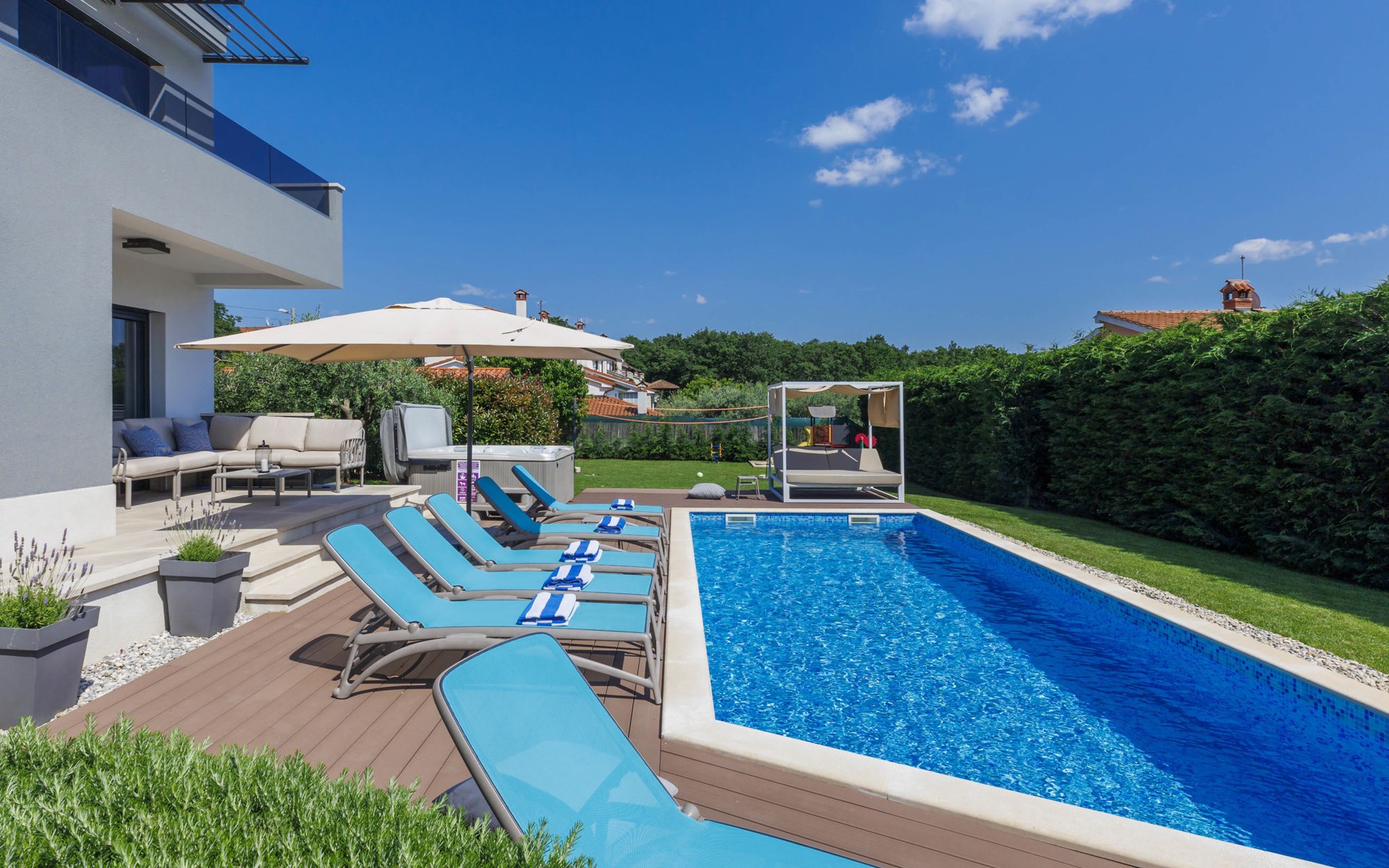 Tar 7 km von Poreč: Schöne Villa "Grande", auf 2 Stockwerken, Baujahr 2019. Im Weiler Rogovići, 2 km vom Zentrum von Tar, ruhige, sonnige Lage, 3.5 km vom Meer, 3.5 km vom Strand. Zur Alleinbenutzung: Grundstück 1'000 m2 (eingezäunt), Garten, Schwimmbad eckig (9 x 3 m, 150 cm tief, saisonale Verfügbarkeit: 01.Mai. - 15.Okt.) mit Innentreppe. Aussendusche, Sprudelbad, Badminton, Terrasse (18 m2), Gartenmöbel, Grill (Rutschbahn, Schaukel). Im Hause: Internetzugang, Billard, Tischfussball, Klimaanlage, Waschmaschine. Parkplatz (für 2 Autos) beim Haus auf dem Grundstück. Einkaufsgeschäft 2 km, Restaurant 2 km, Bushaltestelle 3.2 km, Kieselstrand 3.5 km, Felsstrand 3.5 km. Tennis 3.5 km, Reitstall 3.5 km, Wanderwege ab Haus 200 m, Radweg 250 m, Kinderspielplatz 15 m. Nahe gelegene Sehenswürdigkeiten: Aquapark 25 km. Der Besitzer akzeptiert keine Jugendgruppen. Das veranstalten von Feiern ist nicht gestattet. Verfügung: Darts (inbegriffen).