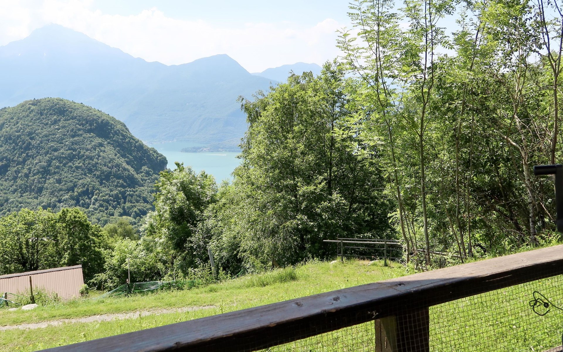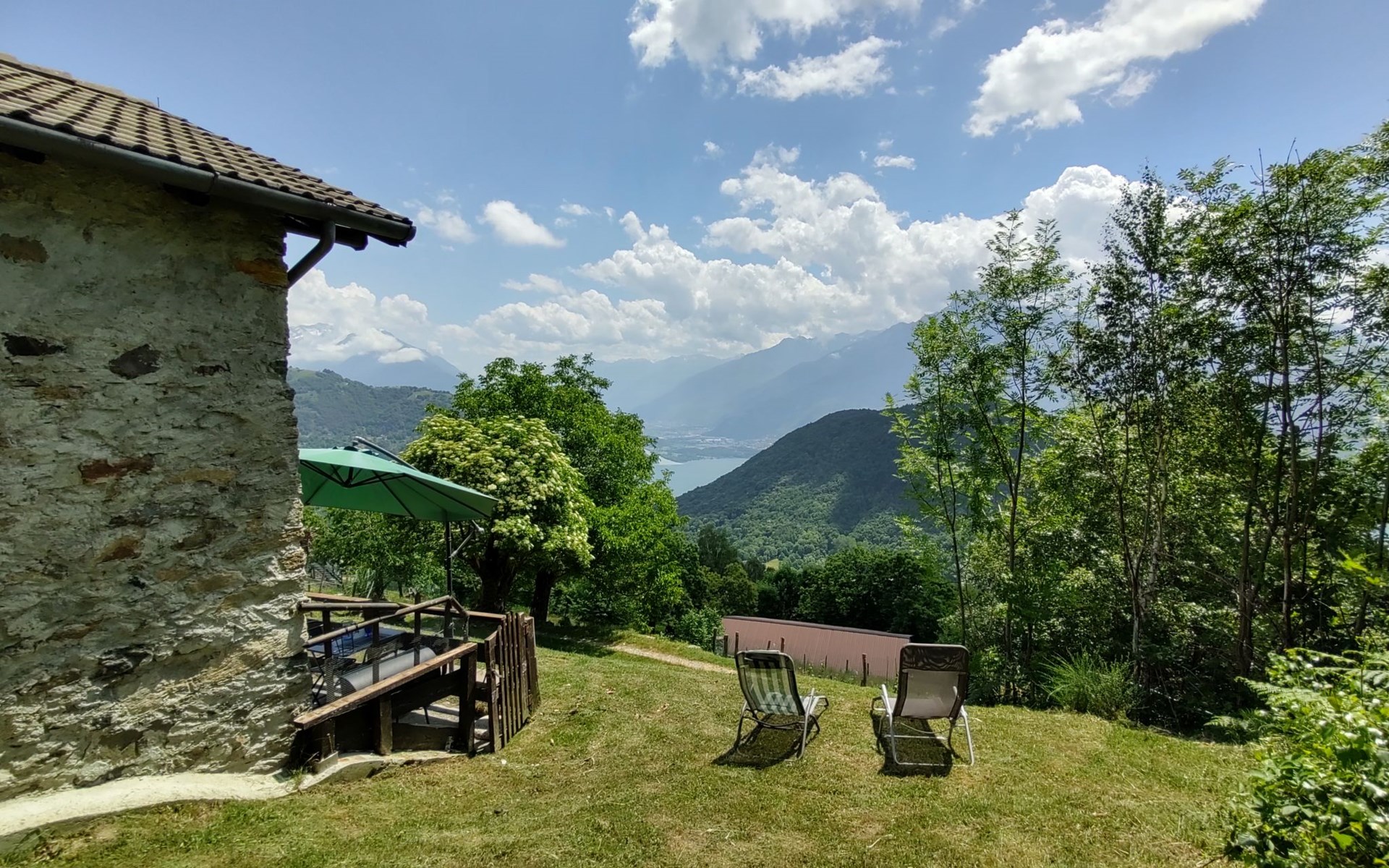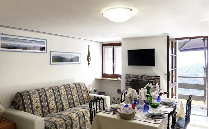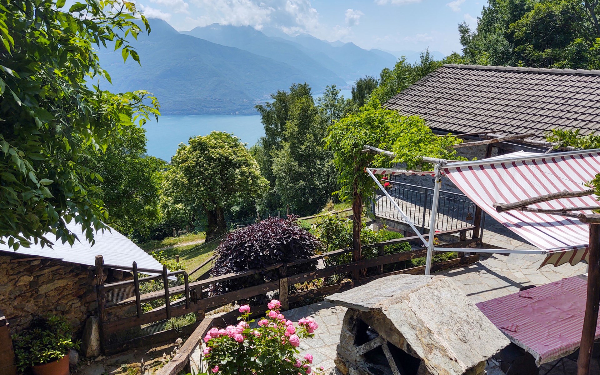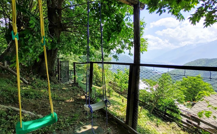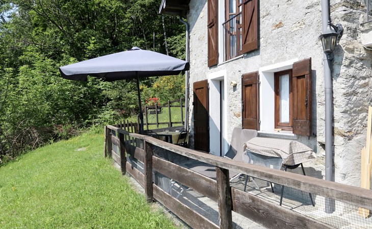 Rustikales Zweifamilienhaus "Baita dei Nonni", 950 m.ü.M., umgeben von Bäumen. Unterhalb von Bodone, in einem Weiler mit 8 Häusern, 8 km vom Zentrum von Gravedona, 60 km vom Zentrum von Como, 61 km vom Zentrum von Lecco, erhöhte Lage am Hang, 8 km vom See. Zur Mitbenutzung: naturbelassenes Grundstück (eingezäunt), terrassierter Garten mit Pflanzen, Wiese. 3 km lange holprige, steile, schmale Zufahrt (250 m Naturweg, Bergstrasse). Treppenweg (20 Stufen) bis zum Haus. Parkplatz beim Haus in 20 m. Einkaufsgeschäft 3 km, Supermarkt 8 km, Restaurant 3 km, Bushaltestelle 3 km, Bahnstation "Como" 60 km, Kieselstrand "Lido di Gravedona" 8 km, Freibad 8 km.