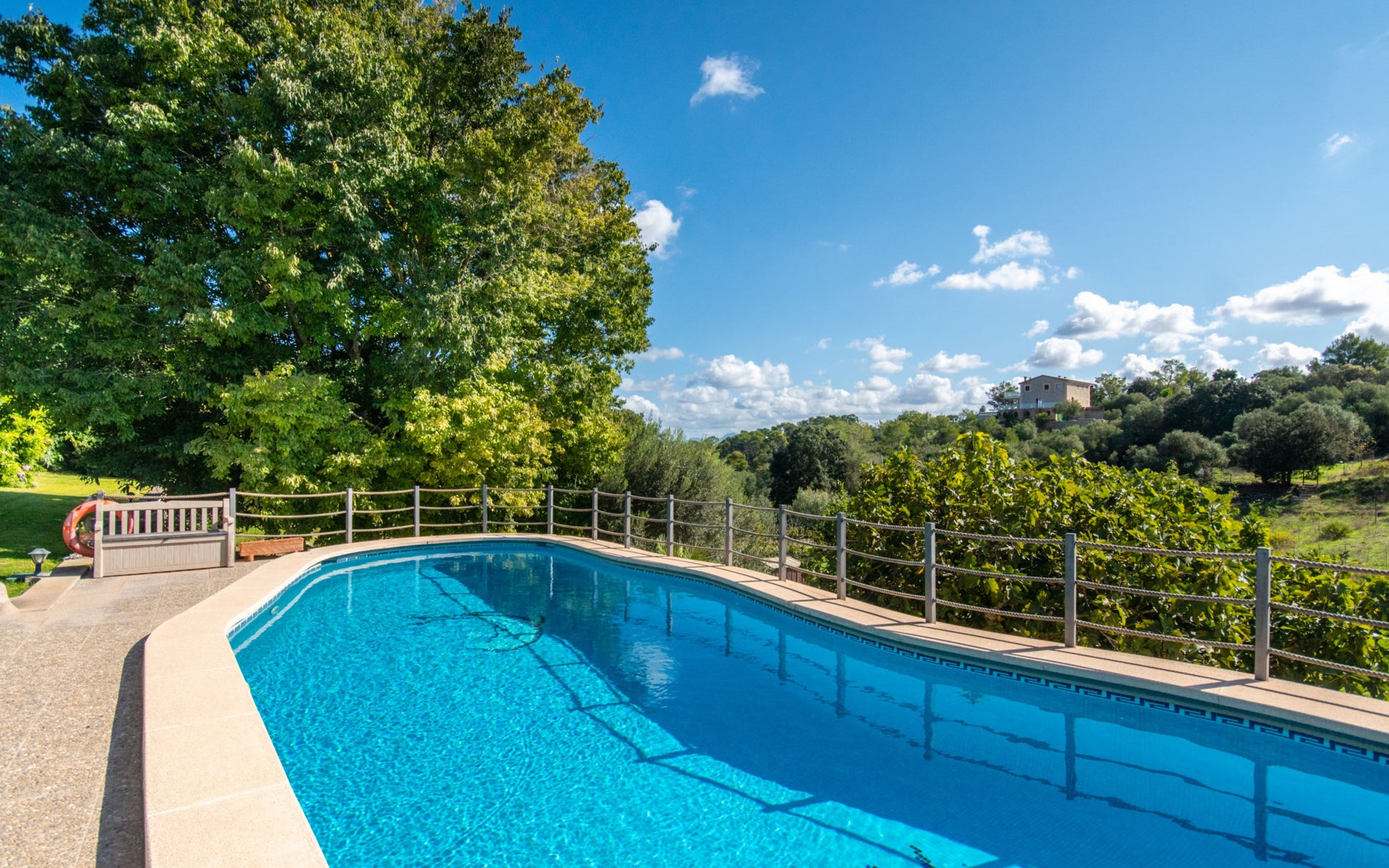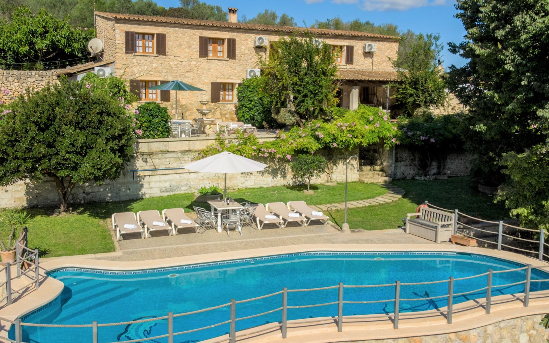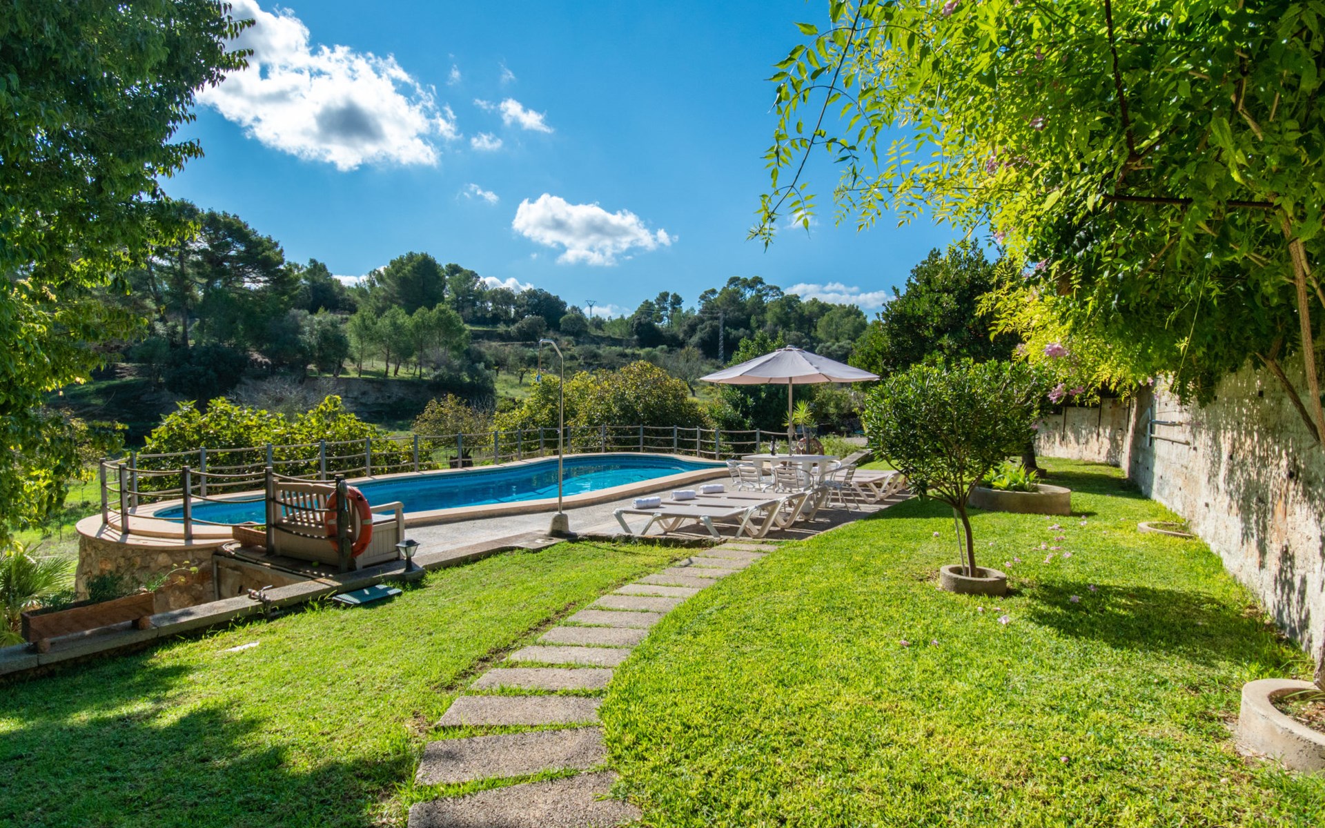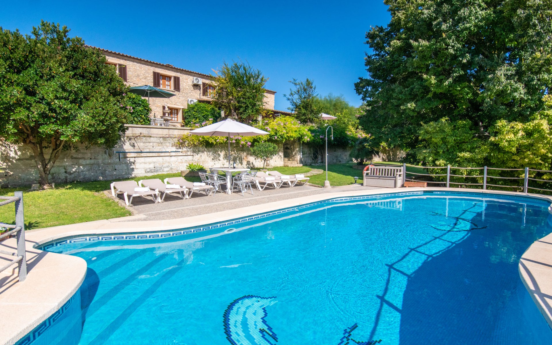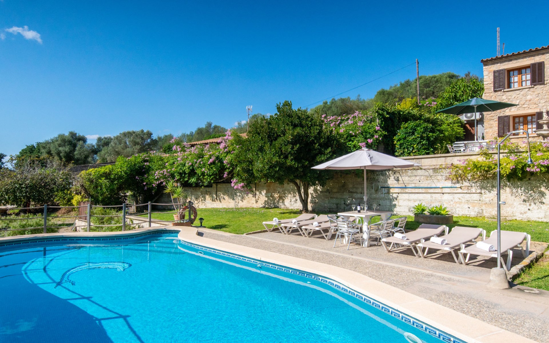 Schöne Finca "Son Femenia", auf 2 Stockwerken, umgeben von Wiesen und Feldern. 1.5 km vom Zentrum von Santa Margalida, 8 km vom Zentrum von Ca'n Picafort, 19 km vom Zentrum von Alcudia, alleinstehende Lage auf einem Hügel, 9 km vom Meer. Zur Alleinbenutzung: naturbelassenes Grundstück 15'000 m2 (eingezäunt), Garten 1'500 m2 mit Rasen und Bäumen, Wiese, Schwimmbad nierenförmig (13 x 5 m, saisonale Verfügbarkeit: 01.Jan. - 31.Dez.). Aussendusche. Im Hause: Alarmanlage. Parkplatz (für 2 Autos, überdacht) auf dem Grundstück. Einkaufsgeschäft 1.5 km, Bushaltestelle 800 m, Sandstrand "Ca'n Picafort" 9 km. Bitte beachten: Fahrzeug empfohlen. Der Besitzer wohnt auf dem gleichen Grundstück. Eigentümer hat einen Hund. Tiere in der Umgebung.