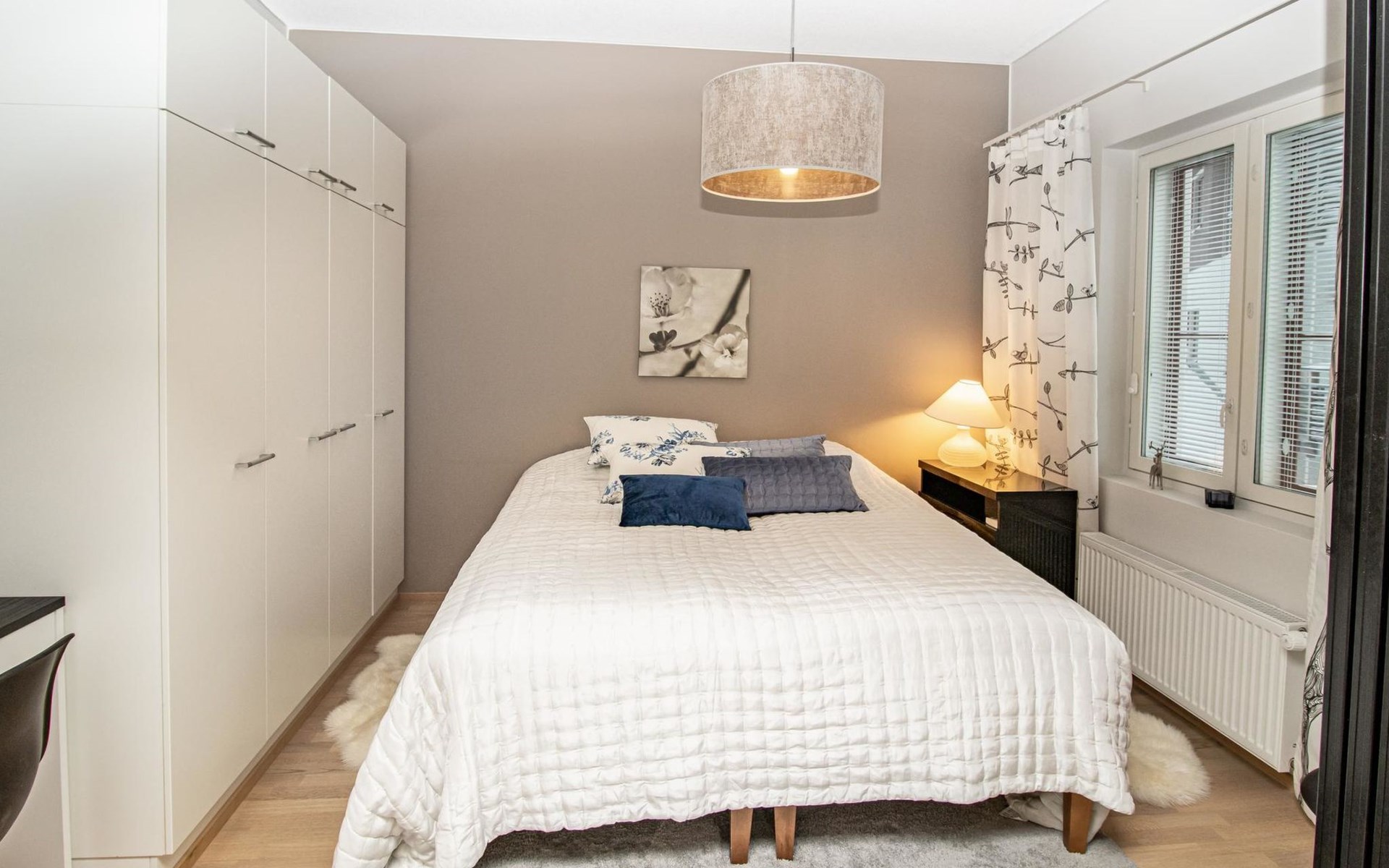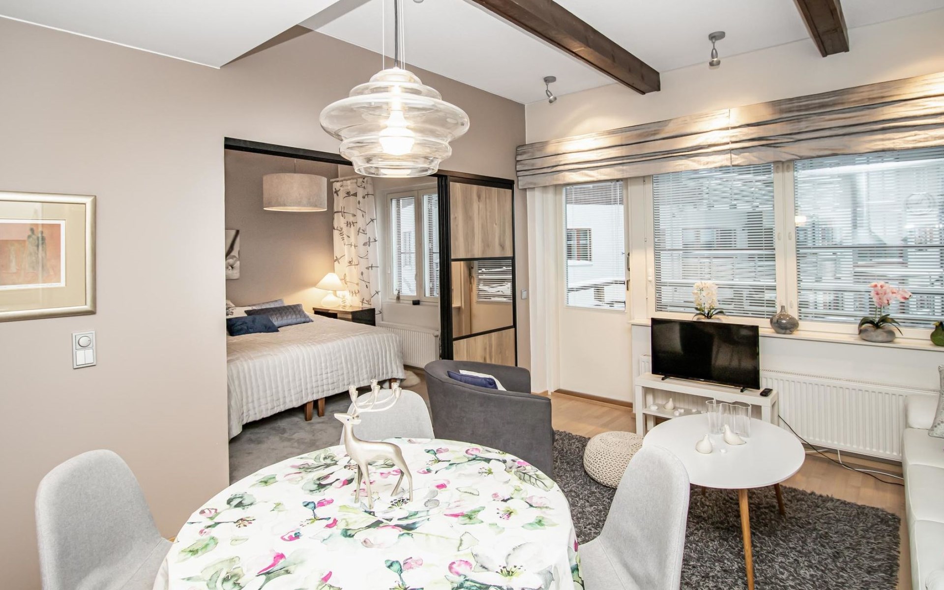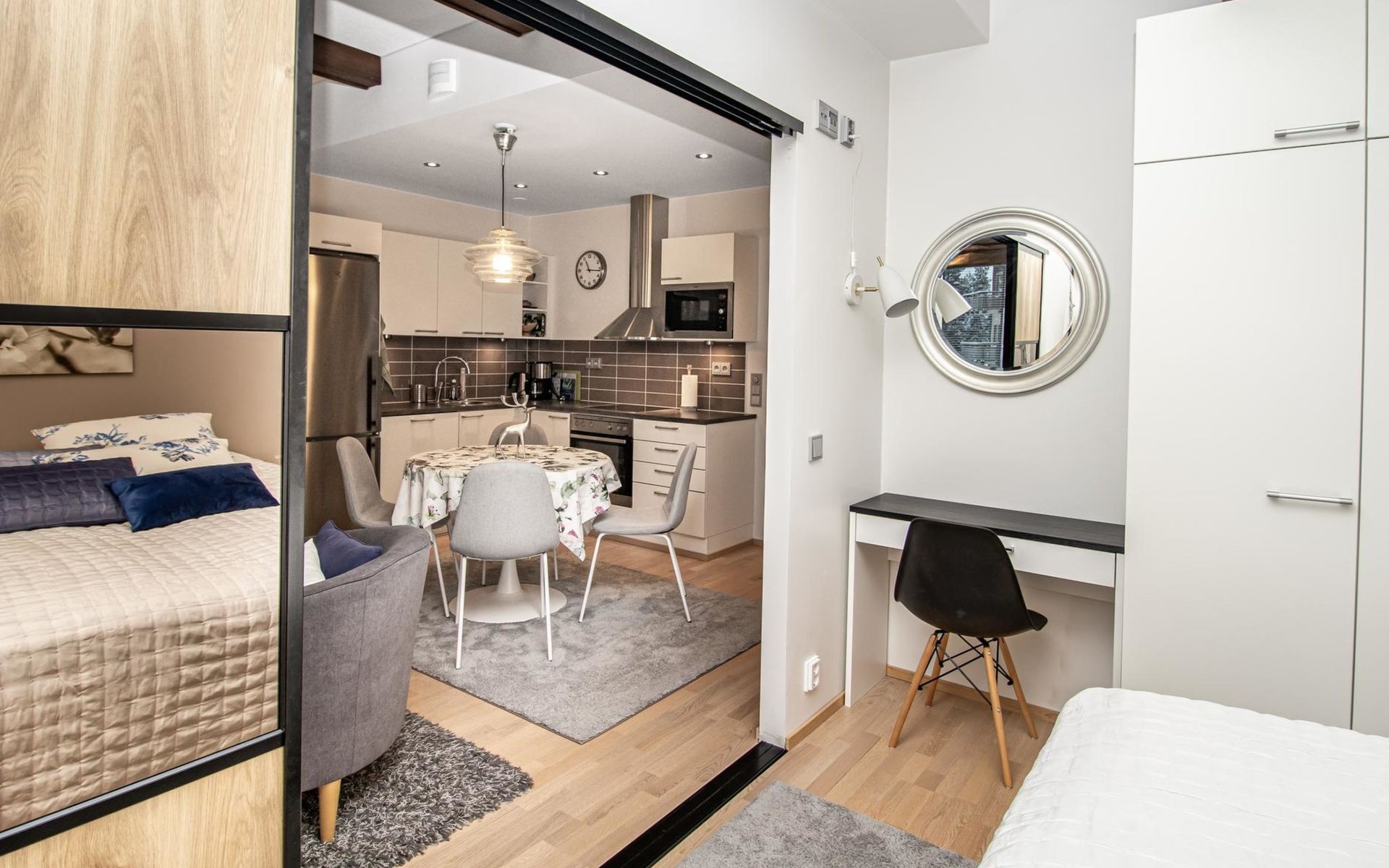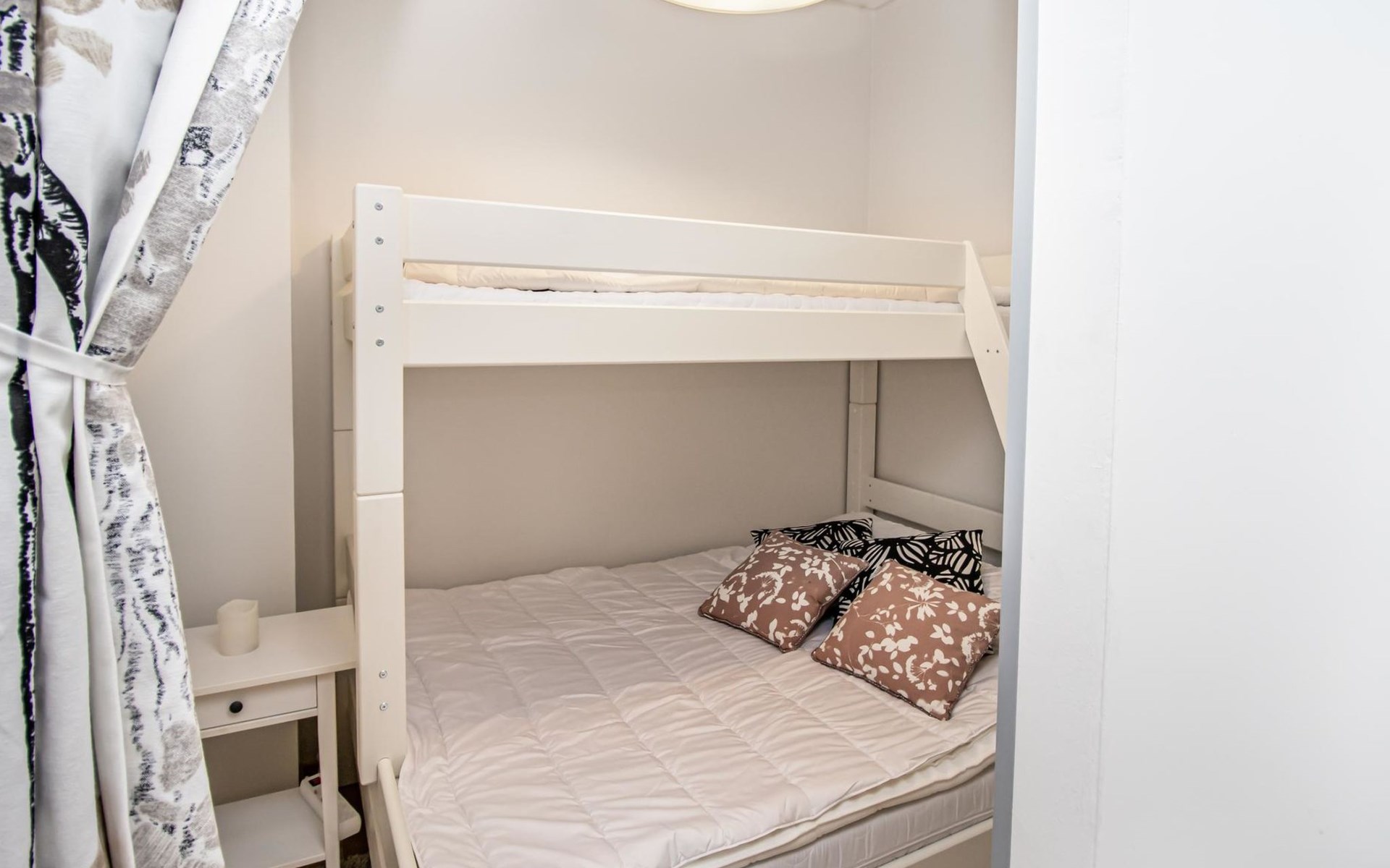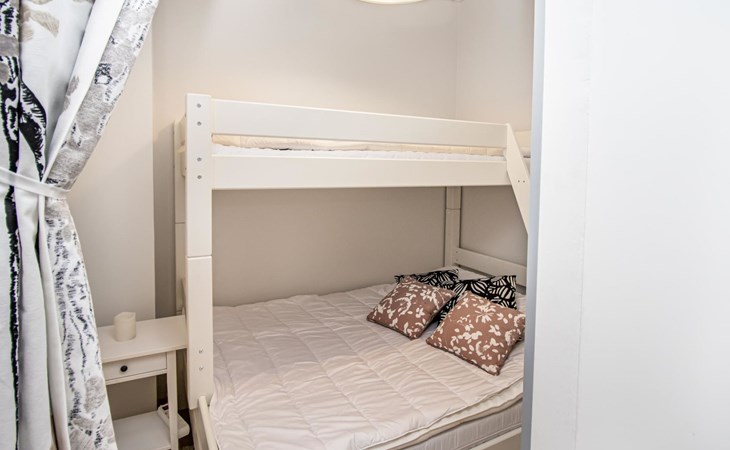 The accommodation consists of one bedroom and an alcove, providing a relaxing retreat after an active day. The bedroom (with sliding door) includes a comfortable 180 cm wide double bed with a box spring mattress, while the alcove, separated by a curtain, has a bunk bed with a 140 cm wide lower bed and a 100 cm wide upper bed.
