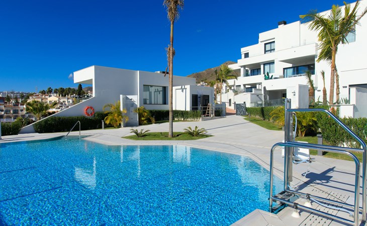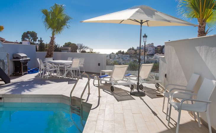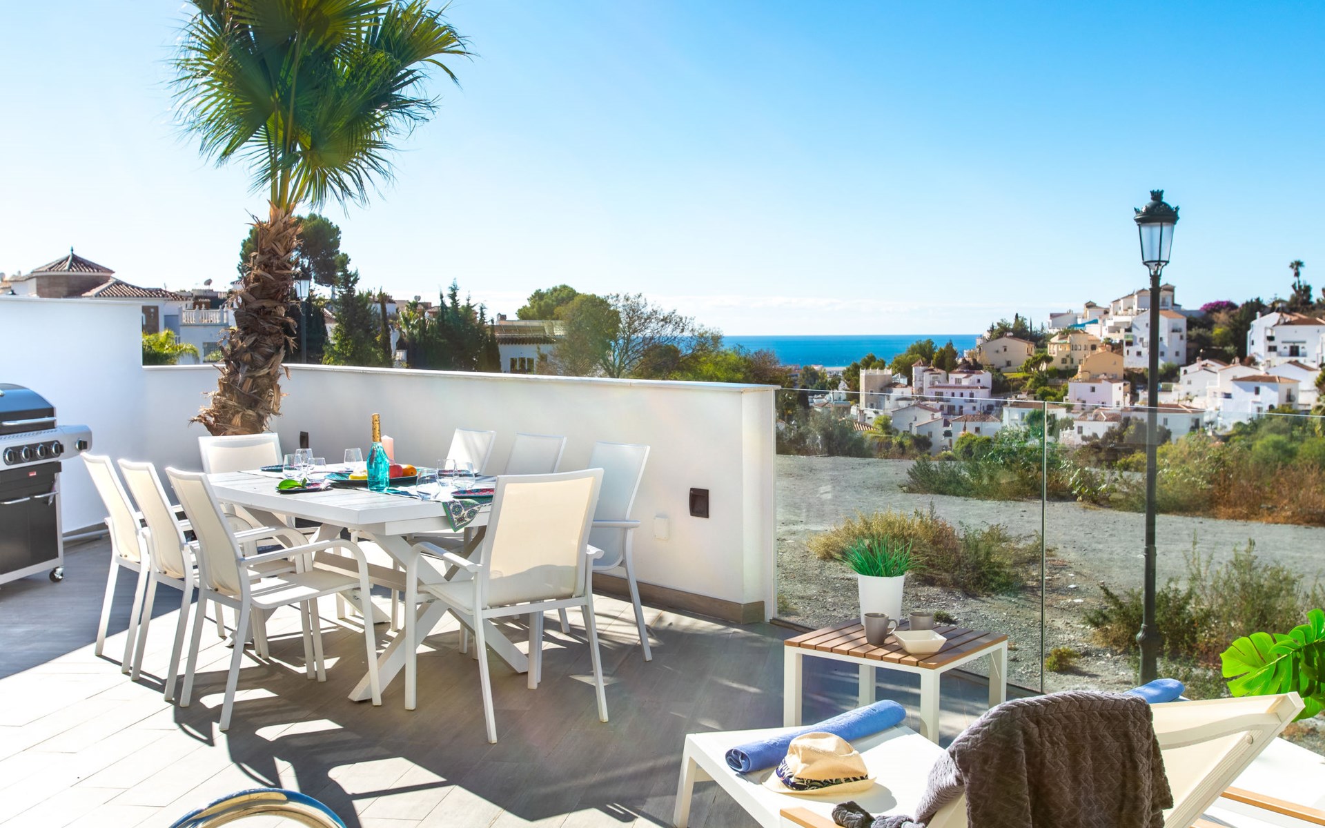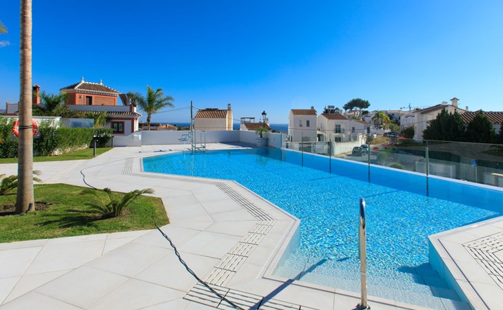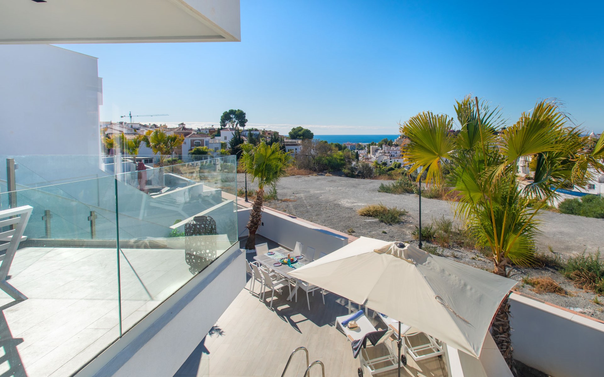Nerja: Grosses, modernes, schönes Haus "Royal Palm", auf 3 Stockwerken. Im Ort, 1.6 km vom Zentrum von Nerja, sonnige Lage im Villenviertel, 500 m vom Meer, 500 m vom Strand, Richtung Süden. Zur Mitbenutzung: Schwimmbad eckig (5 x 10 m, 97 - 162 cm tief, saisonale Verfügbarkeit: 01.Jan. - 31.Dez.). Zur Alleinbenutzung: Schwimmbad beheizt (2 x 3 m, saisonale Verfügbarkeit: 01.Jan. - 31.Dez.). Im Hause: Waschmaschine. Parkplatz, Einzelgarage. Einkaufsgeschäft, Lebensmittelgeschäft, Supermarkt 300 m, Einkaufszentrum 20 km, Restaurant, Bar, Bäckerei, Café, Internet-Café 300 m, Fahrradverleih 500 m, Biergarten 300 m, Bushaltestelle 150 m, Sandstrand "Burriana" 500 m. Der Besitzer akzeptiert keine Jugendgruppen. Bitte beachten: Be- und Entladen am Ferienhaus möglich.
