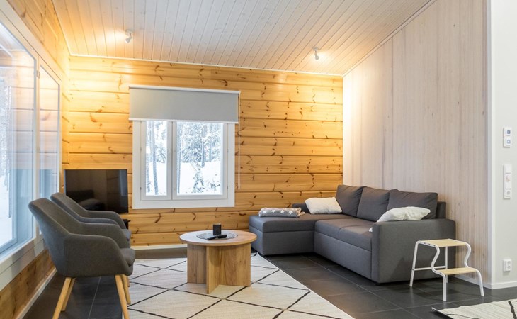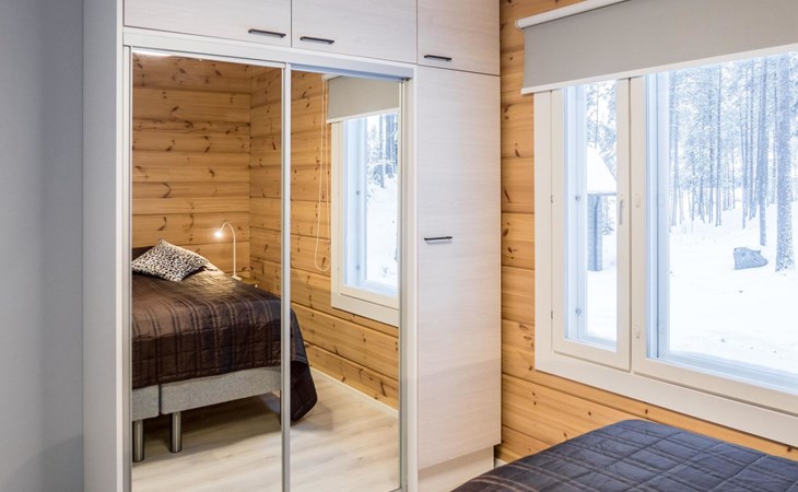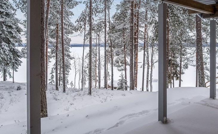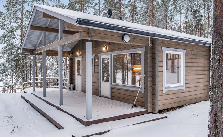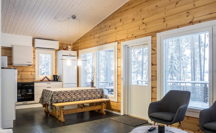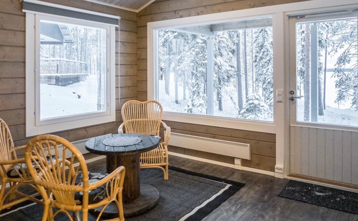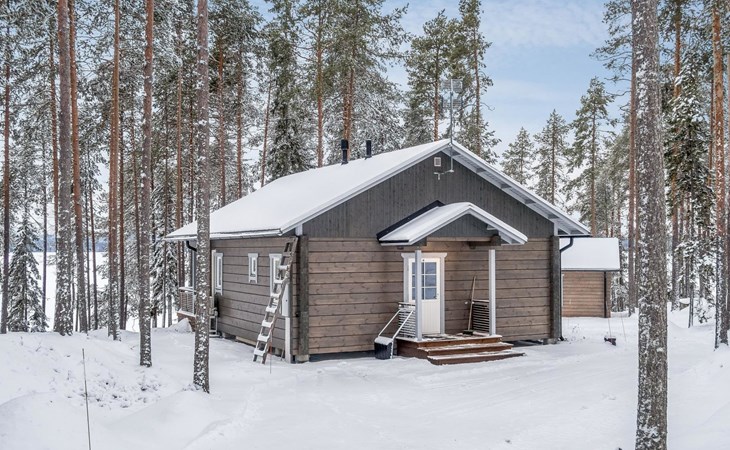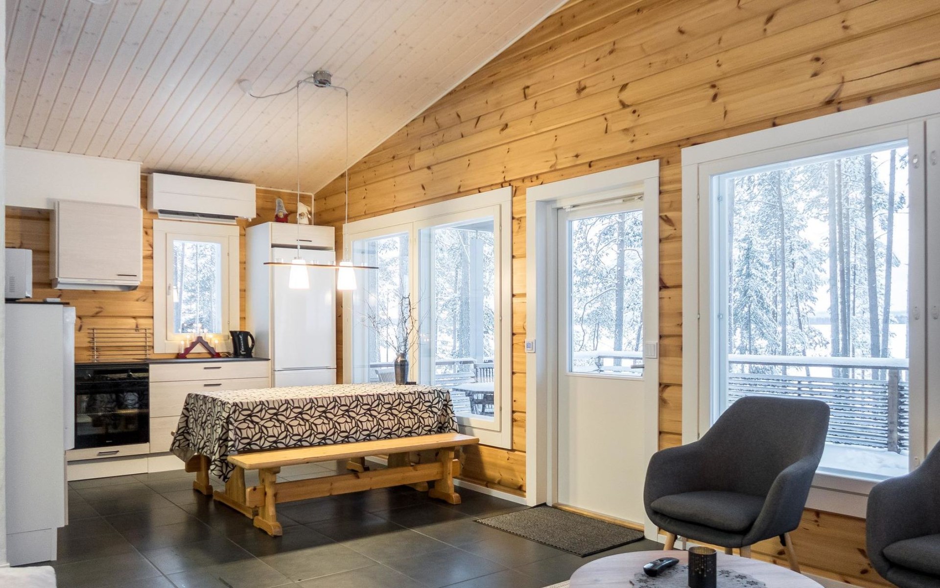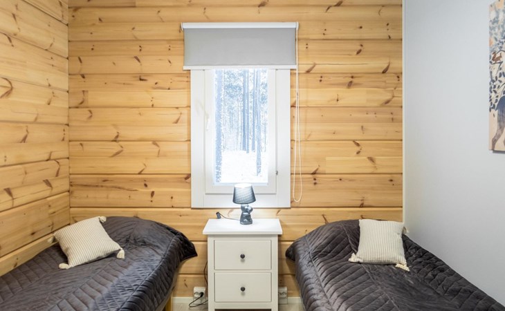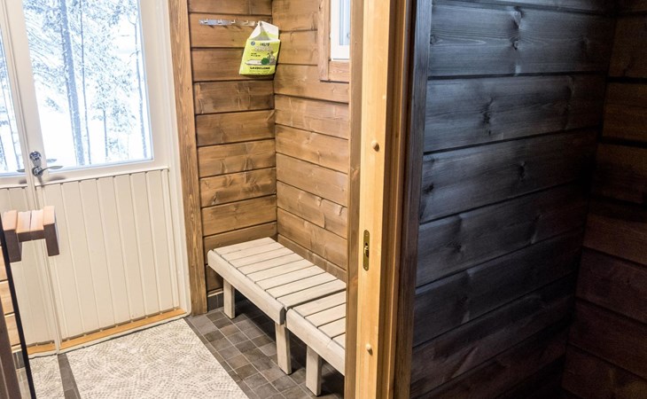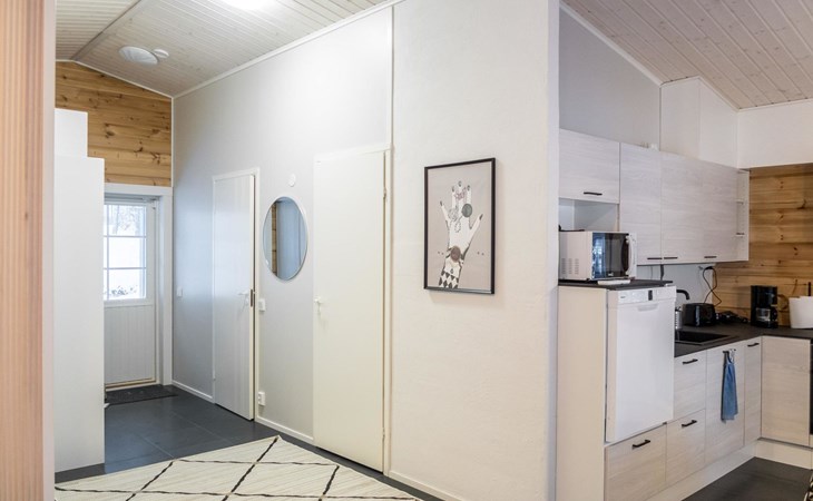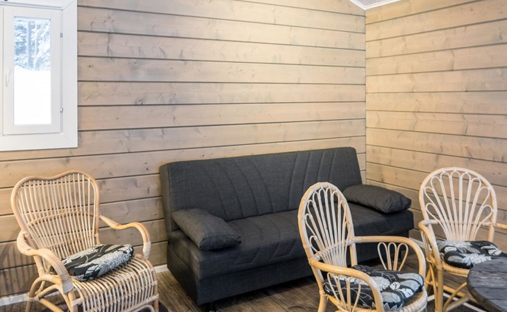 The area of the main house is 62 m², with a spacious kitchen/living room with large windows overlooking the lake and the forest landscape. Dining set for 6 in the kitchen. Two separate bedrooms, one with a double bed and wardrobes. In the second bedroom, separate beds for 2. The living room has a sofa bed for 1-2 guests. Shower/toilet, washing machine and drying rack in the washroom. Entrance hall with wardrobes, access from the back to a large terrace with garden furniture and a grill available in the summer. In the main cabin, underfloor heating, air-to-air heat pump and ventilation unit.