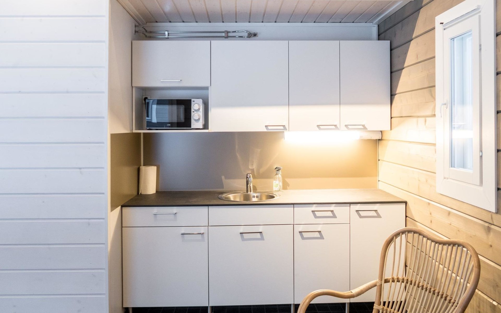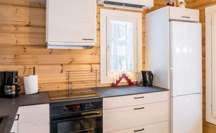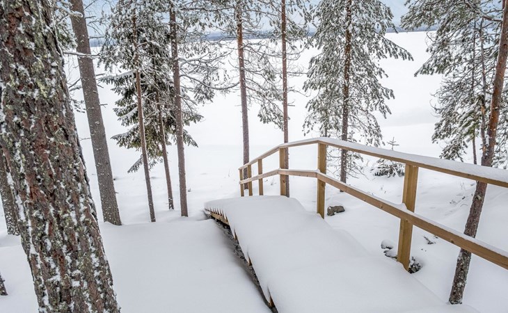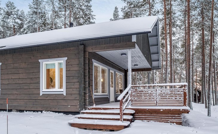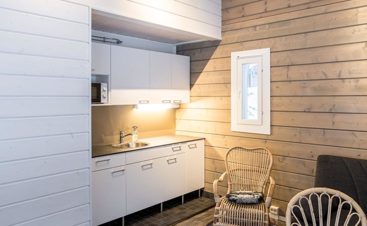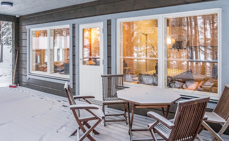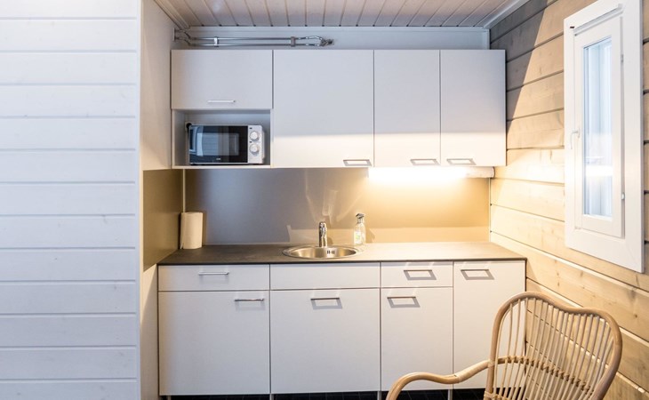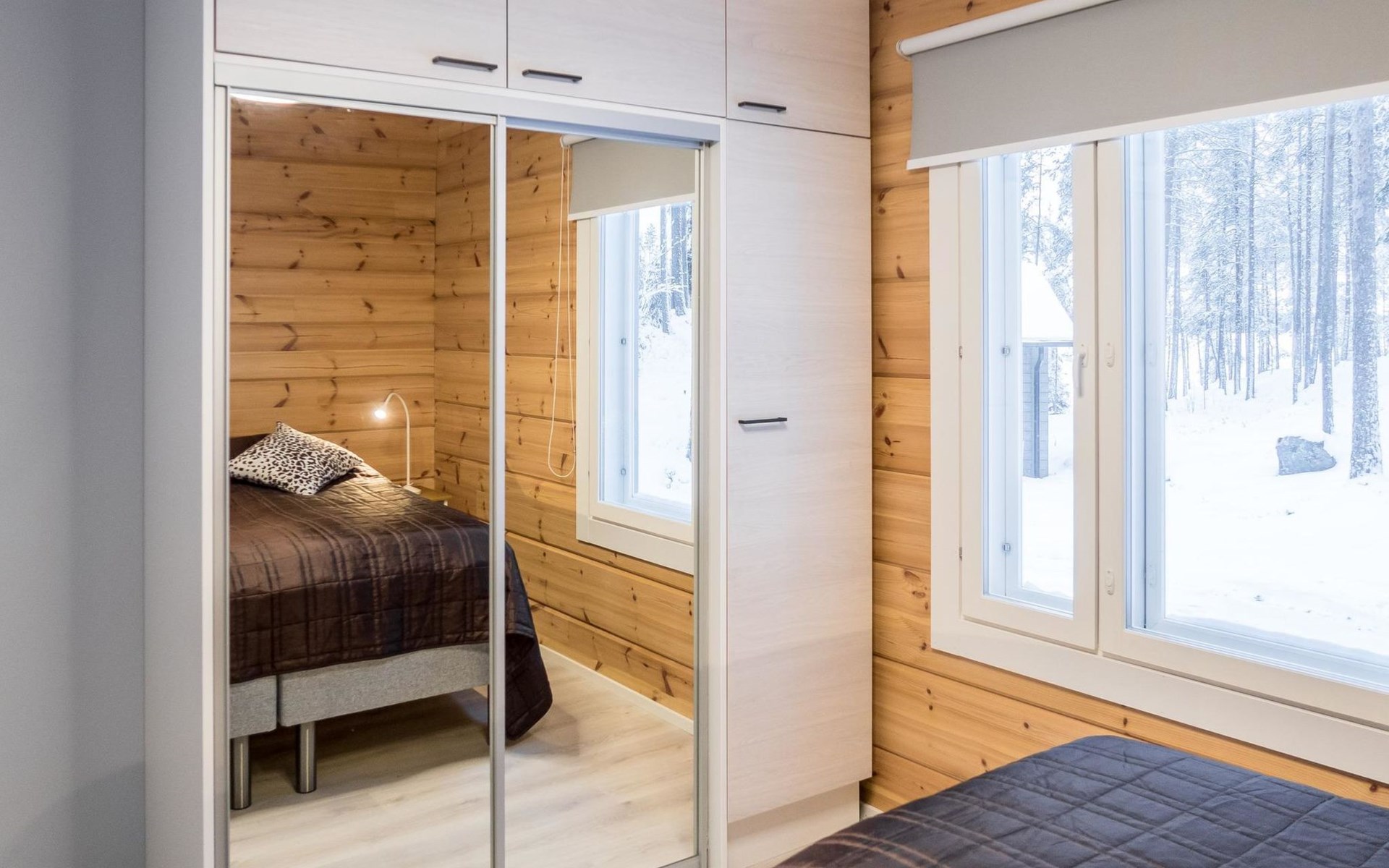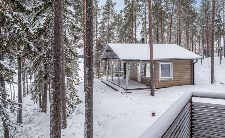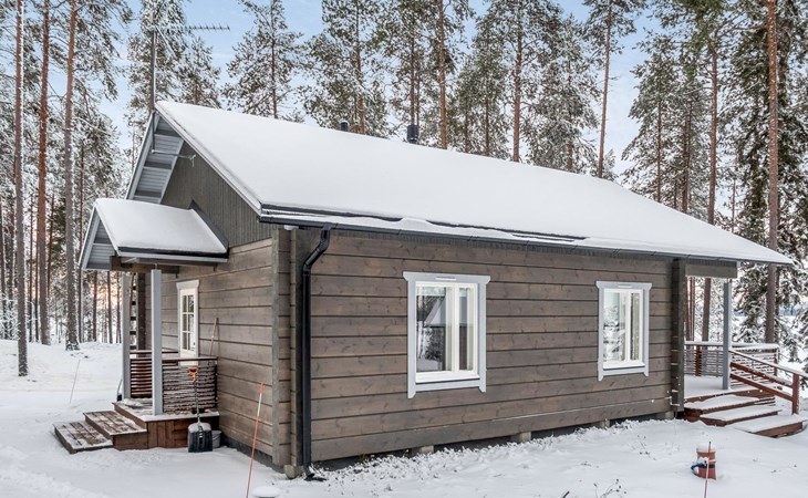The area of the main house is 62 m², with a spacious kitchen/living room with large windows overlooking the lake and the forest landscape. Dining set for 6 in the kitchen. Two separate bedrooms, one with a double bed and wardrobes. In the second bedroom, separate beds for 2. The living room has a sofa bed for 1-2 guests. Shower/toilet, washing machine and drying rack in the washroom. Entrance hall with wardrobes, access from the back to a large terrace with garden furniture and a grill available in the summer. In the main cabin, underfloor heating, air-to-air heat pump and ventilation unit.