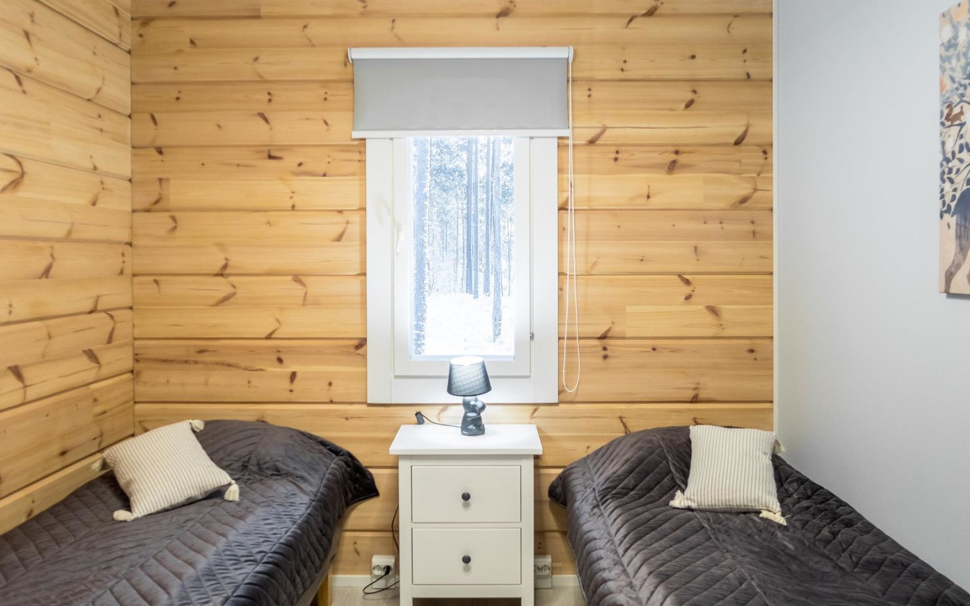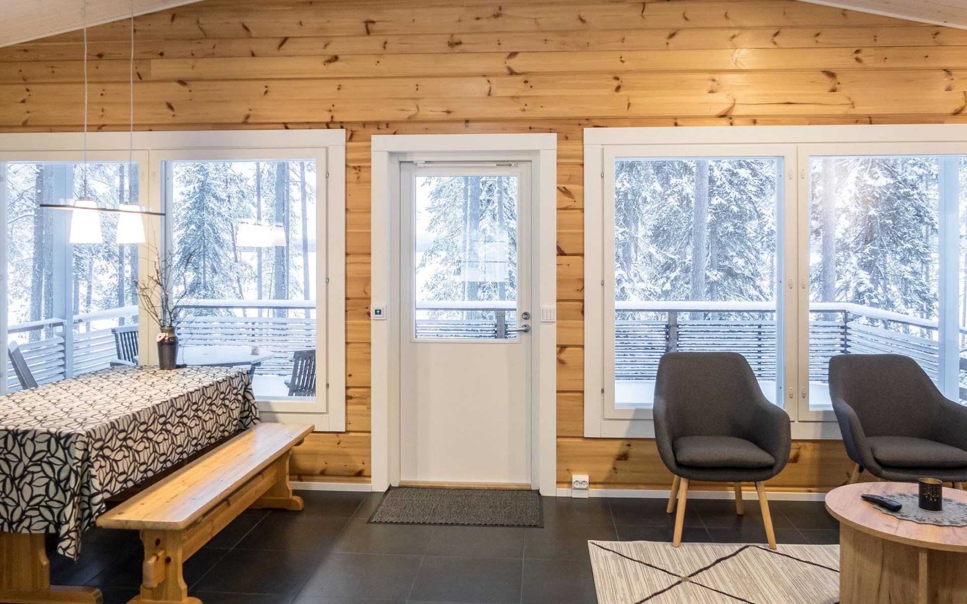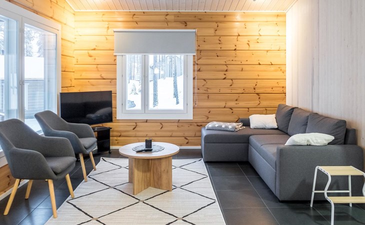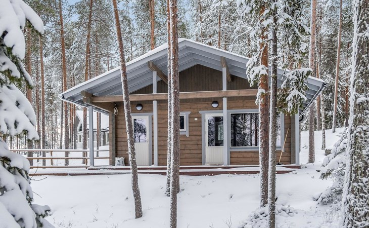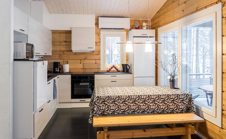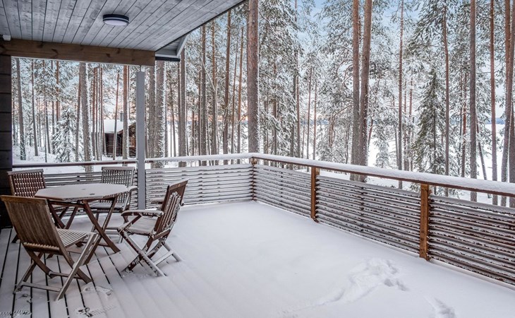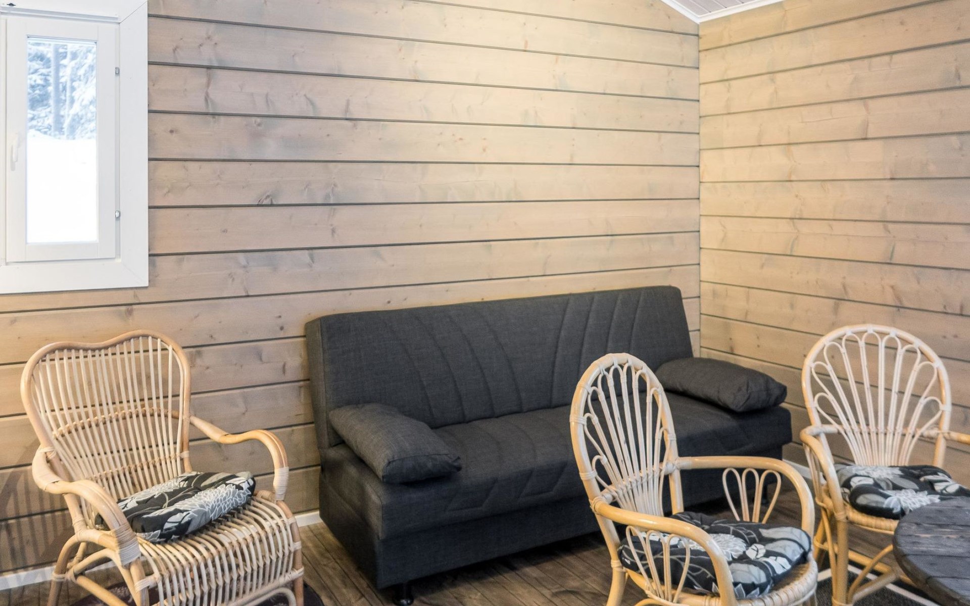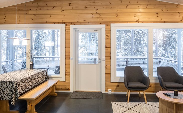 The area of the main house is 62 m², with a spacious kitchen/living room with large windows overlooking the lake and the forest landscape. Dining set for 6 in the kitchen. Two separate bedrooms, one with a double bed and wardrobes. In the second bedroom, separate beds for 2. The living room has a sofa bed for 1-2 guests. Shower/toilet, washing machine and drying rack in the washroom. Entrance hall with wardrobes, access from the back to a large terrace with garden furniture and a grill available in the summer. In the main cabin, underfloor heating, air-to-air heat pump and ventilation unit.