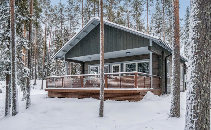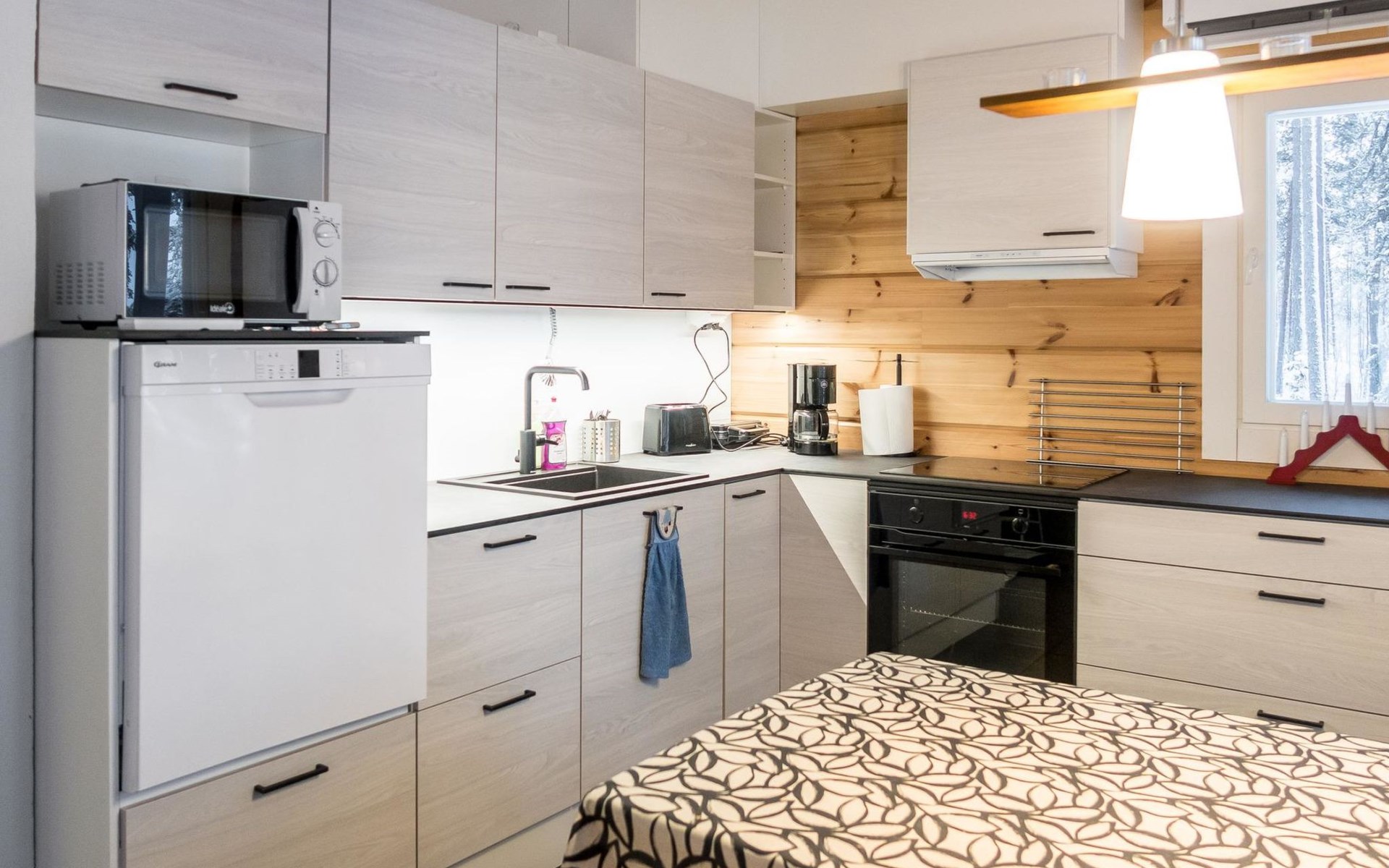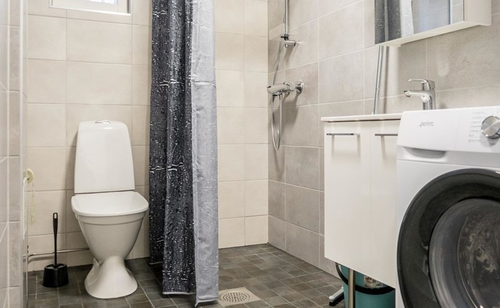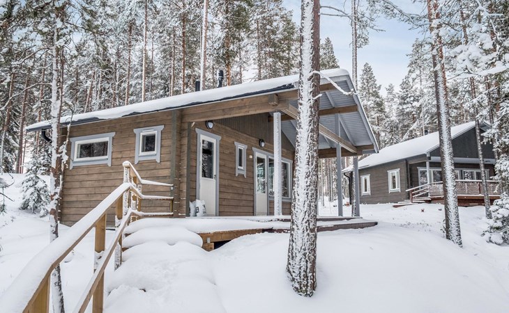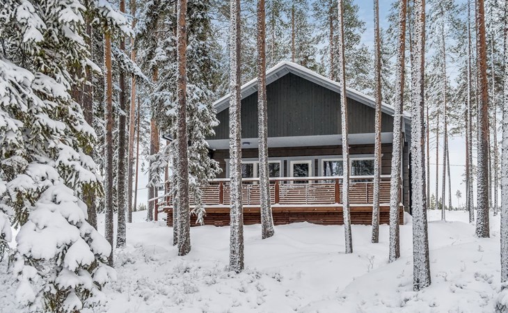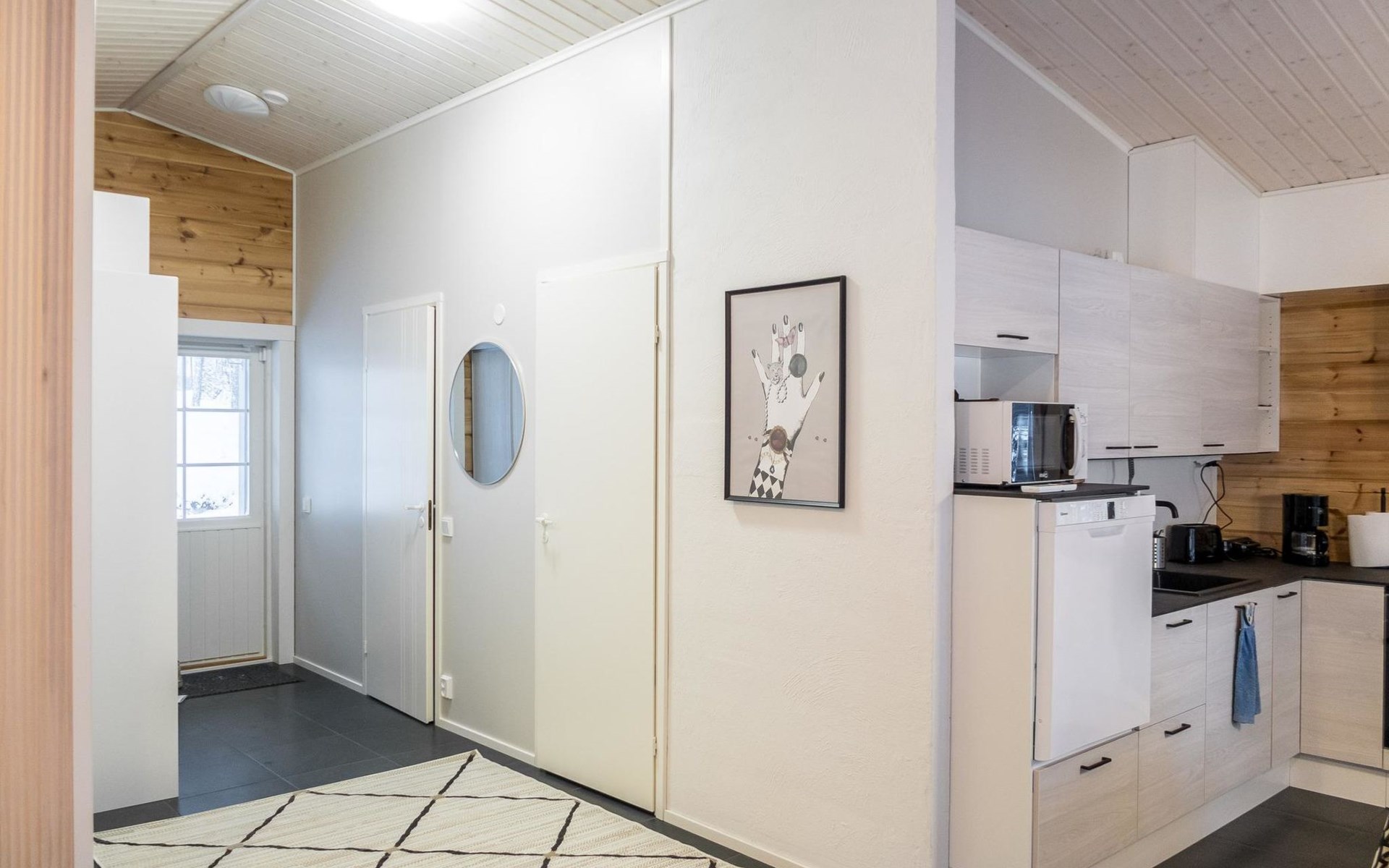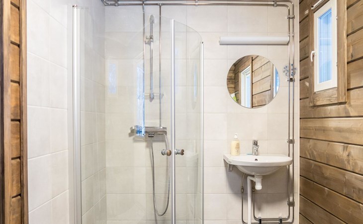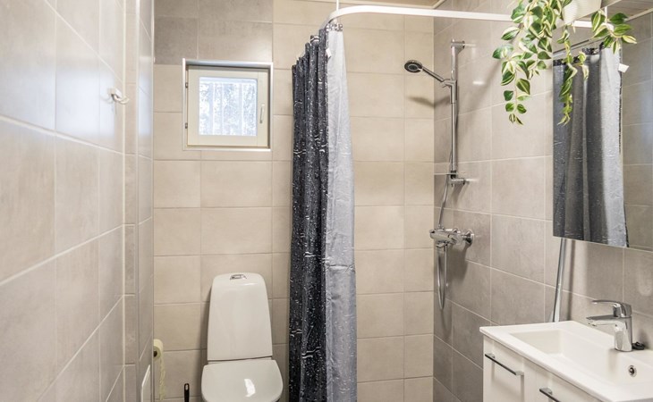 The area of the main house is 62 m², with a spacious kitchen/living room with large windows overlooking the lake and the forest landscape. Dining set for 6 in the kitchen. Two separate bedrooms, one with a double bed and wardrobes. In the second bedroom, separate beds for 2. The living room has a sofa bed for 1-2 guests. Shower/toilet, washing machine and drying rack in the washroom. Entrance hall with wardrobes, access from the back to a large terrace with garden furniture and a grill available in the summer. In the main cabin, underfloor heating, air-to-air heat pump and ventilation unit.