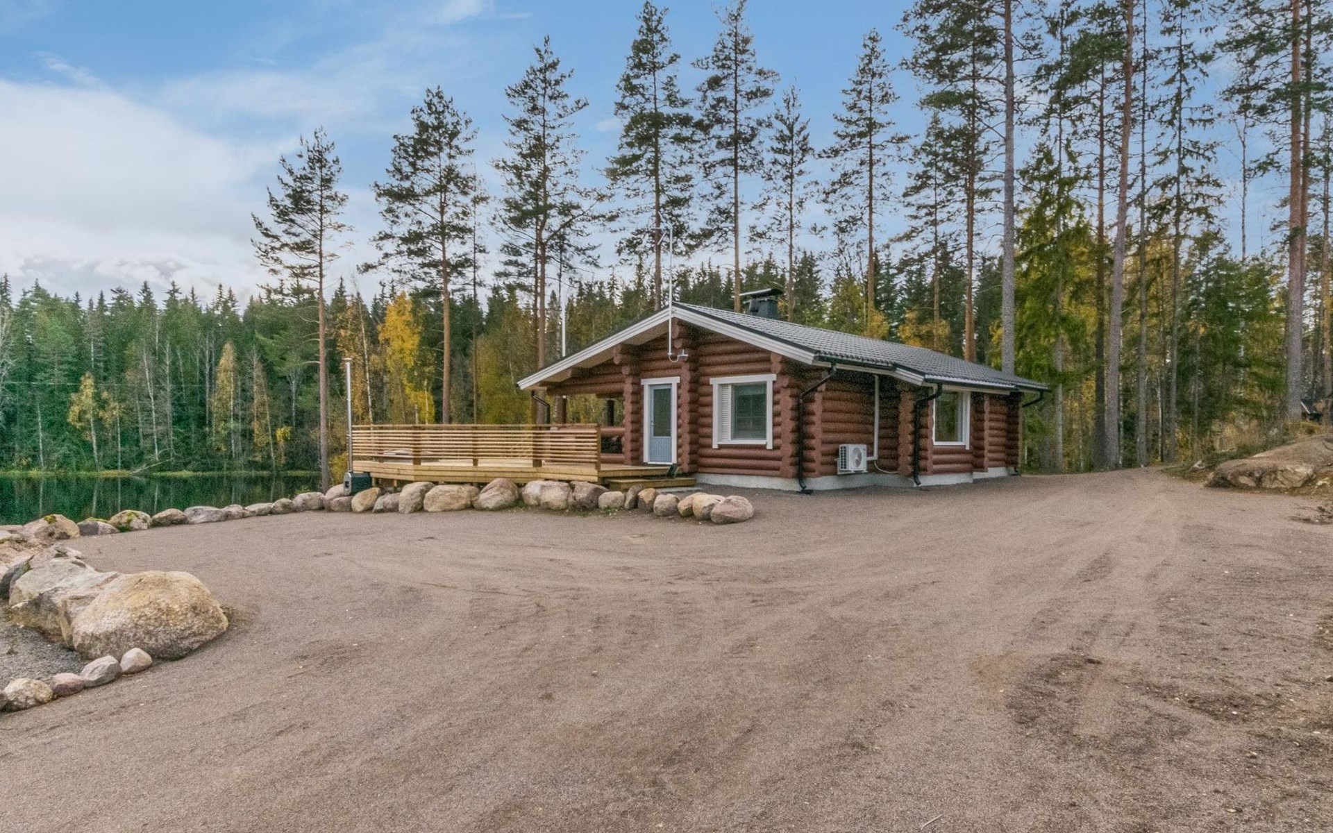 25 km to the east from Kouvola, Väliväylä Canoeing Route 15 m, gently deepening sand beach, rowing boat, and a pier. Round log cabin, built in 1998 and renovated in 2023, features a living room/kitchen, a bedroom with a double bed, another bedroom with a single bed and a bunk bed, a bathroom with a shower and WC, and a wood-burning sauna.