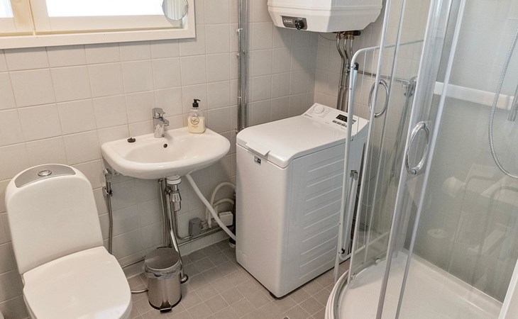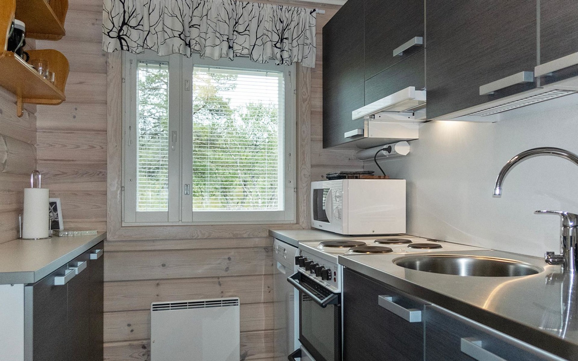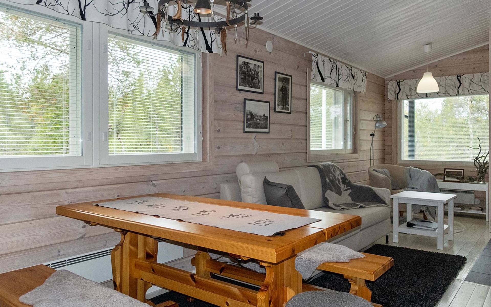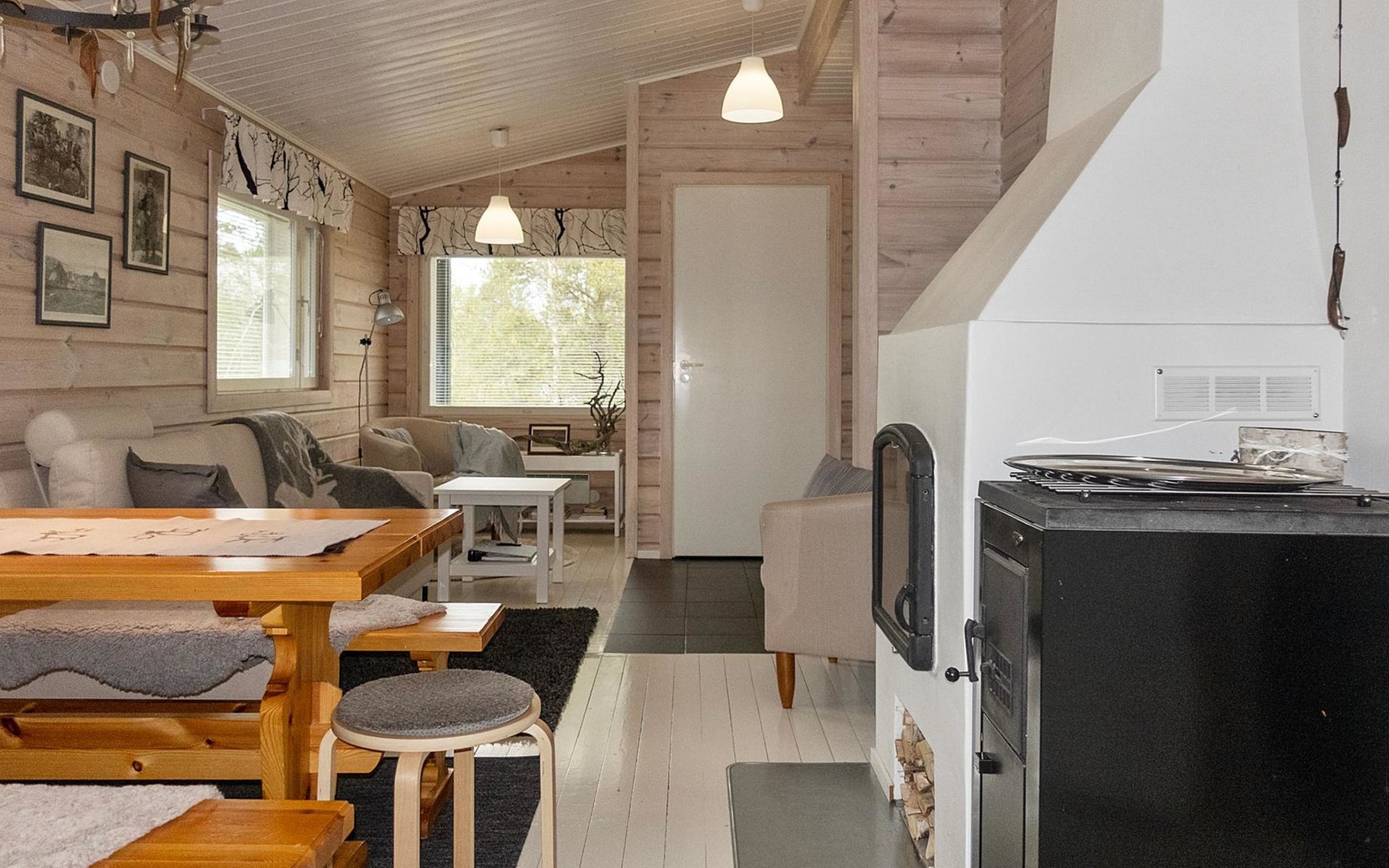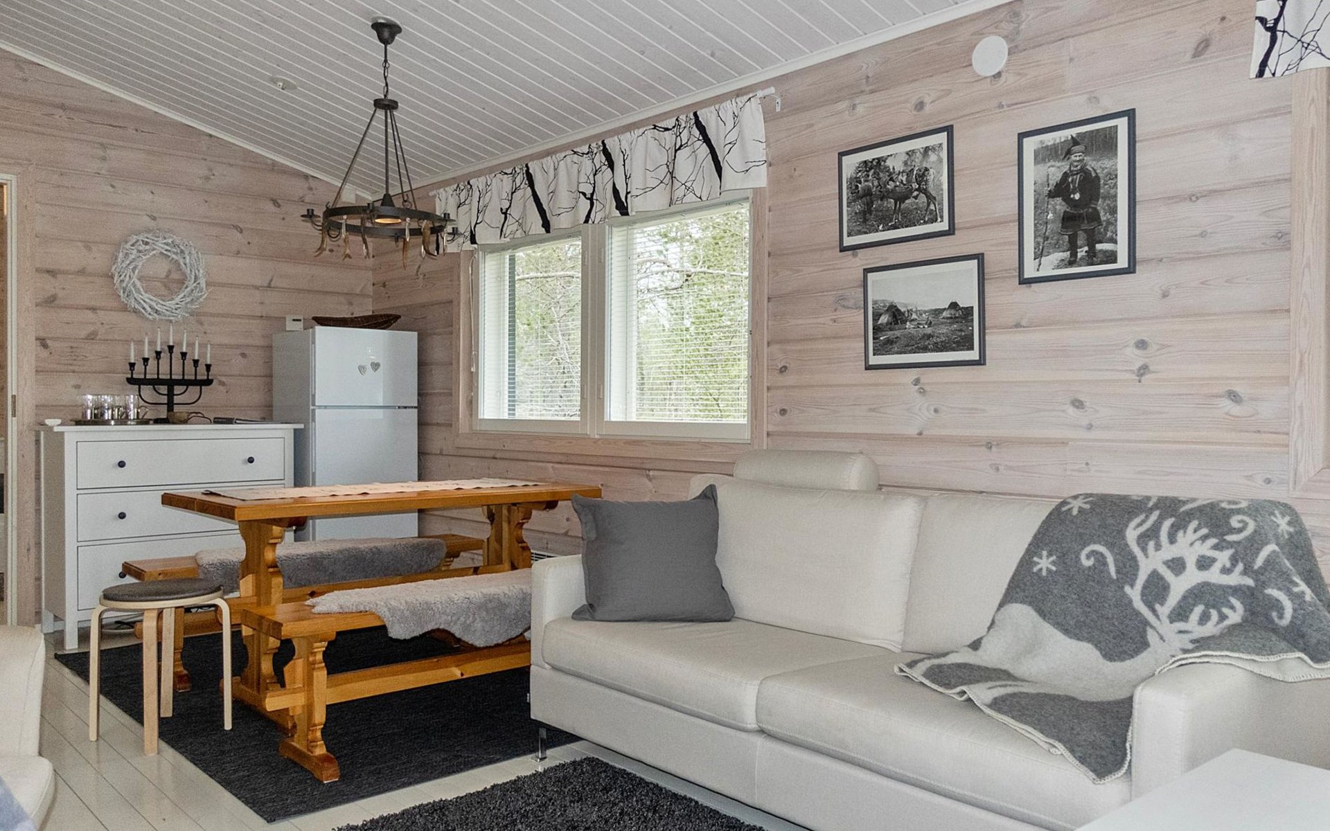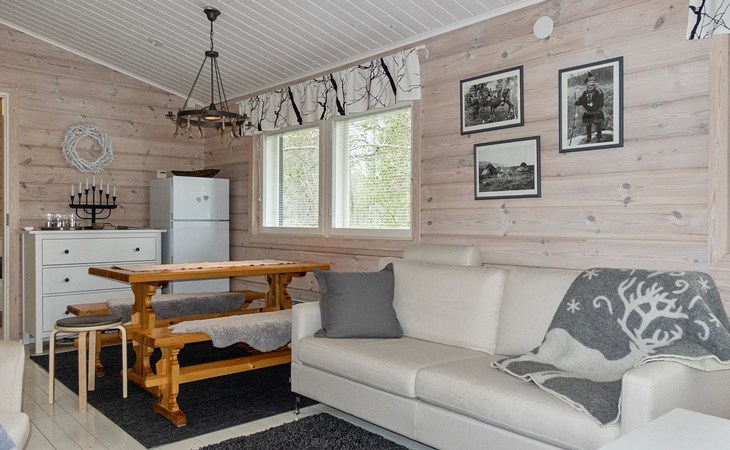 Pursu features 3 rooms and a kitchen. The main bedroom has a 160 cm double bed, the adjacent room has a sofa bed (160 cm) and a TV. The living room includes a sofa and a dining table. The kitchen is equipped with amenities such as a dishwasher. In addition, there is a sauna, a bathroom with WC, and a dressing room.
