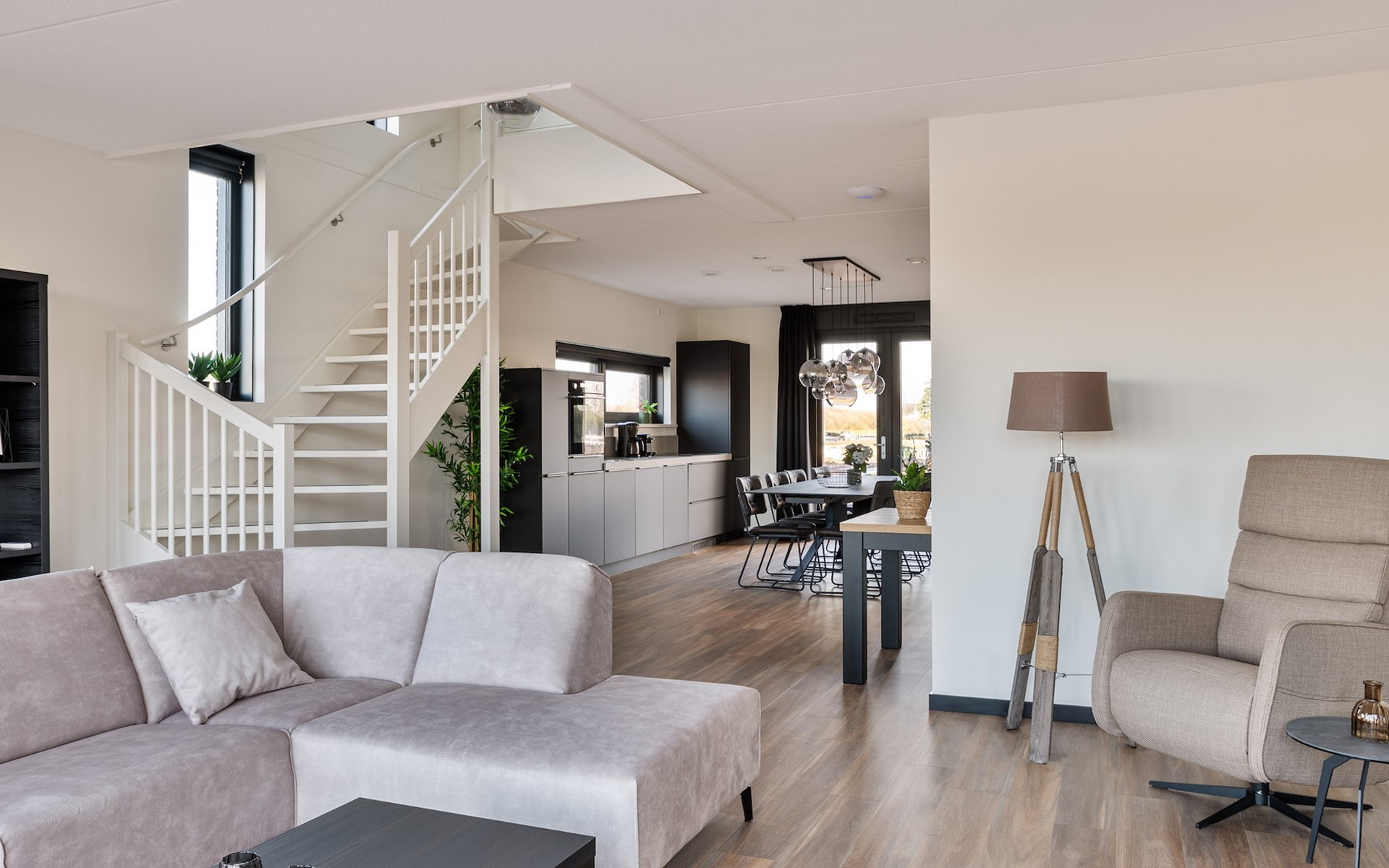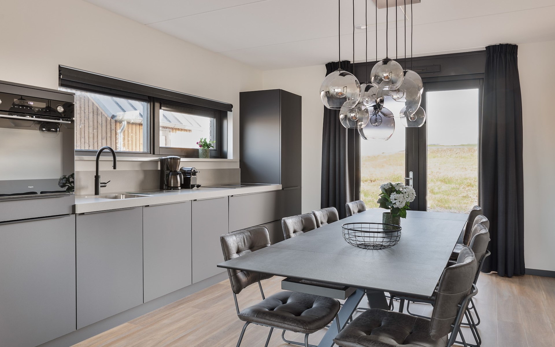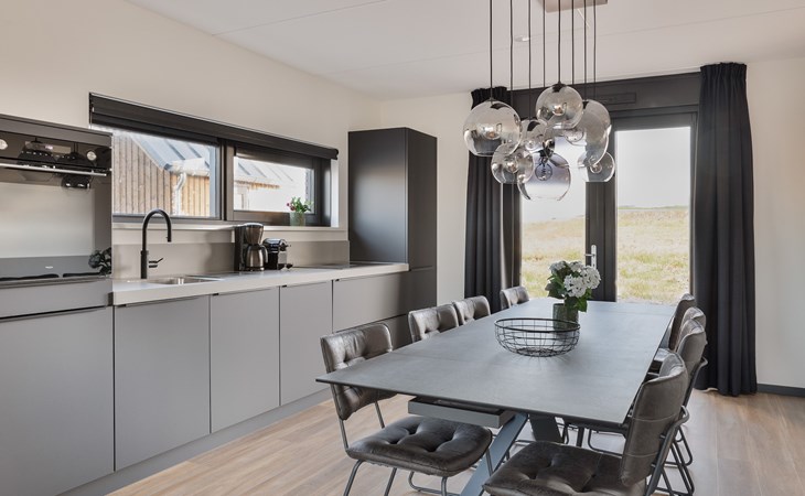 Das Wohnzimmer ist mit einer Sitzecke mit Smart-TV und einer Soundbar ausgestattet. Die angrenzende offene Küche mit Essecke ist u.a. mit einem Wasserhahn für heißes Wasser, einer Kühl-Gefrierkombination, einer Geschirrspülmaschine, einer Nespresso-Maschine, einer Filterkaffeemaschine und einer Kombimikrowelle ausgestattet.