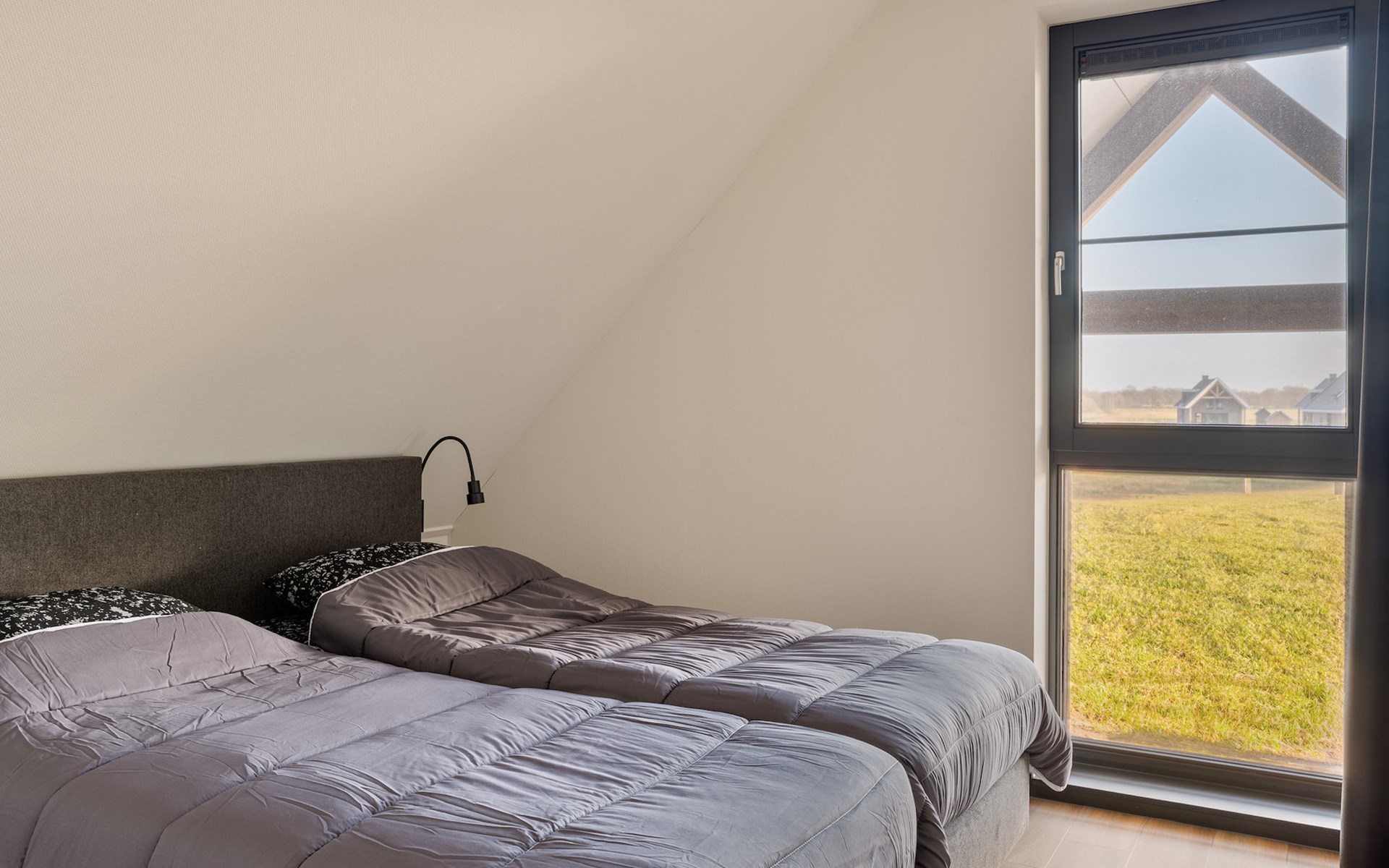 In der ersten Etage befinden sich 3 Schlafzimmer je 2 Einzel-Boxspringbetten und einem TV. Eines dieser Schlafzimmer verfügt über ein En-Suite-Bad mit begehbarer Dusche, Doppelwaschbecken und Toilette. Außerdem gibt es ein großes Badezimmer mit Badewanne, begehbarer Dusche, Doppelwaschbecken und Toilette. In der ersten Etage gibt es auch eine separate Toilette.