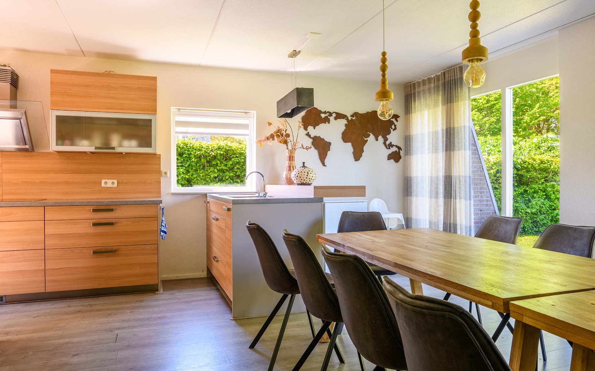 Das Wohnzimmer ist mit einer Sitzecke und einem Fernseher ausgestattet. Der Bungalow verfügt über eine offene Küche mit Essecke. Die Küche ist u.a. mit einer Kühl-Gefrierkombination, einer Senseo-Kaffeemaschine, einem Backofen, einer Kombimikrowelle und einer Geschirrspülmaschine ausgestattet.