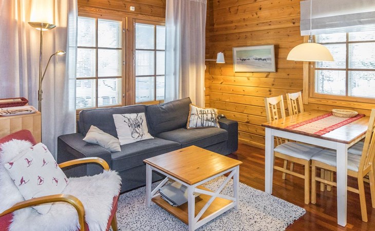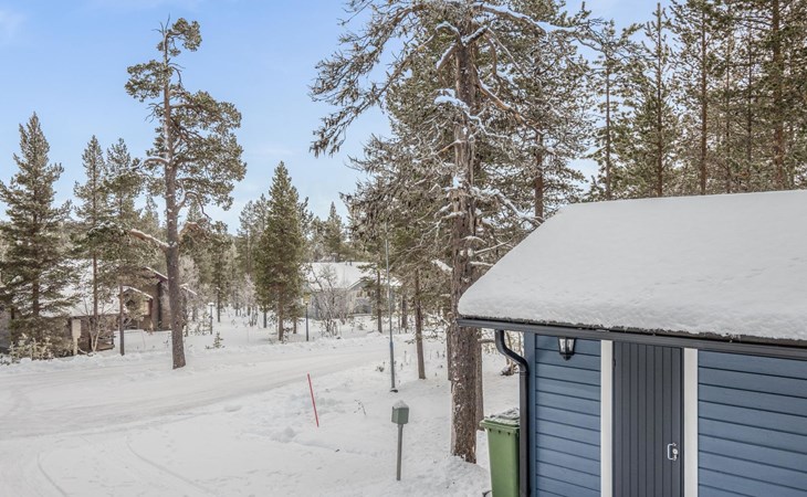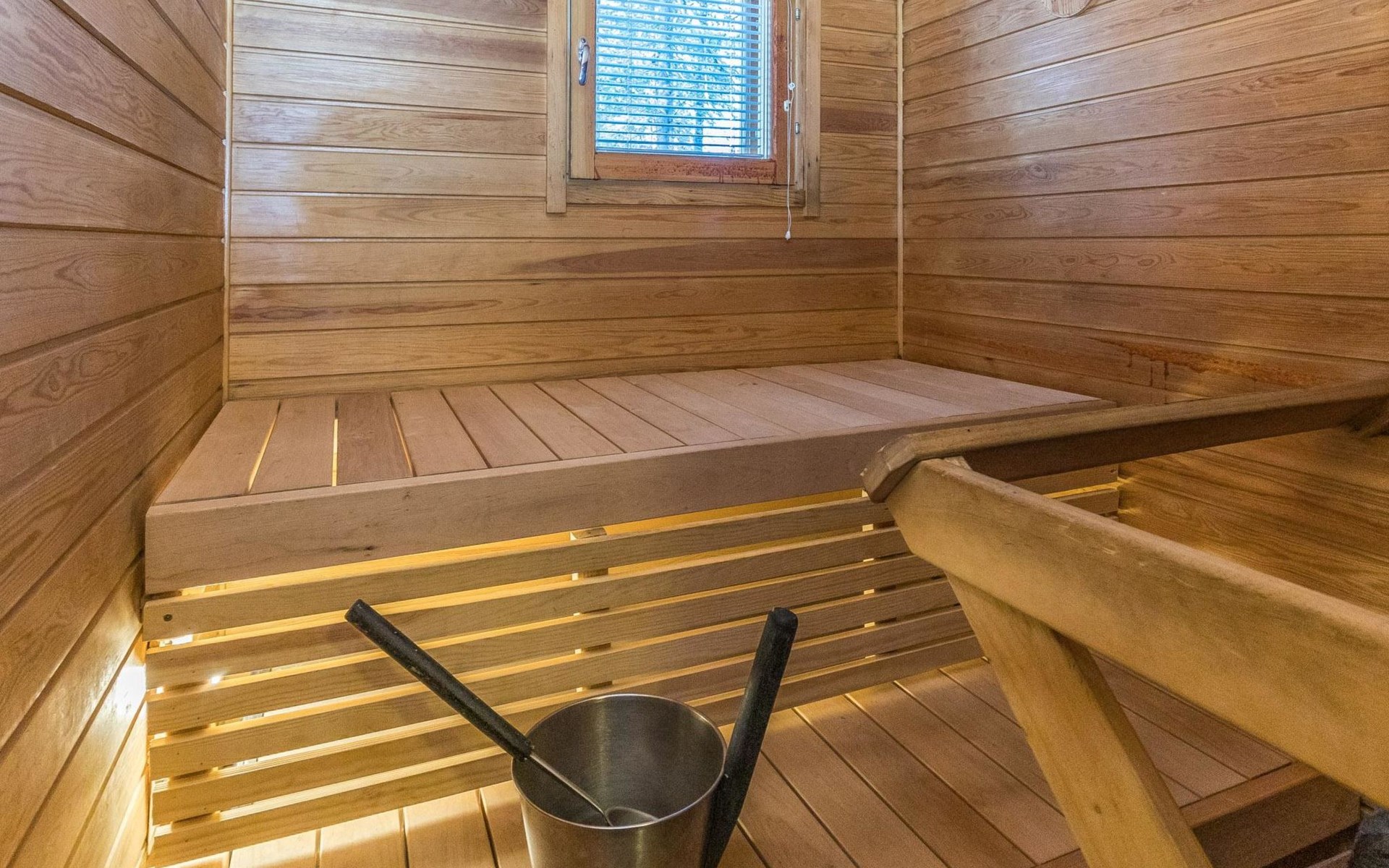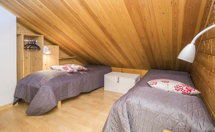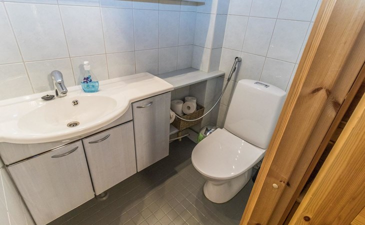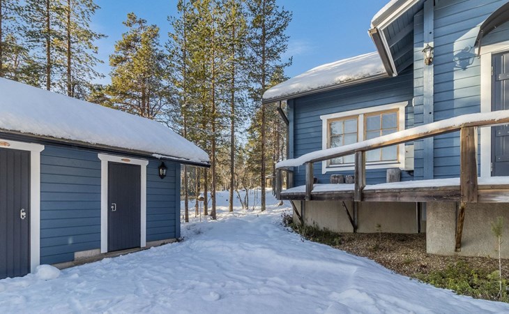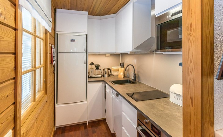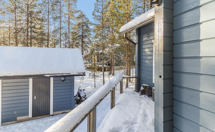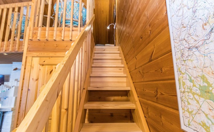 The 42-square-meter apartment has a kitchen/living room, a bedroom, a loft, a bathroom, a sauna, a toilet and a terrace. There is a ski storage room with a lubrication table in the storage.