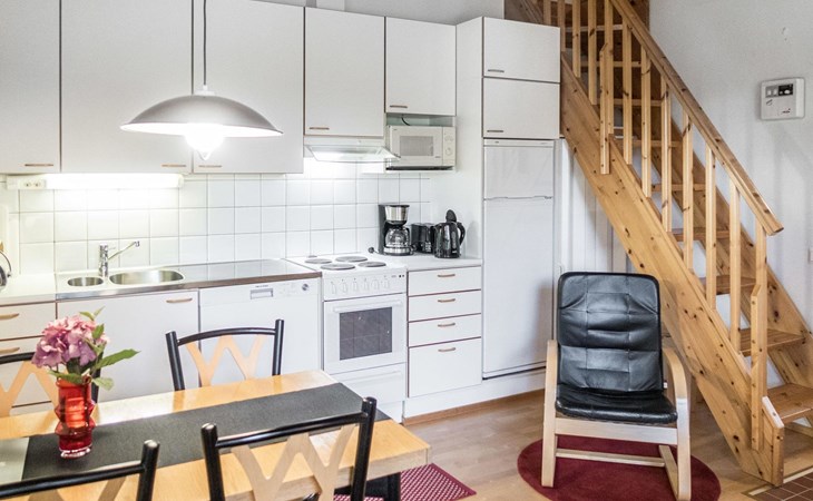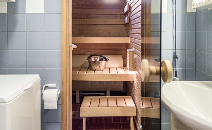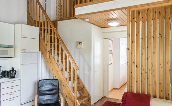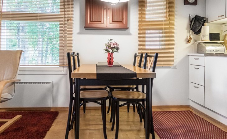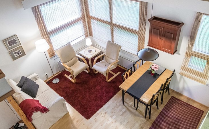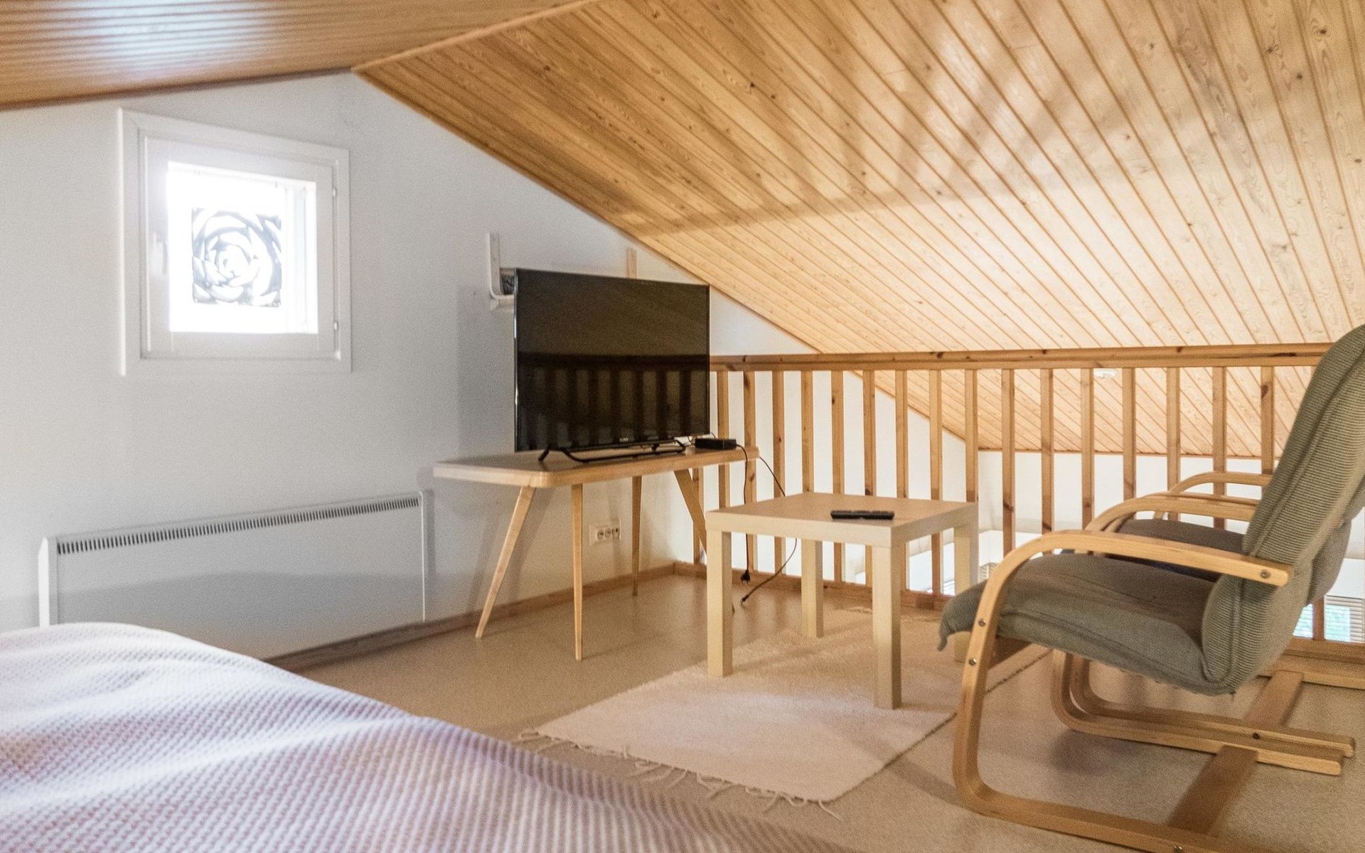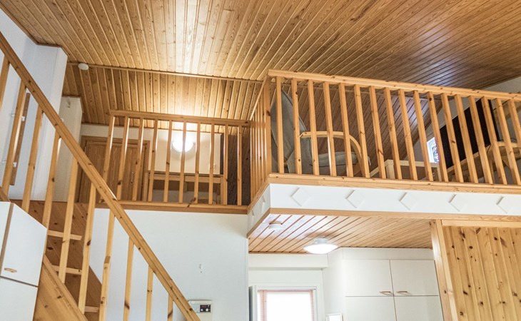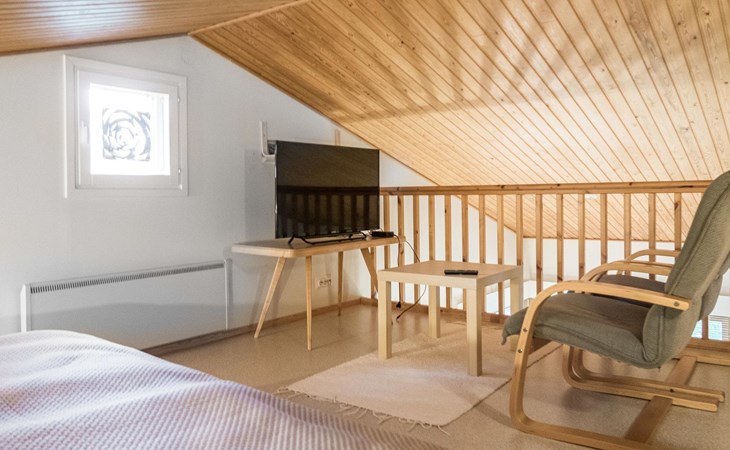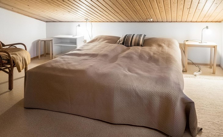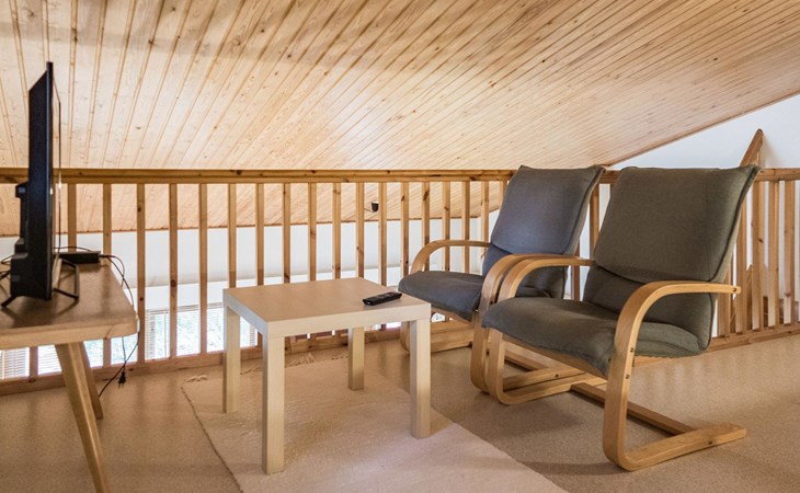 Living area: 36 m² + loft, kitchen/living room, dinning for 4 persons, bedroom with double bed. Open loft with two separate beds + 1 mattress (for child). Sauna (electric), shower/wc.